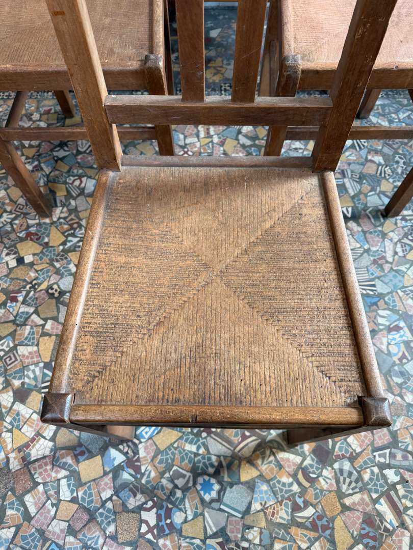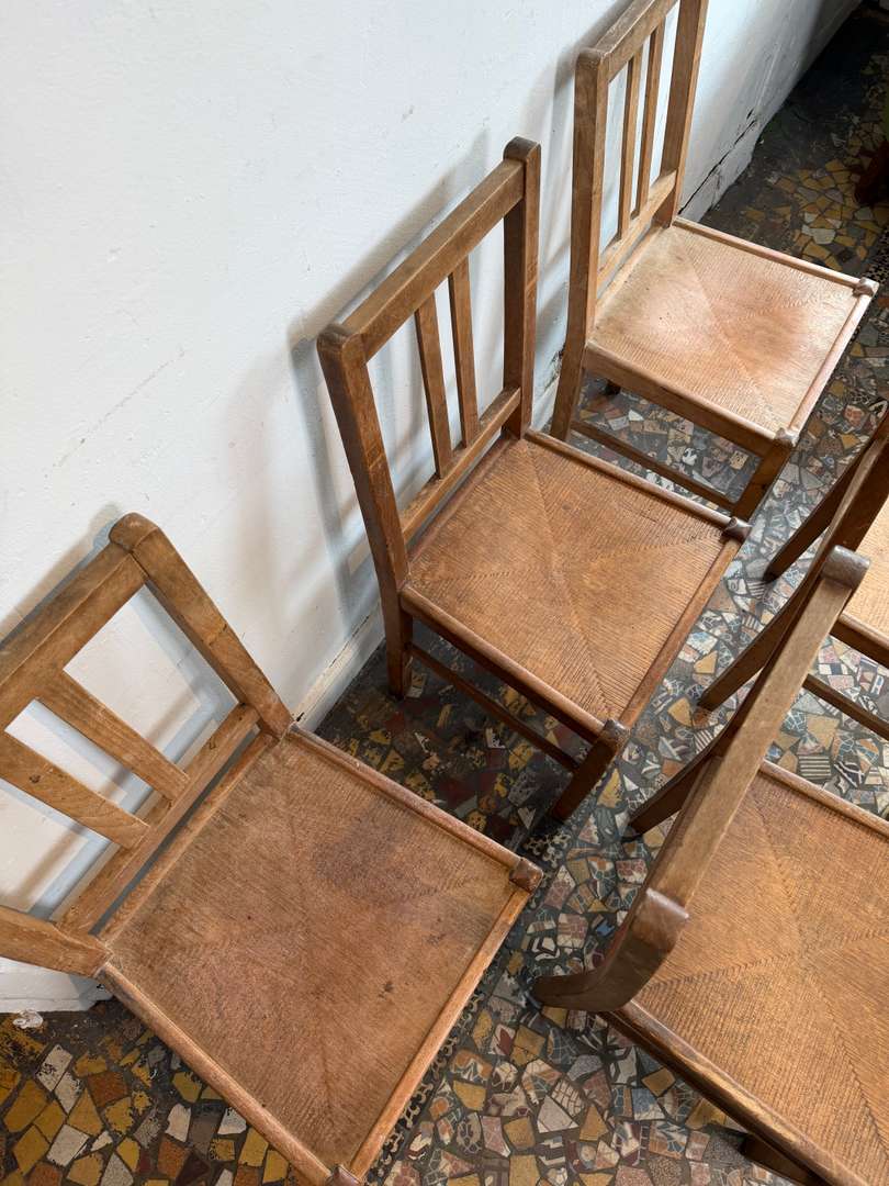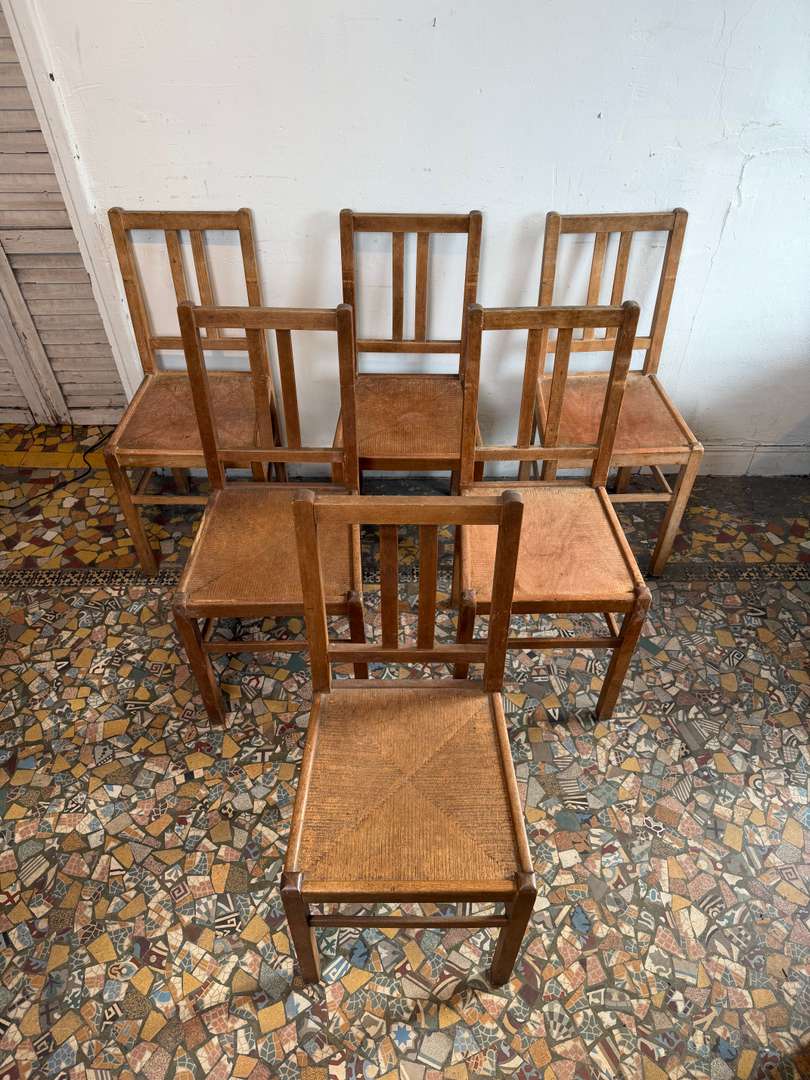 Bel ensemble de chaises bistrot en bois, au charme authentique et à la patine du temps. À noter : deux assises sont légèrement fragilisées mais restent fonctionnelles. Parfaites autour d’une grande table ou dans un esprit café / maison de famille.