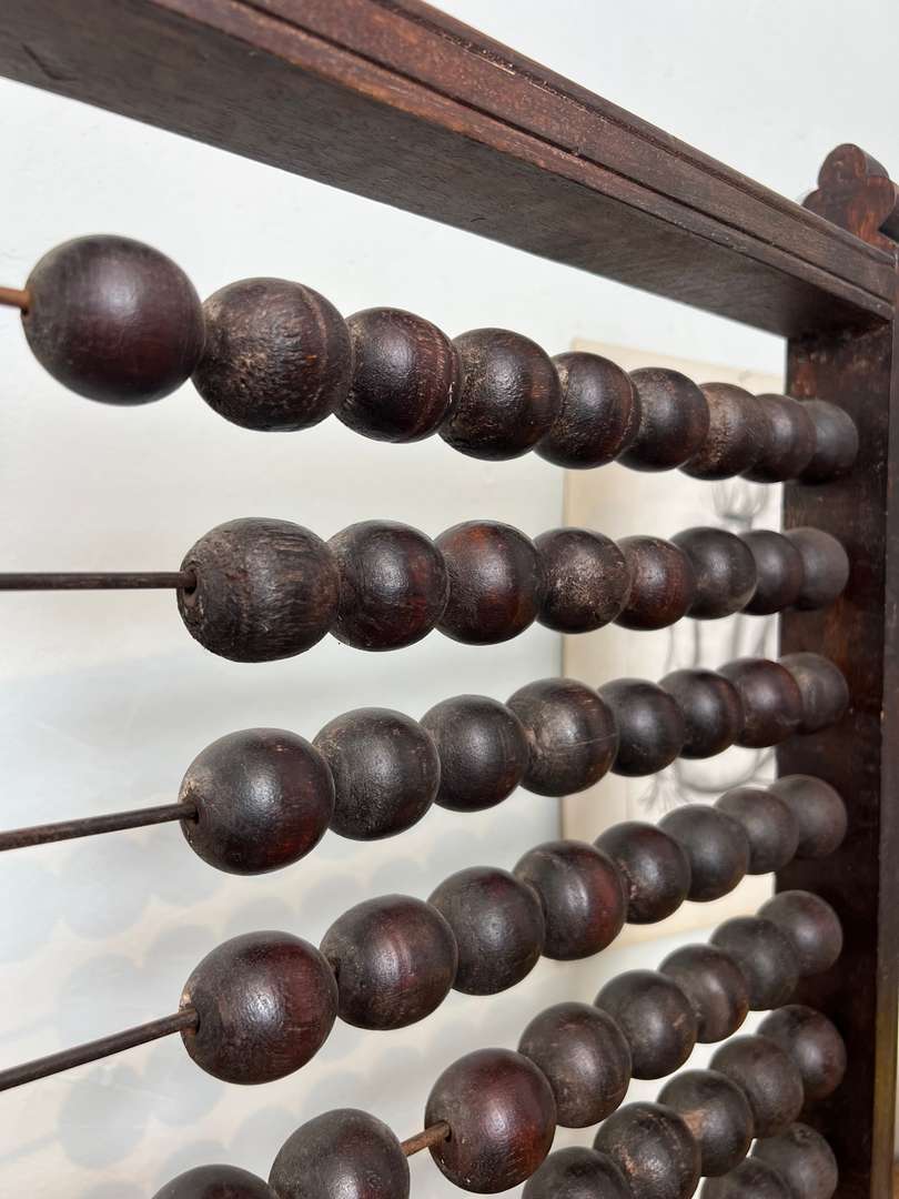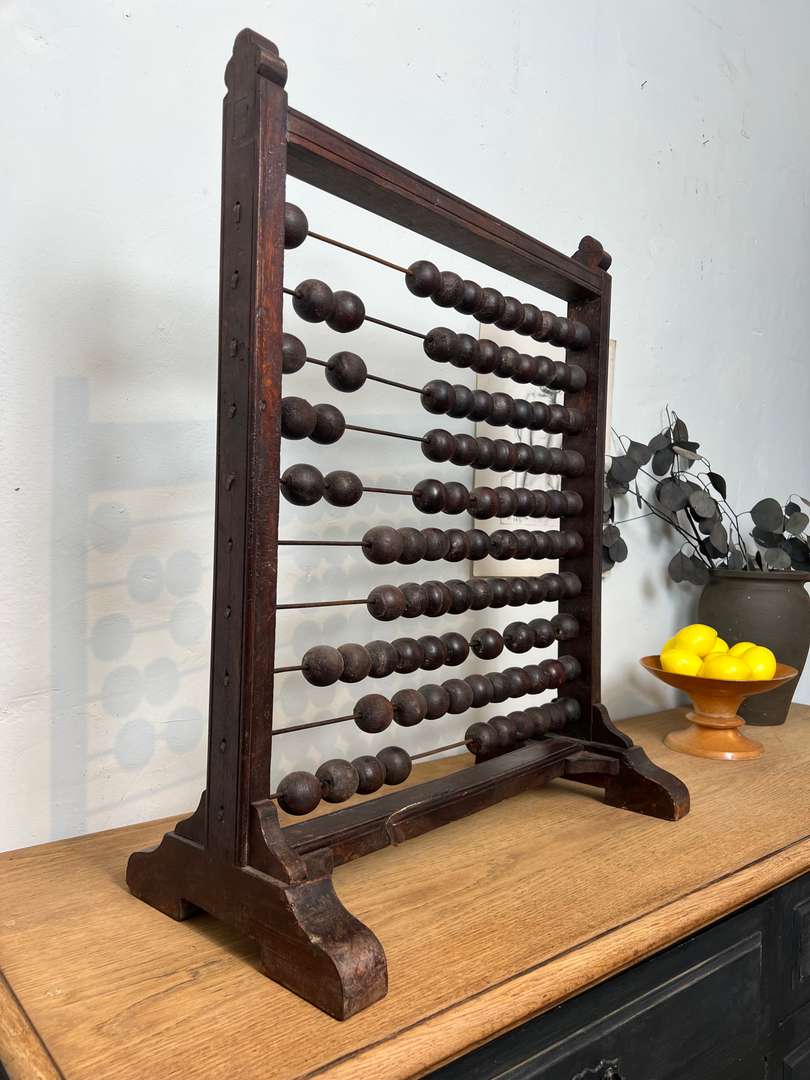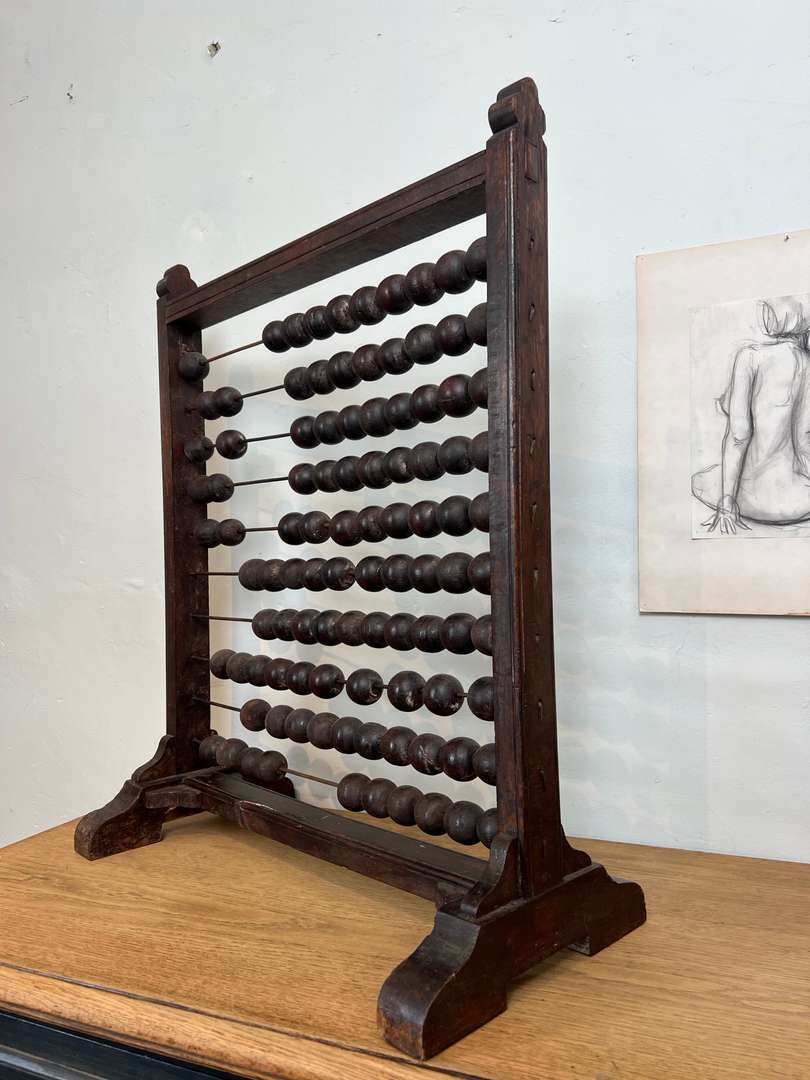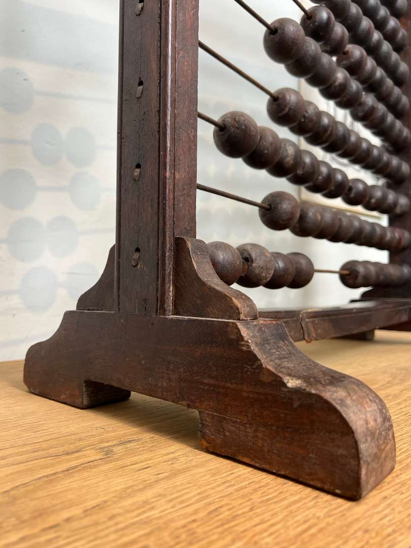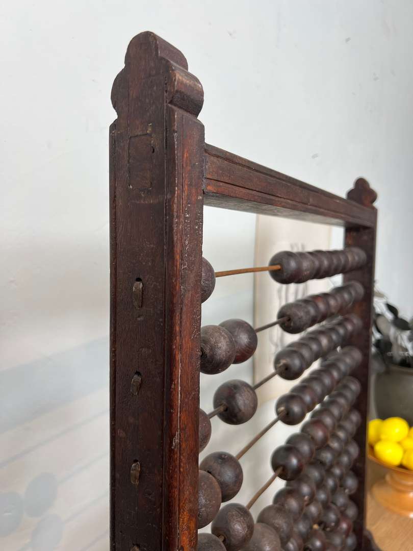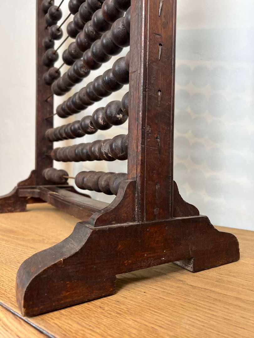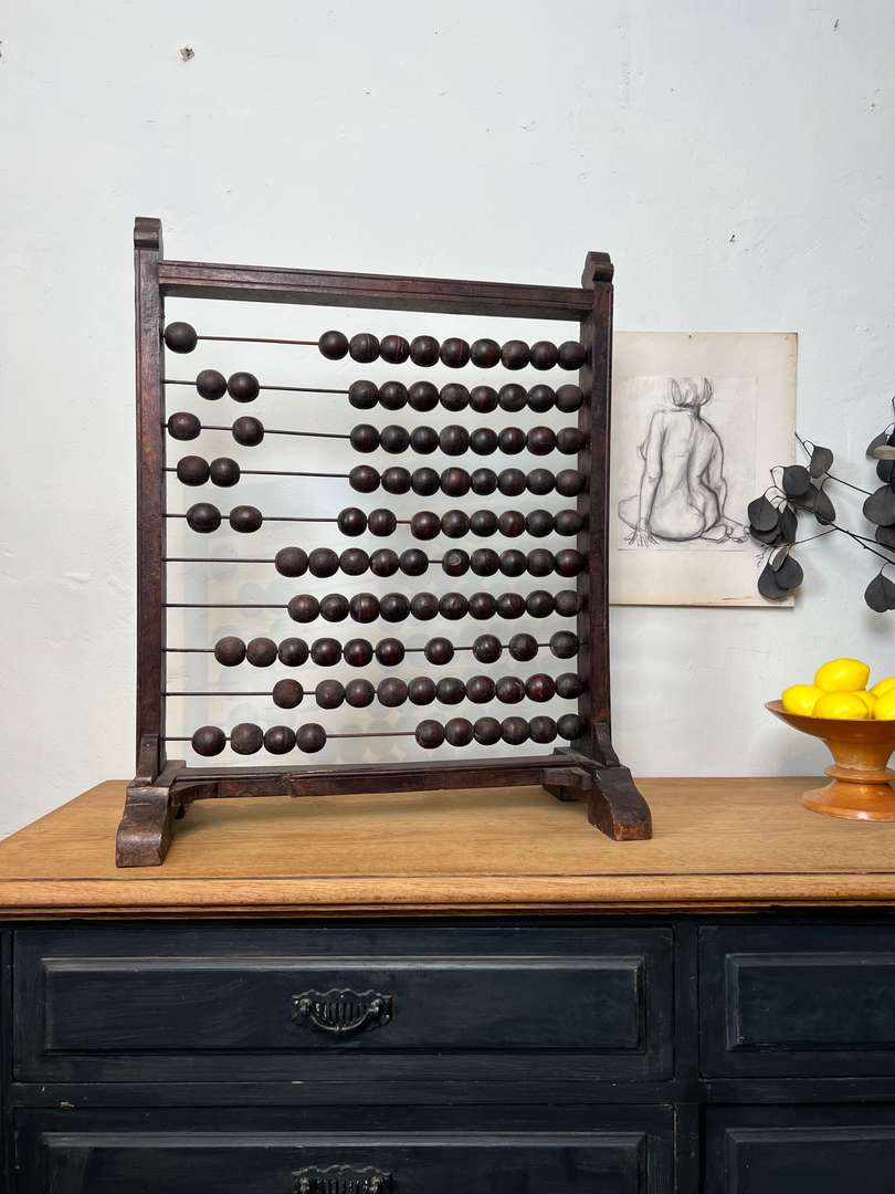 Ancien boulier en bois tourné, début XXe siècle. Ses perles sombres en bois patiné glissent sur des tiges métalliques, dans une belle structure sculptée aux assemblages visibles. Un objet authentique chargé d’histoire, parfait en décoration sur un bureau ou une étagère.