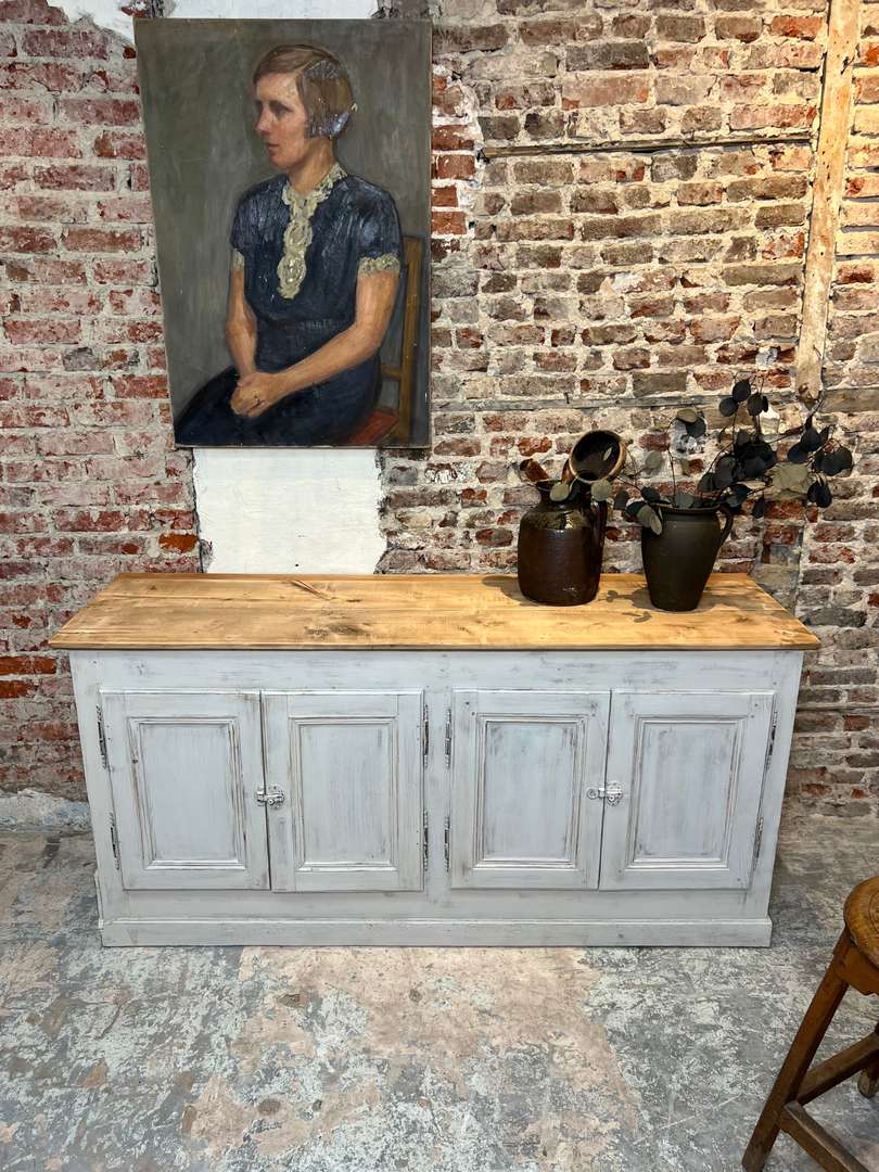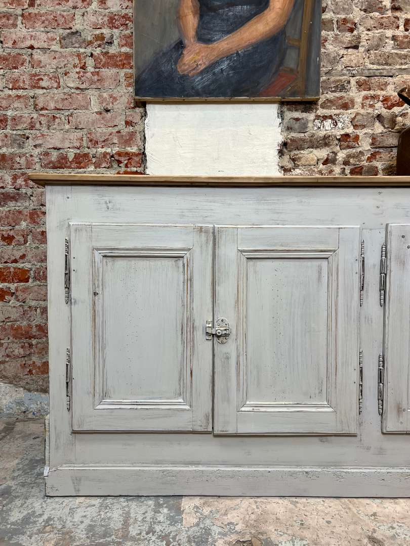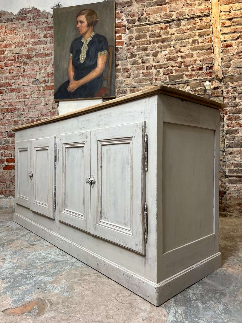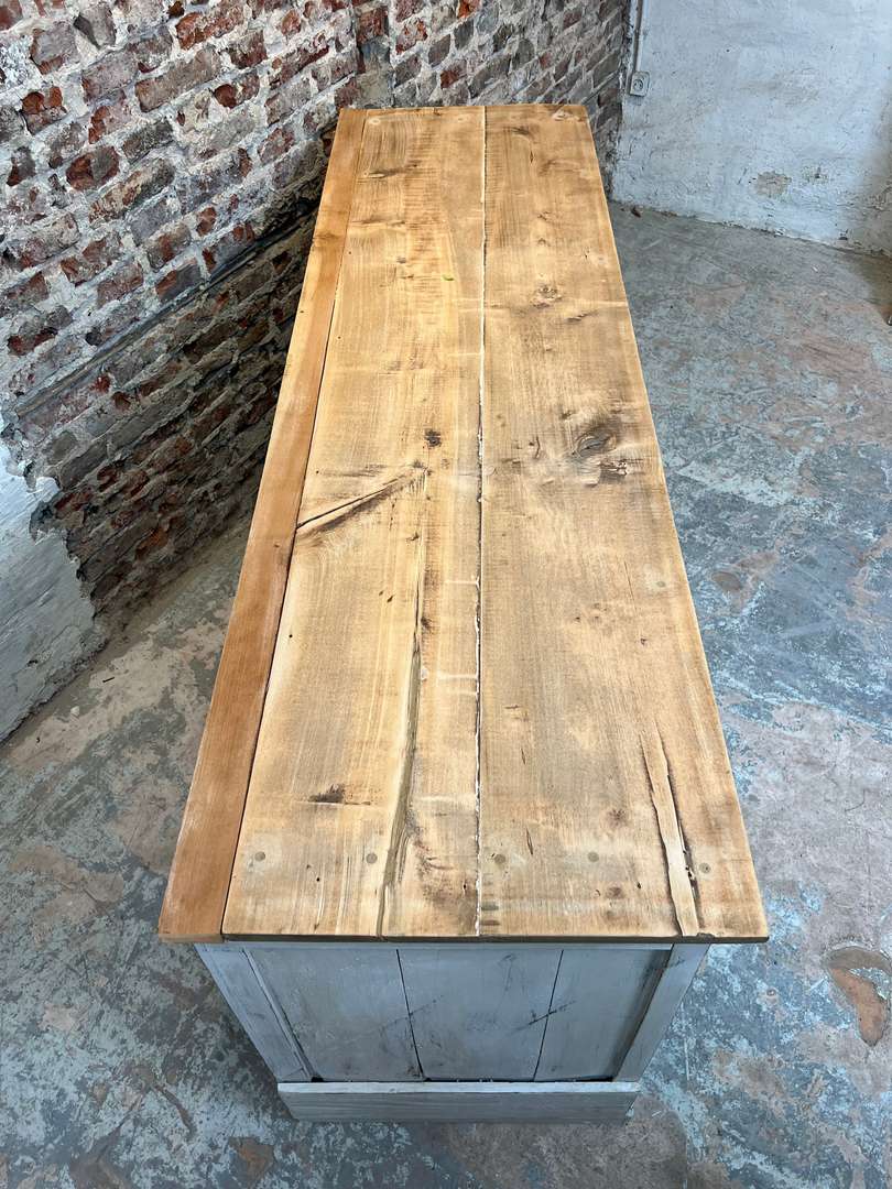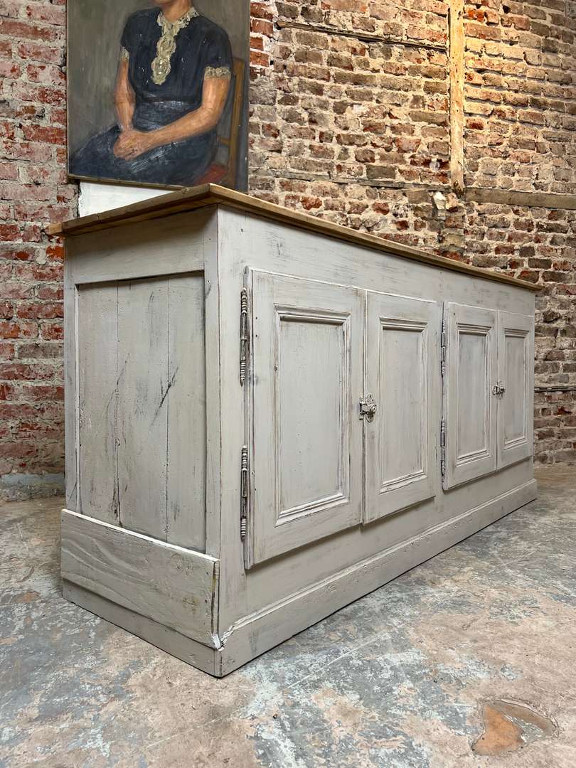 Ancien buffet datant du XIXᵉ siècle, réalisé en noyer avec un plateau en sapin brut. Il a été peint dans une teinte gris clair. Un meuble authentique et pratique, parfait pour une salle à manger ou une grande entrée.