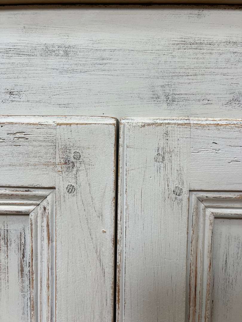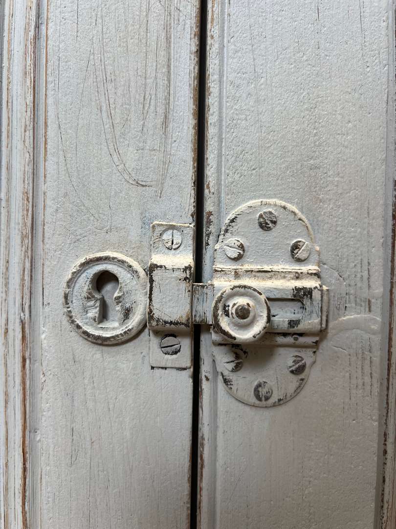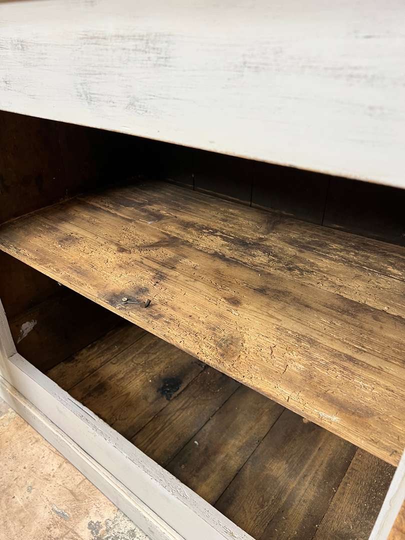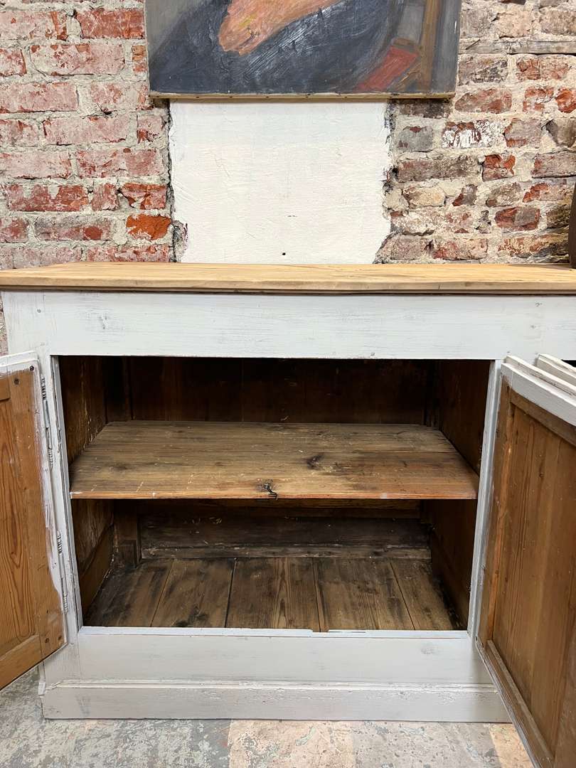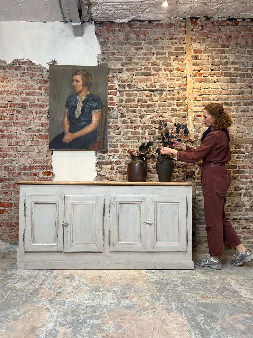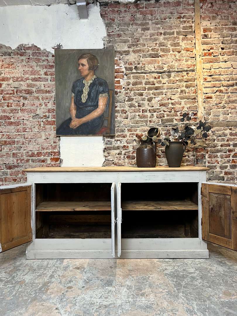 Ancien buffet datant du XIXᵉ siècle, réalisé en noyer avec un plateau en sapin brut. Il a été peint dans une teinte gris clair. Un meuble authentique et pratique, parfait pour une salle à manger ou une grande entrée.