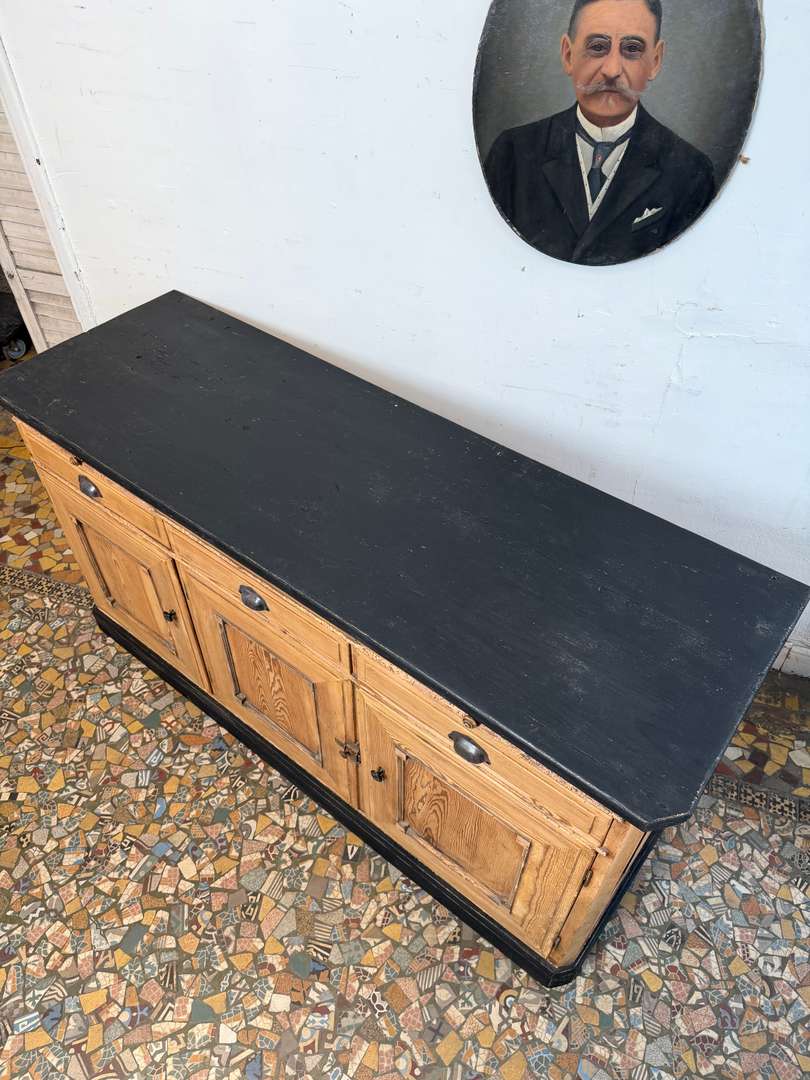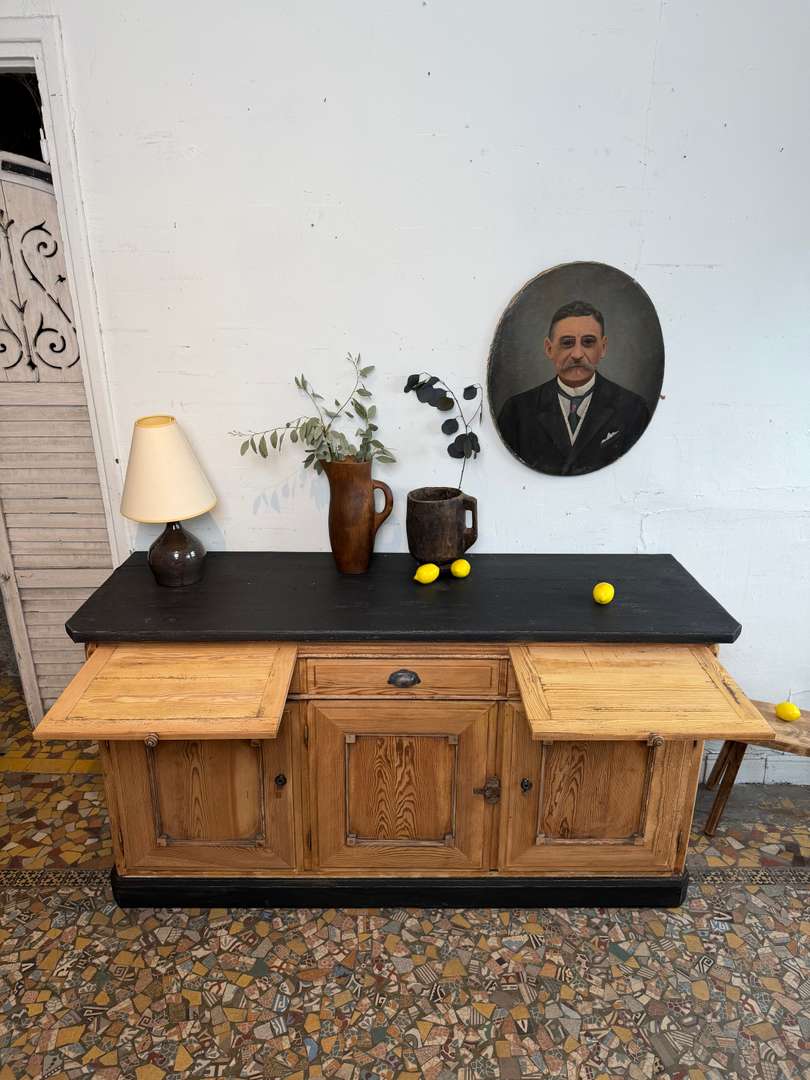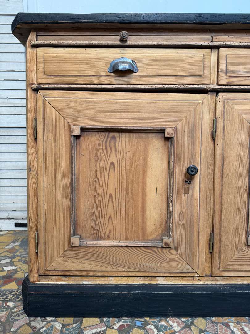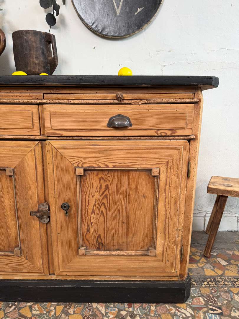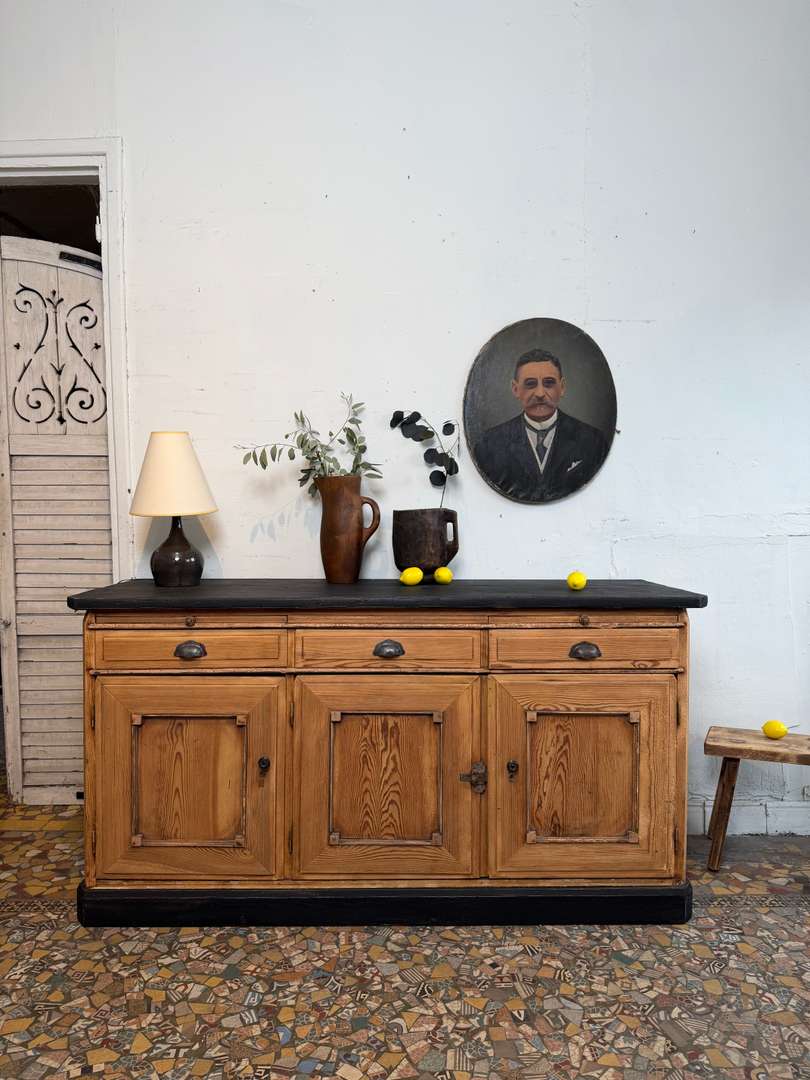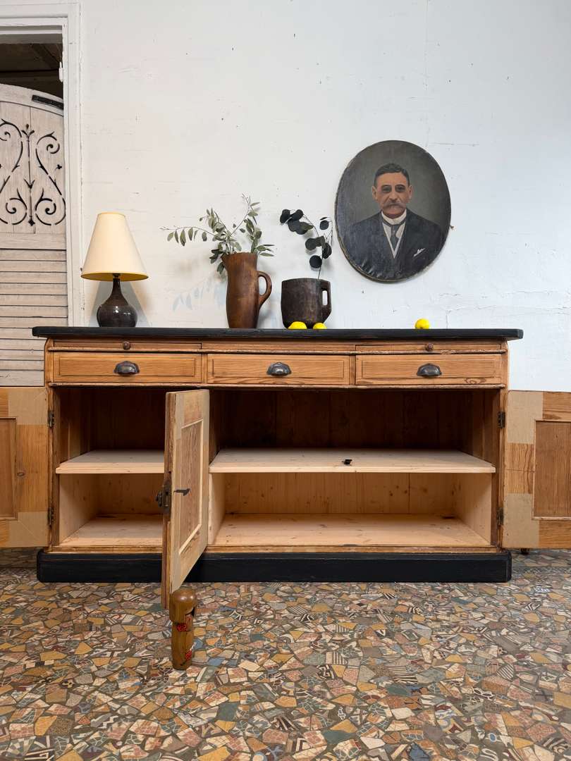 Ancien buffet rustique en sapin datant du XIXe siècle. Le meuble a conservé tout son caractère. L’intérieur a été restauré plus tardivement. Le bois présente des piqûres liées à son âge et a été entièrement traité. Le plateau et la plinthe ont été peints en noir. Le buffet dispose de deux tablettes rétractables. Il est également composé de trois tiroirs. Les portes ferment, mais pas à clé. Deux portes se ferment à l’aide d’un verrou. Meuble sain, fonctionnel et plein de charme.