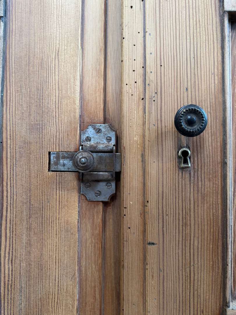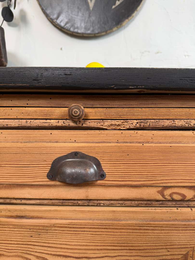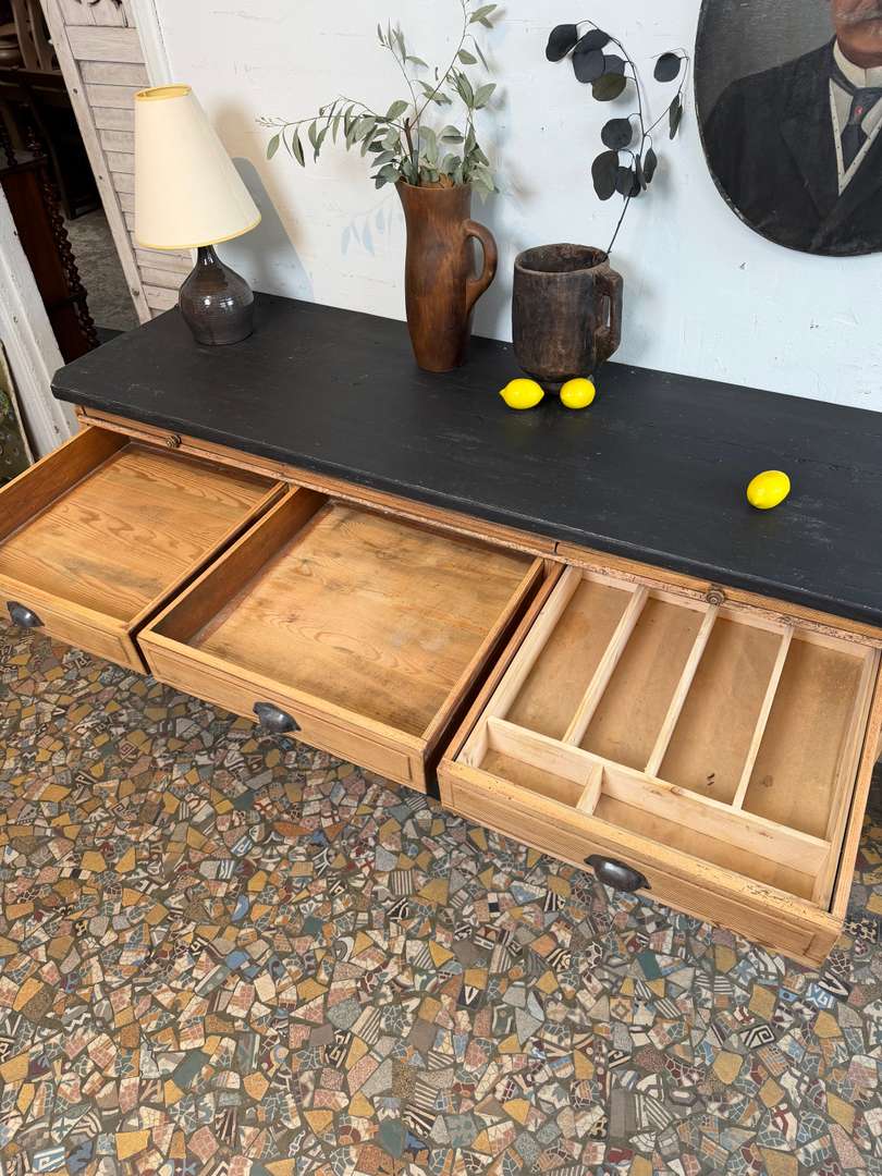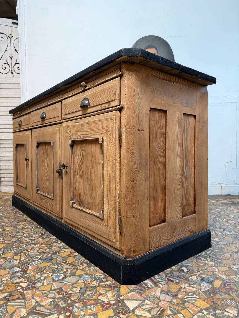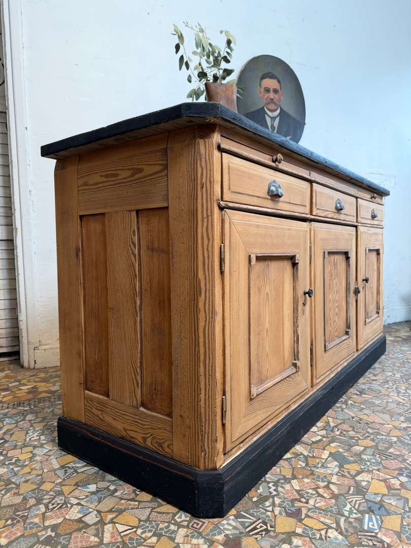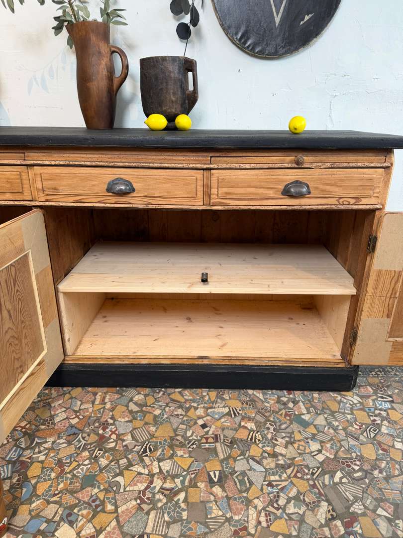 Ancien buffet rustique en sapin datant du XIXe siècle. Le meuble a conservé tout son caractère. L’intérieur a été restauré plus tardivement. Le bois présente des piqûres liées à son âge et a été entièrement traité. Le plateau et la plinthe ont été peints en noir. Le buffet dispose de deux tablettes rétractables. Il est également composé de trois tiroirs. Les portes ferment, mais pas à clé. Deux portes se ferment à l’aide d’un verrou. Meuble sain, fonctionnel et plein de charme.