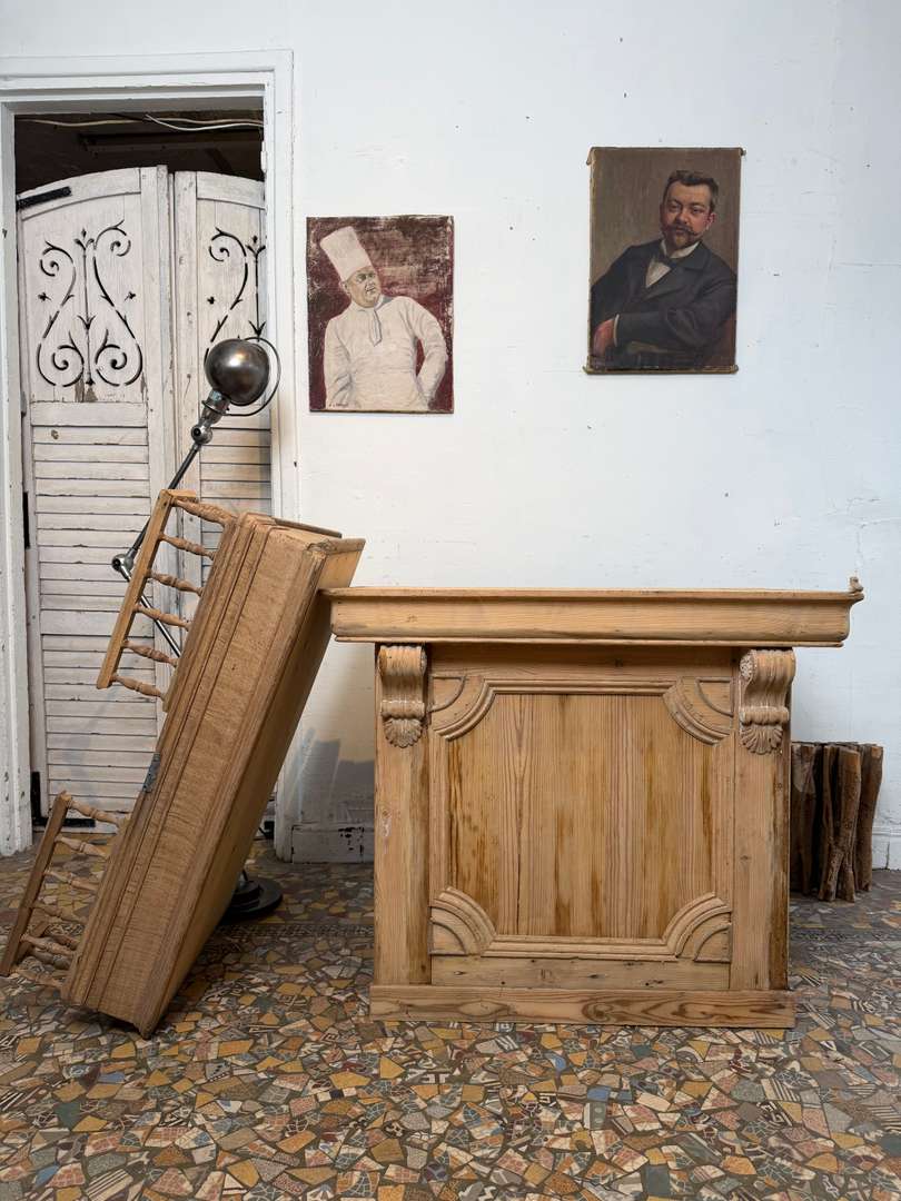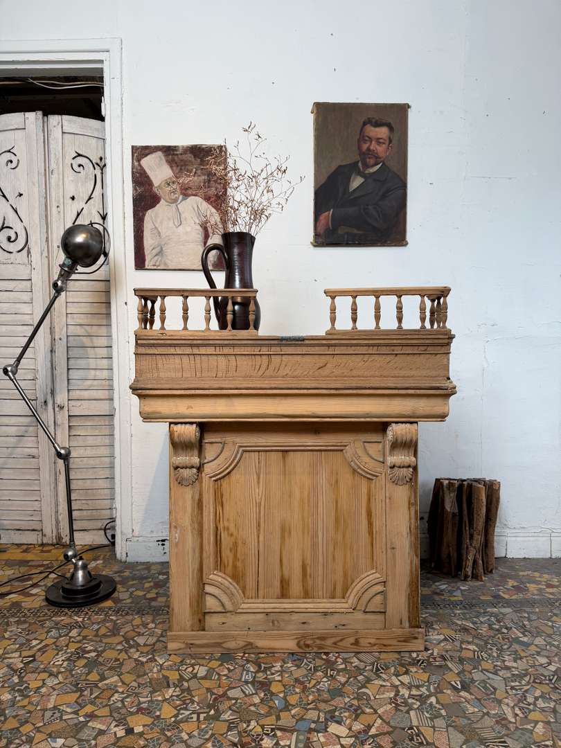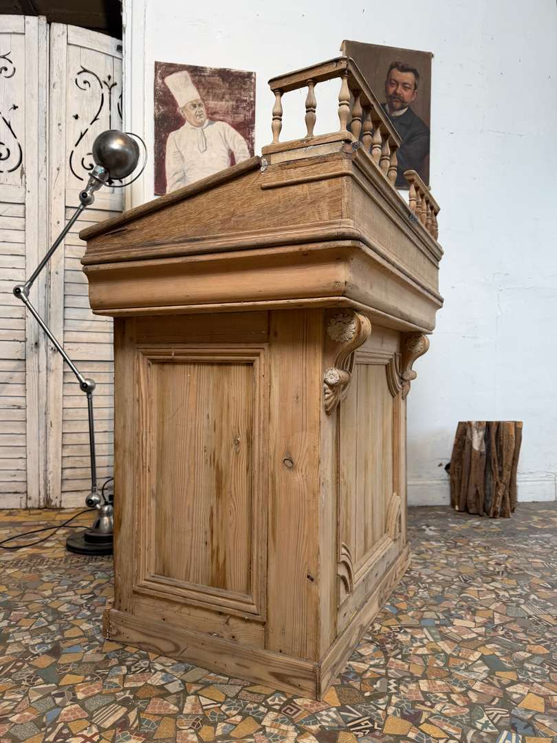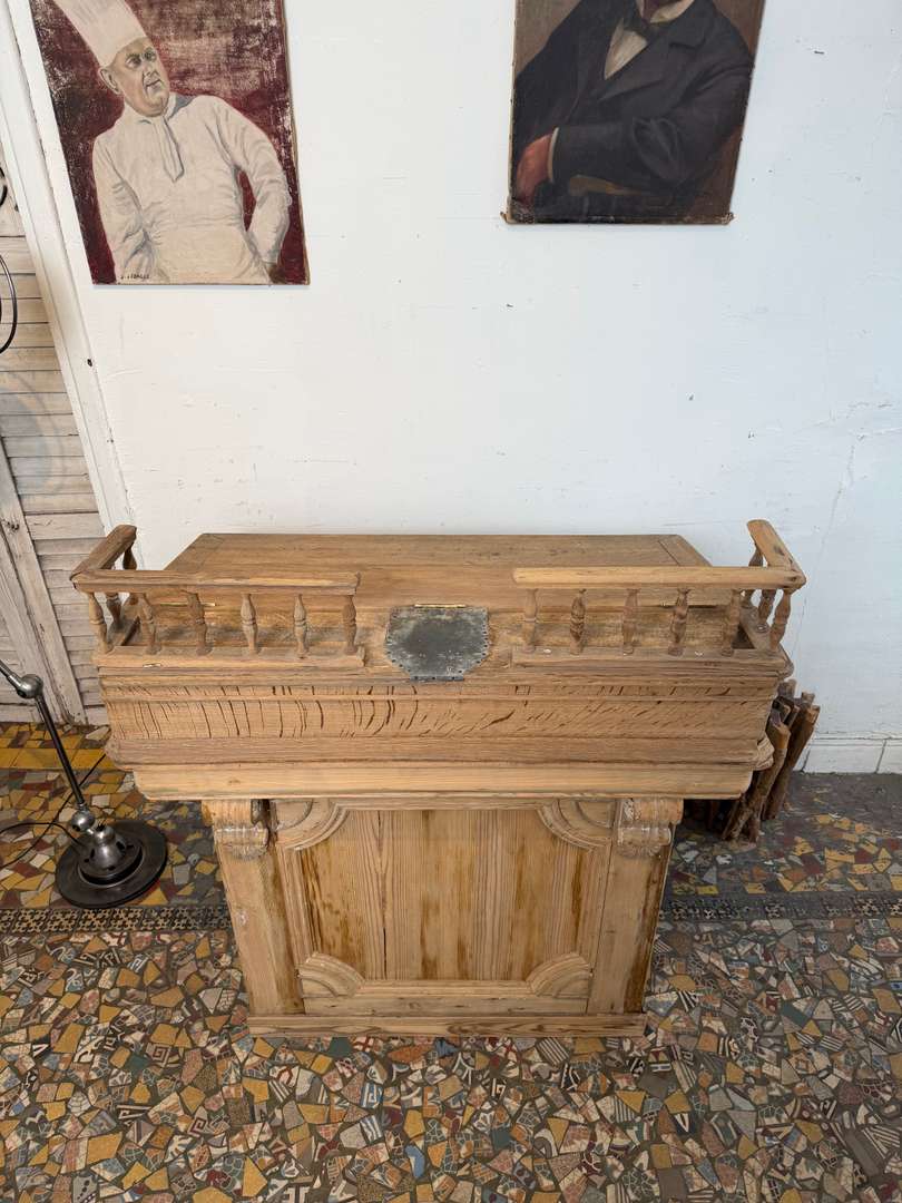 En sapin et chêne, ce comptoir est composé de deux parties et peut être utilisé avec ou sans la partie haute. Pupitre écritoire avec plaque en zinc pour déposer la monnaie, tiroir et étagère à l’arrière. Idéal pour un commerce ou un espace d’accueil.