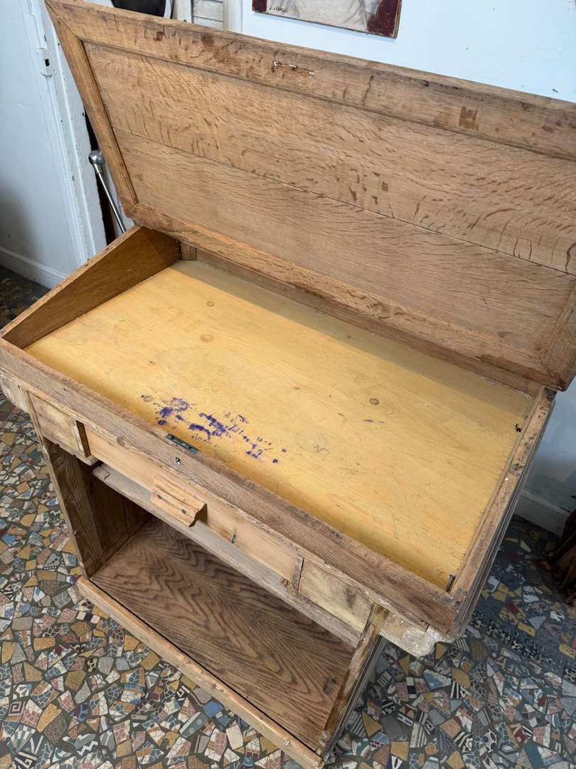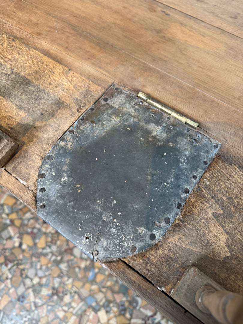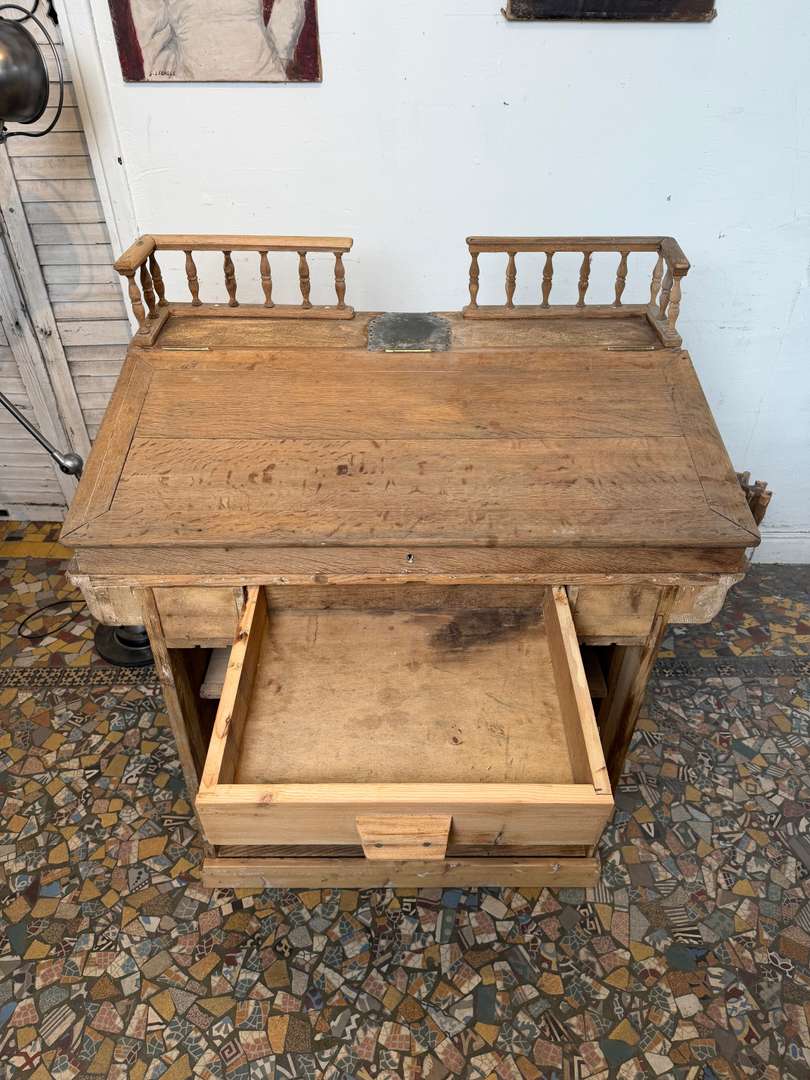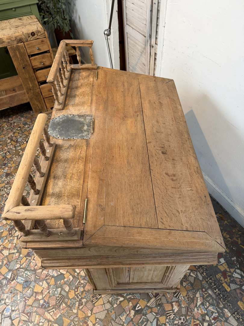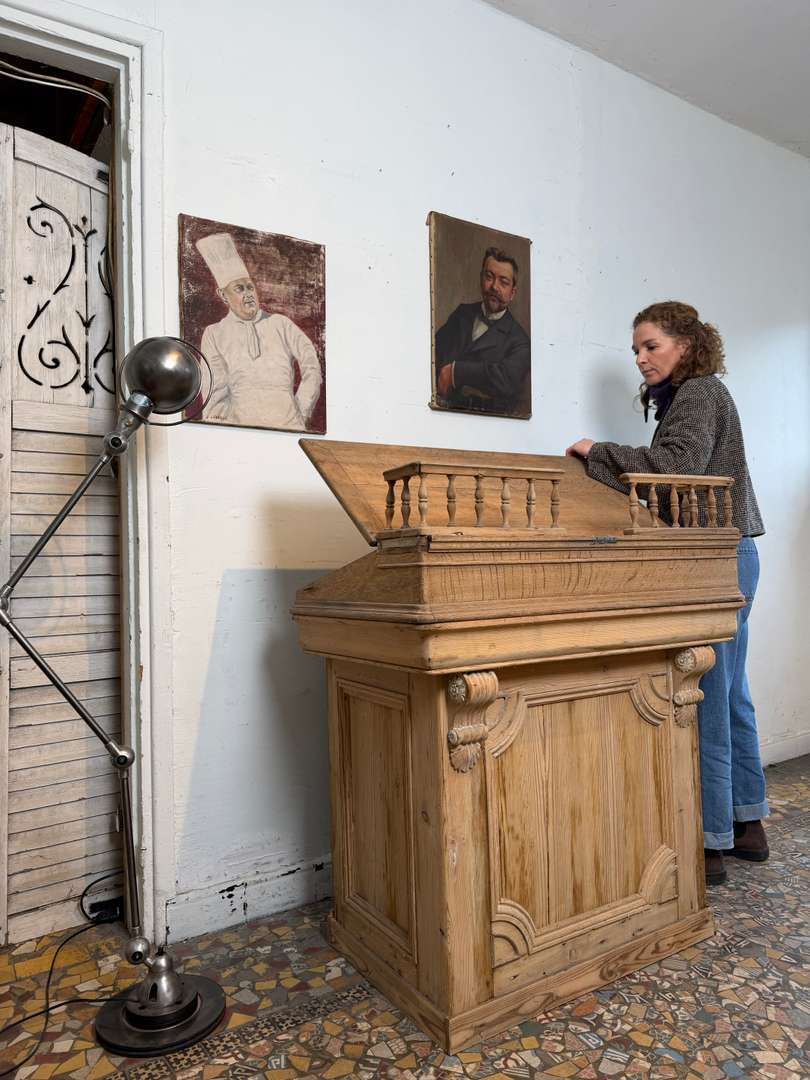 En sapin et chêne, ce comptoir est composé de deux parties et peut être utilisé avec ou sans la partie haute. Pupitre écritoire avec plaque en zinc pour déposer la monnaie, tiroir et étagère à l’arrière. Idéal pour un commerce ou un espace d’accueil.