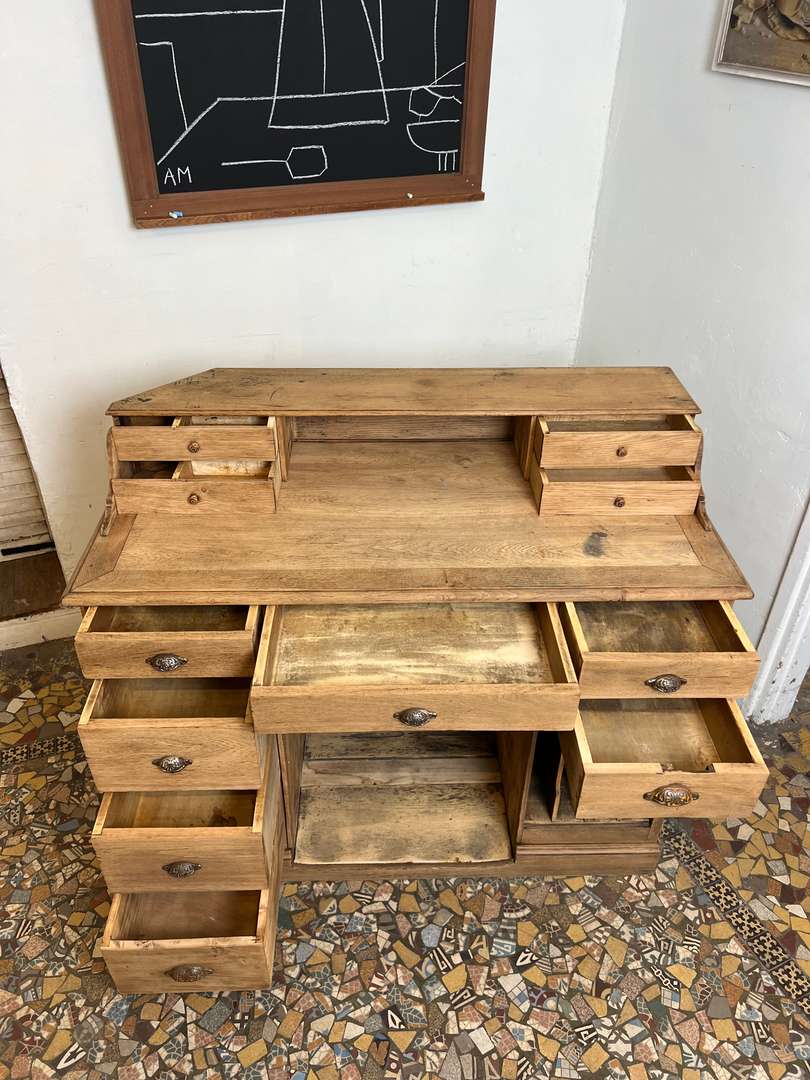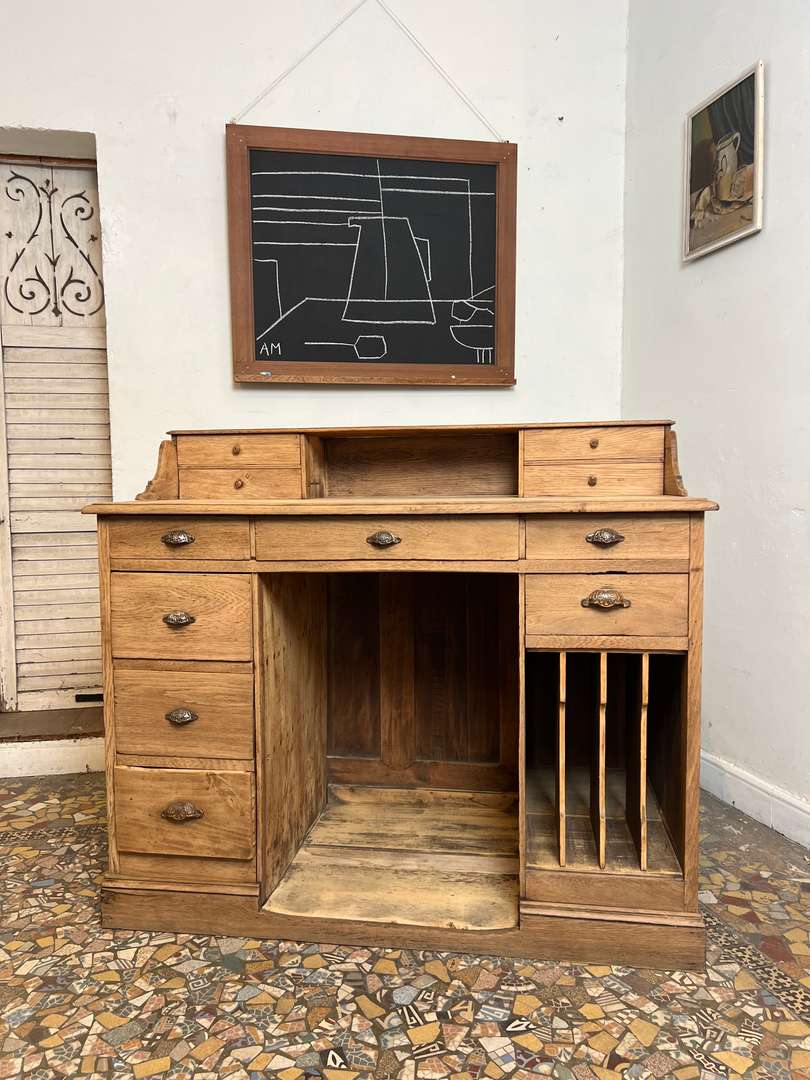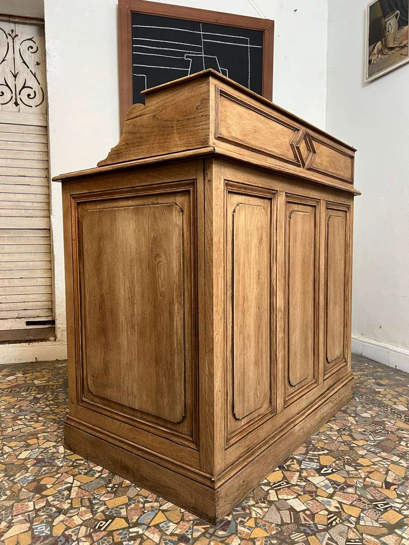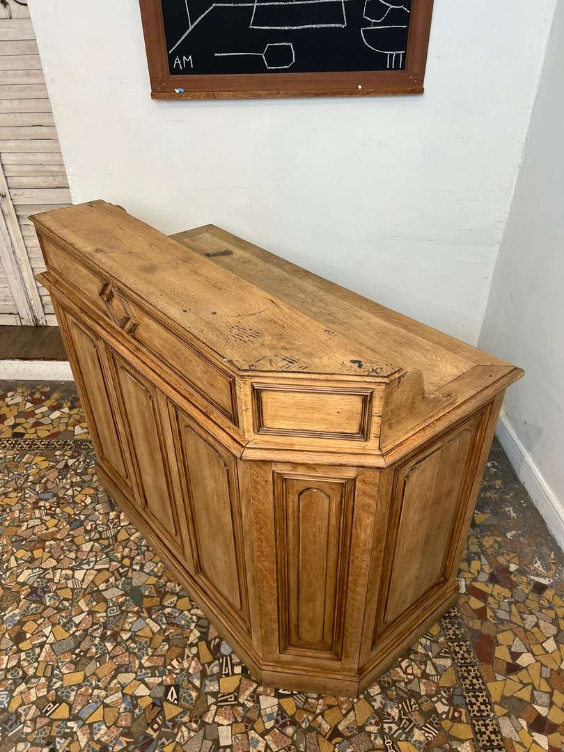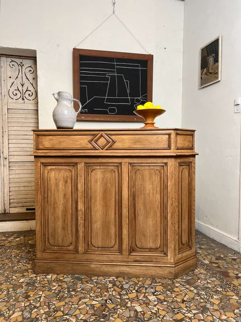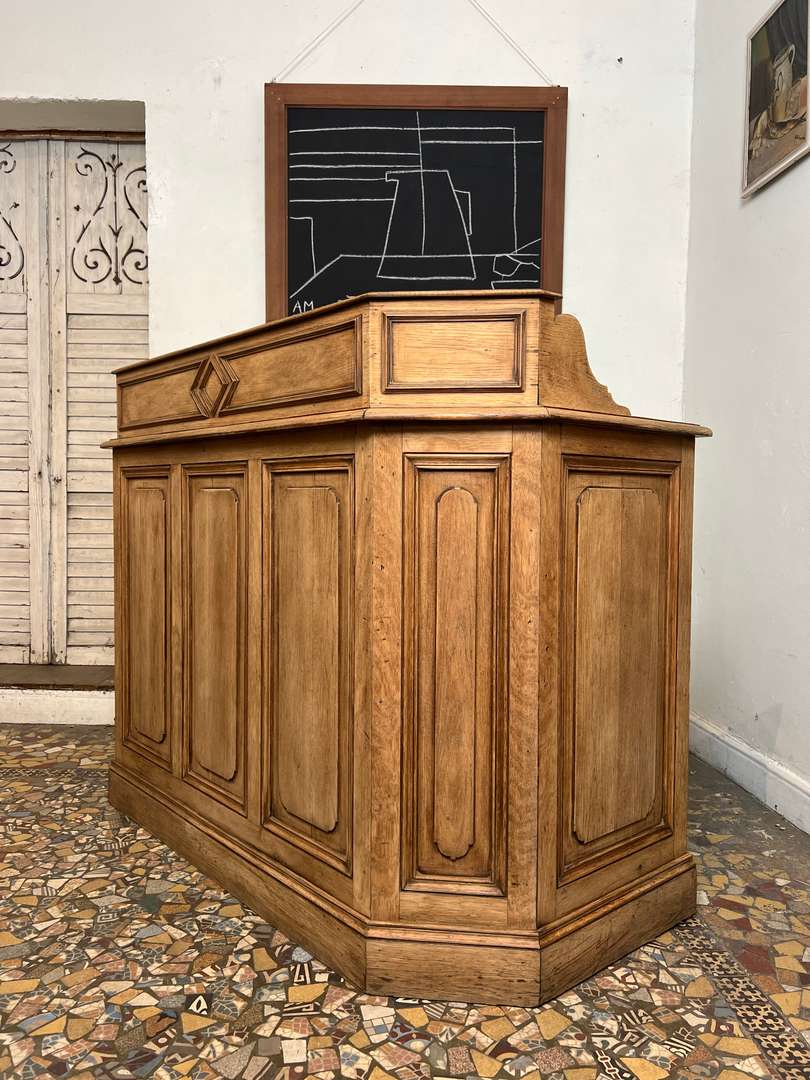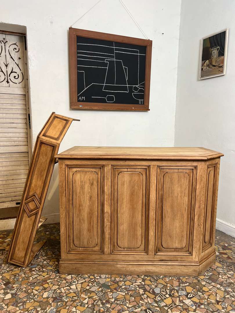 Ancien comptoir de commerce en chêne, début XXe. Il est composé d’un meuble bas et d’une partie haute amovible. Beaux panneaux moulurés, grande capacité de rangement avec tiroirs et casiers. Parfait en comptoir d’entrée, de boutique ou en meuble de rangement.