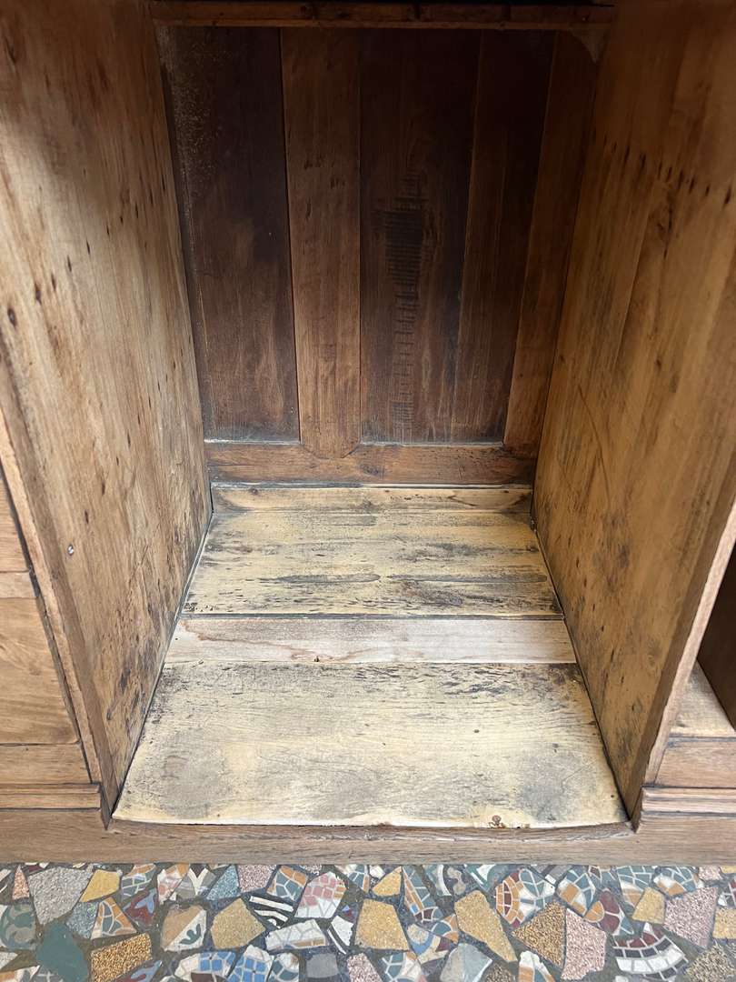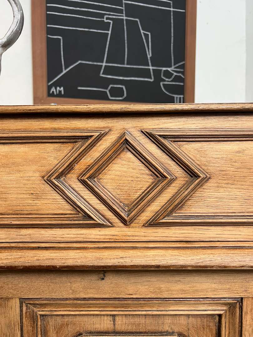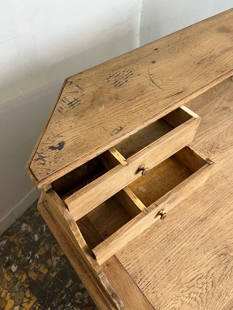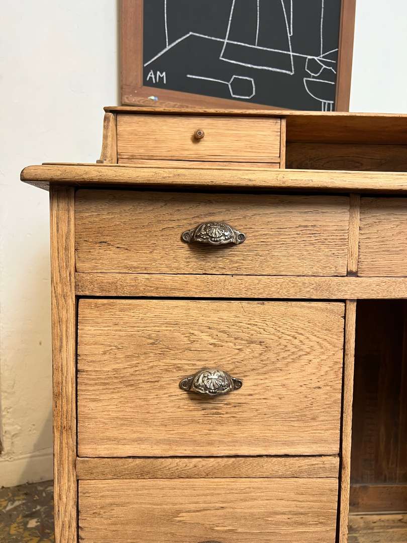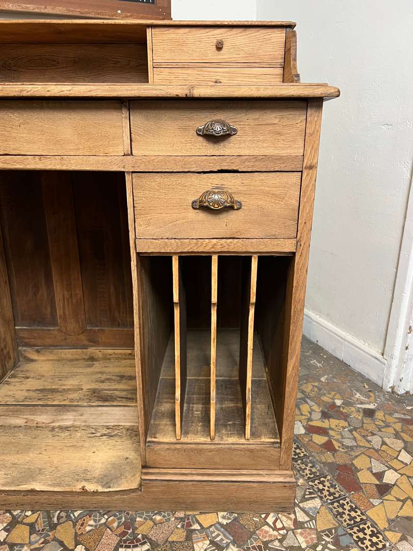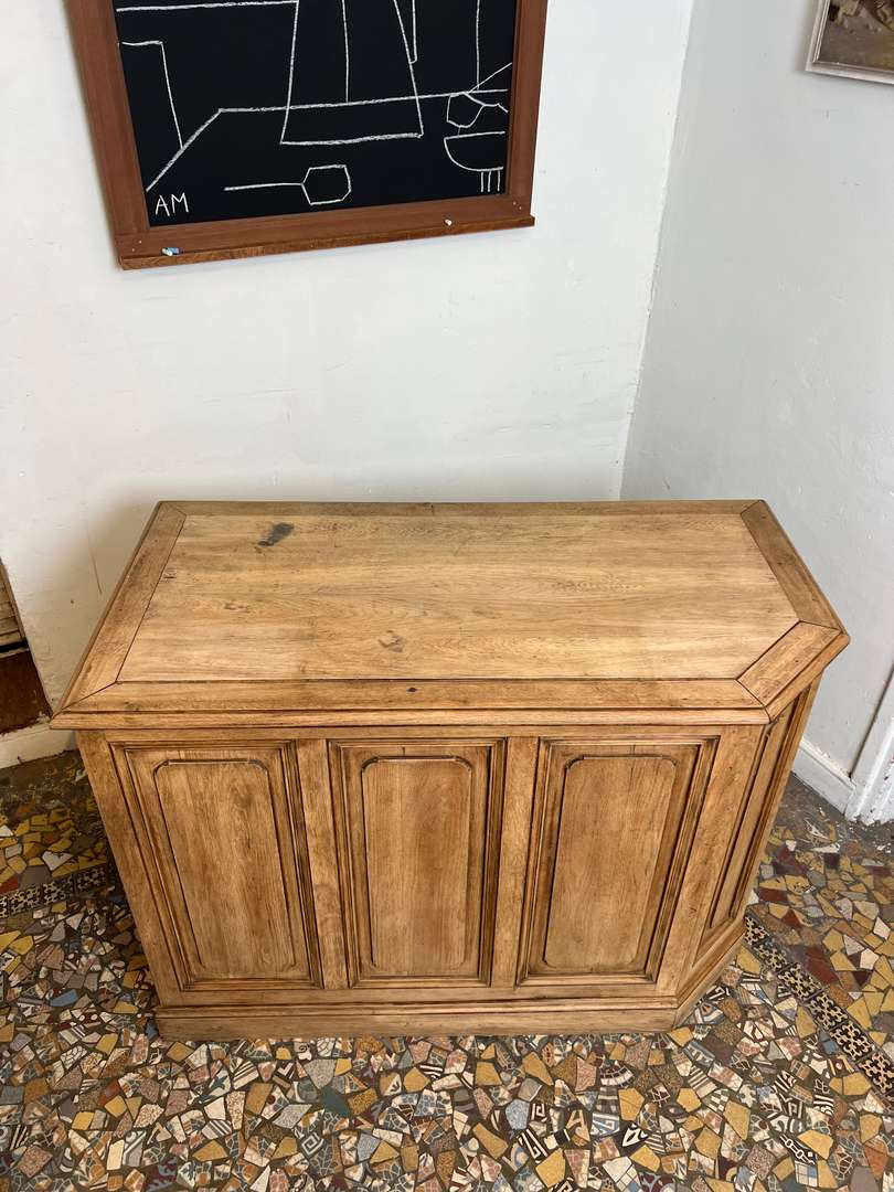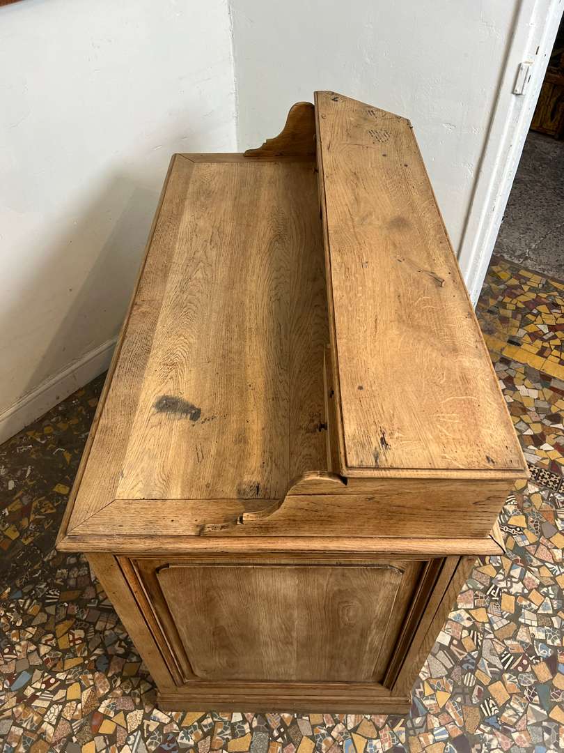 Ancien comptoir de commerce en chêne, début XXe. Il est composé d’un meuble bas et d’une partie haute amovible. Beaux panneaux moulurés, grande capacité de rangement avec tiroirs et casiers. Parfait en comptoir d’entrée, de boutique ou en meuble de rangement.