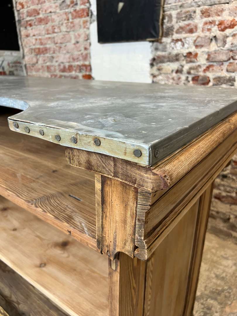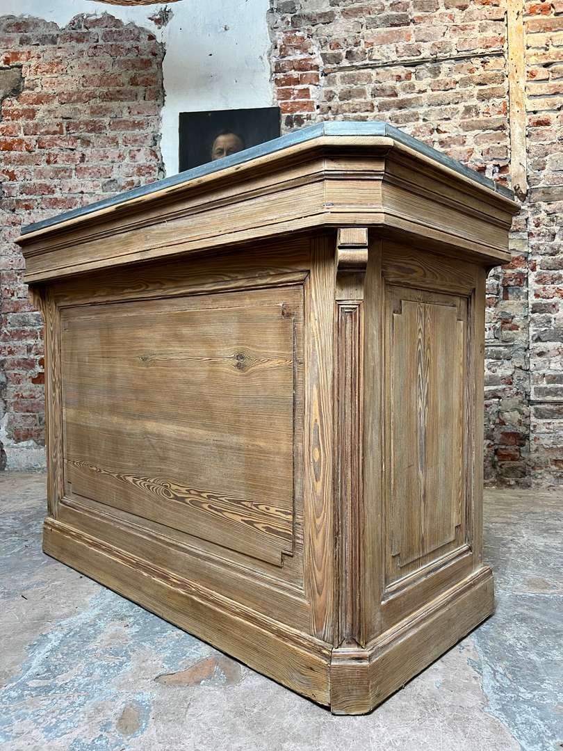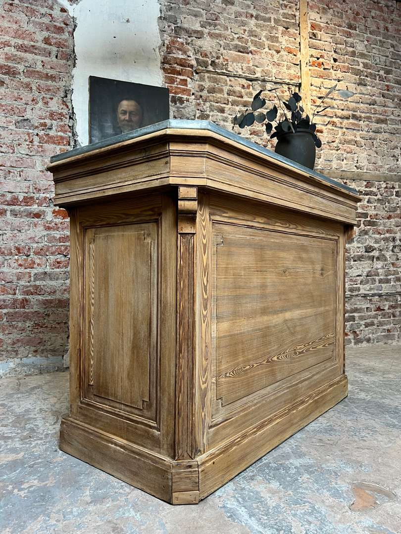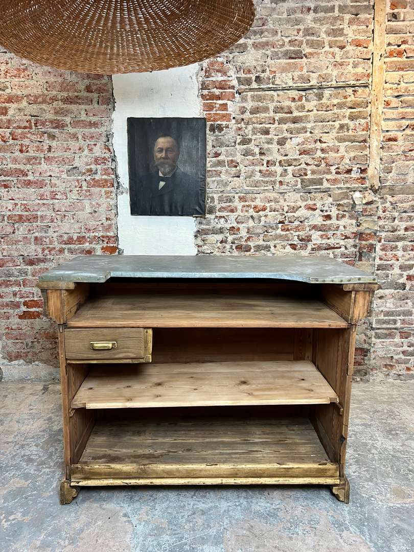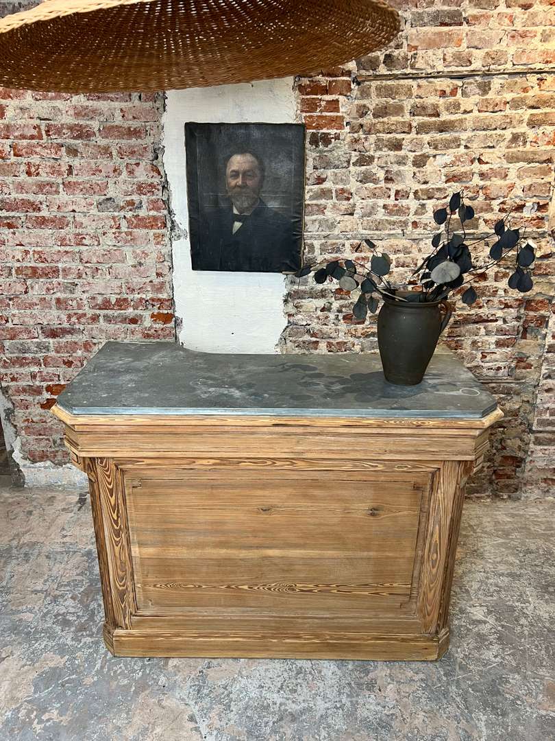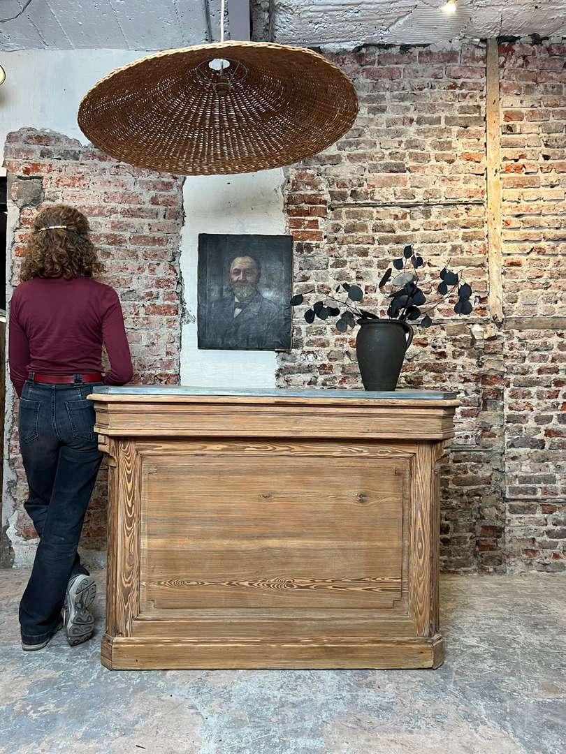 Ancien comptoir datant du début du XXᵉ siècle, entièrement en sapin avec son plateau en zinc d’origine. Il dispose à l’arrière d’un tiroir et de deux étagères de rangement. Idéal en comptoir de boutique, en plan de travail ou en meuble d’accueil.