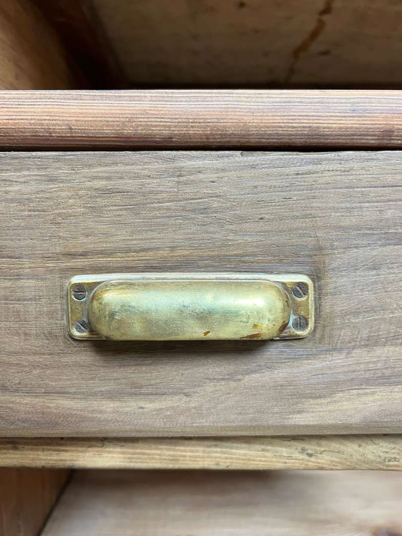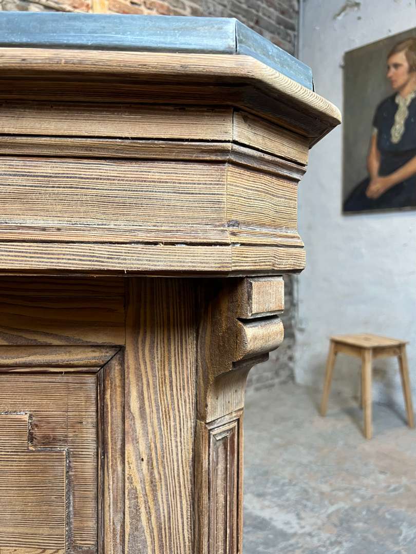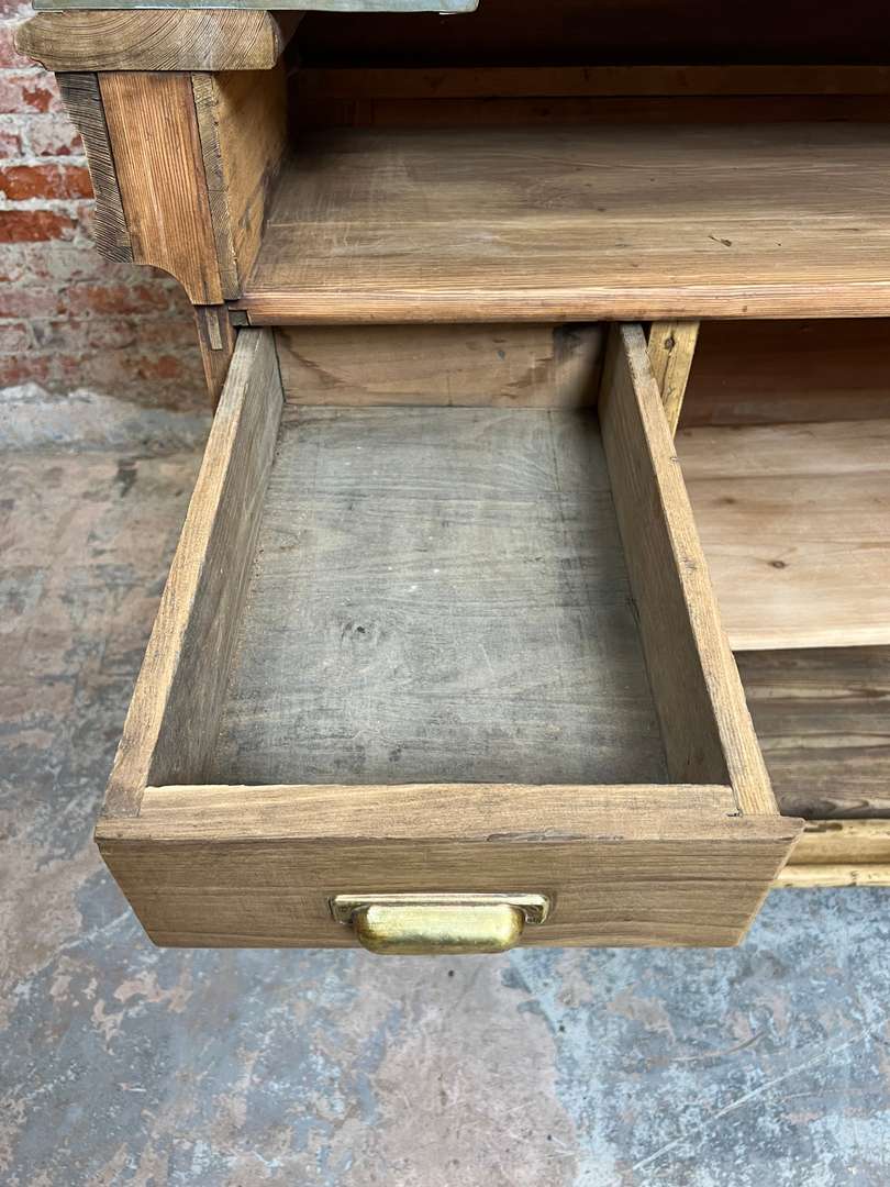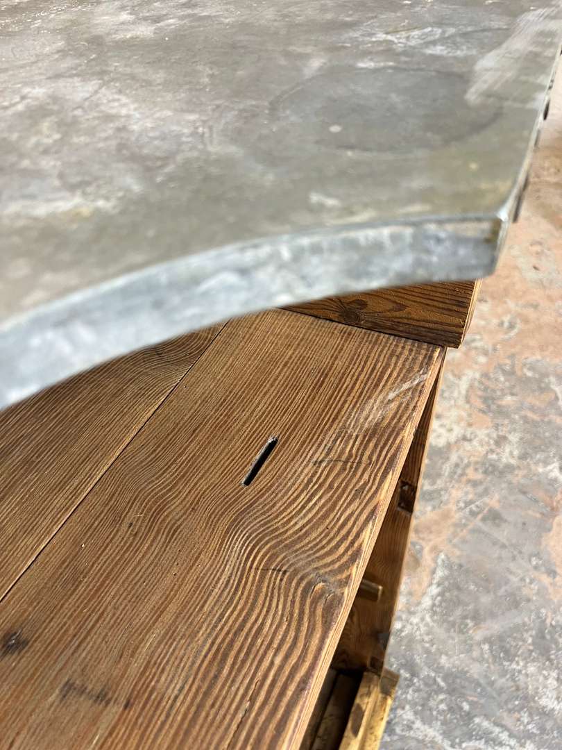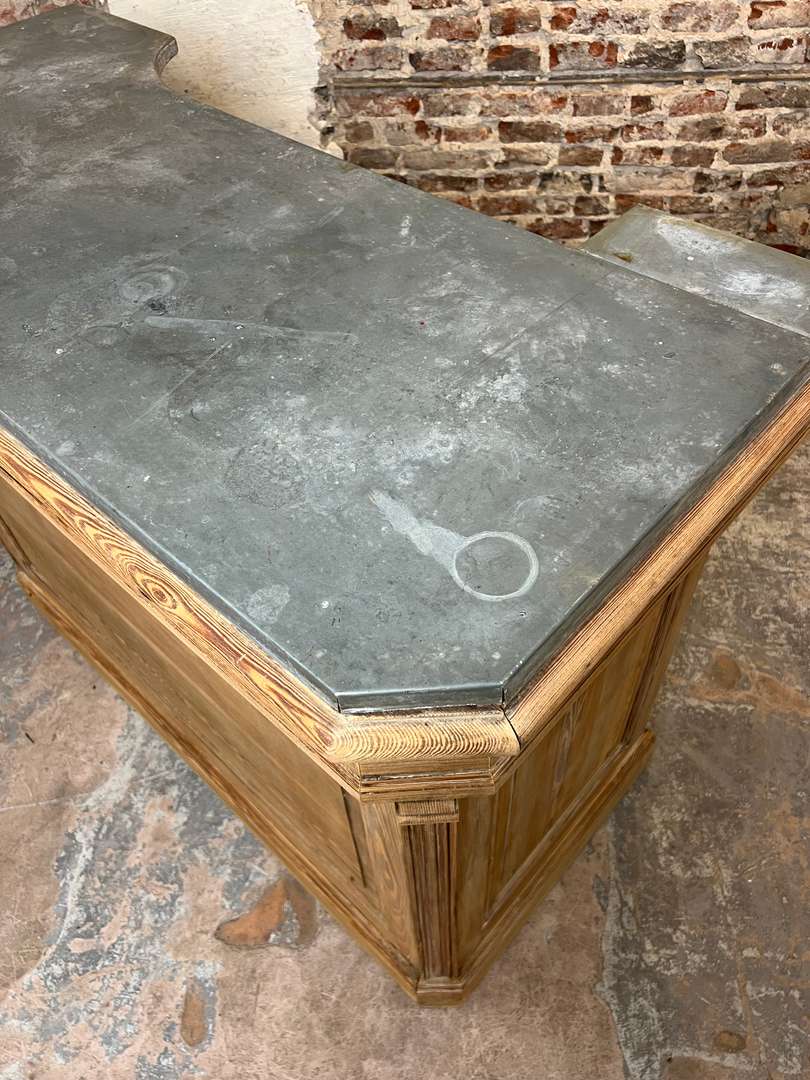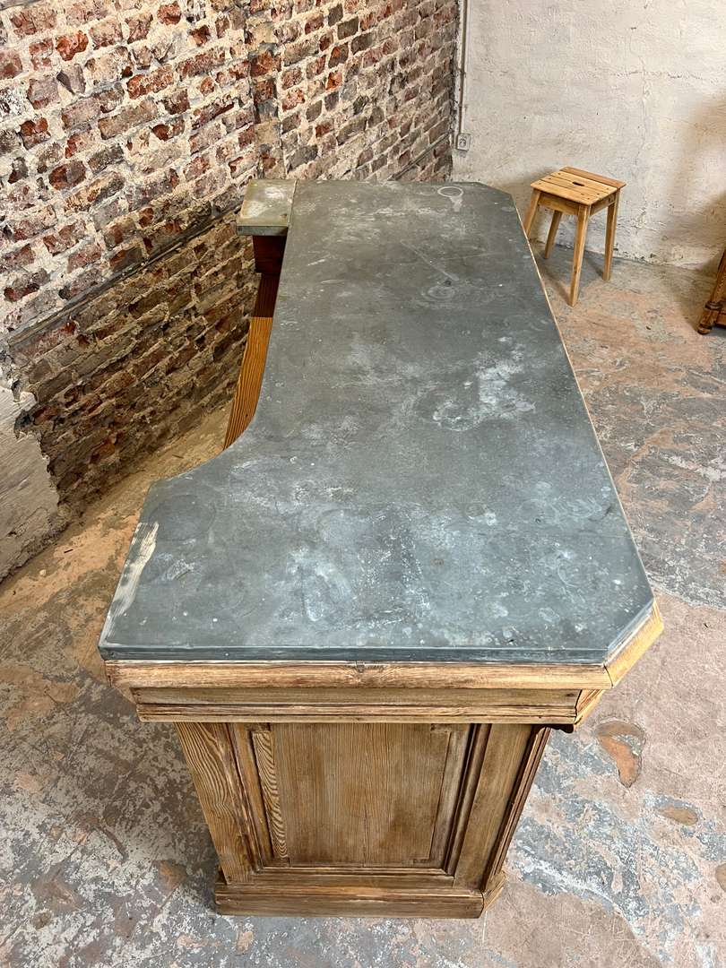 Ancien comptoir datant du début du XXᵉ siècle, entièrement en sapin avec son plateau en zinc d’origine. Il dispose à l’arrière d’un tiroir et de deux étagères de rangement. Idéal en comptoir de boutique, en plan de travail ou en meuble d’accueil.