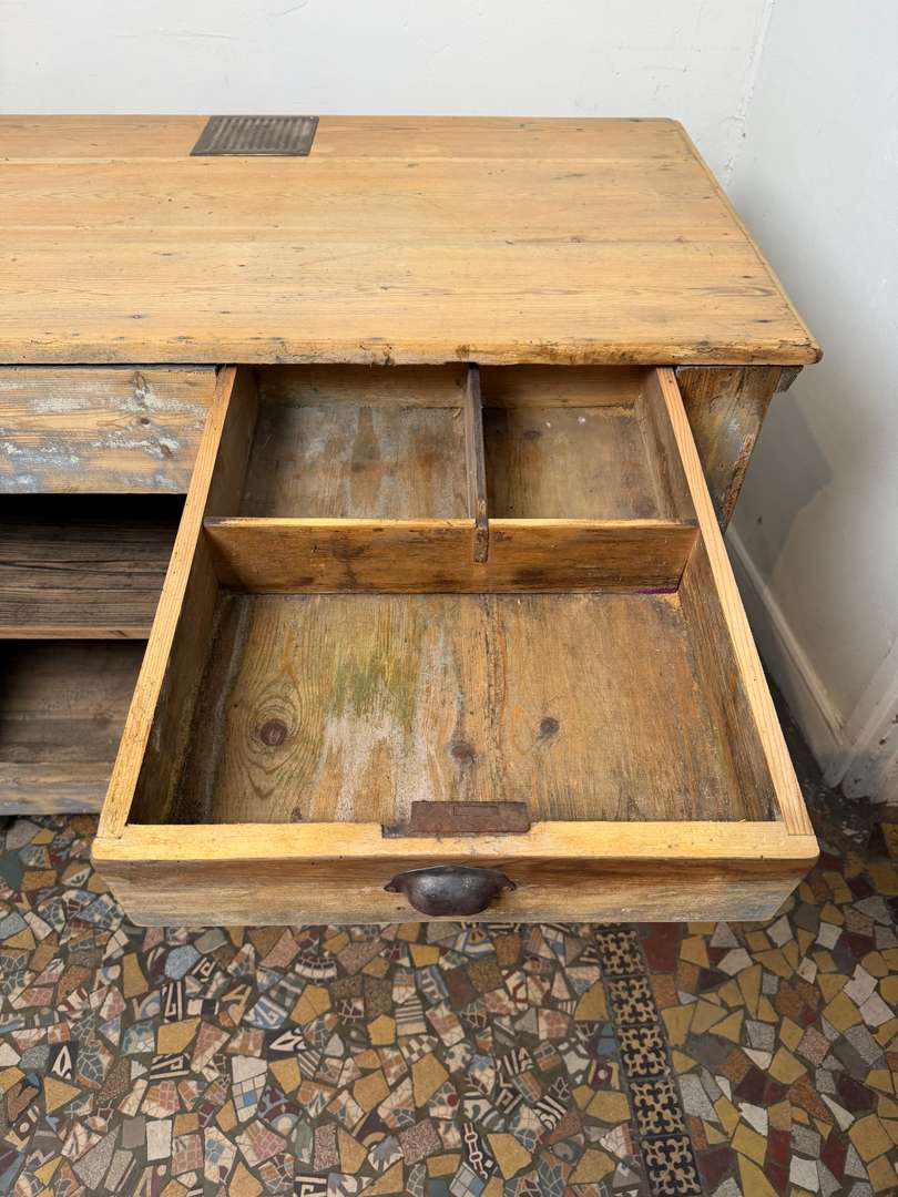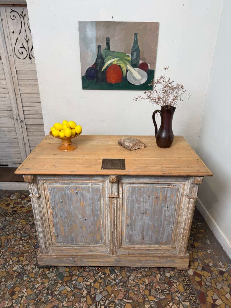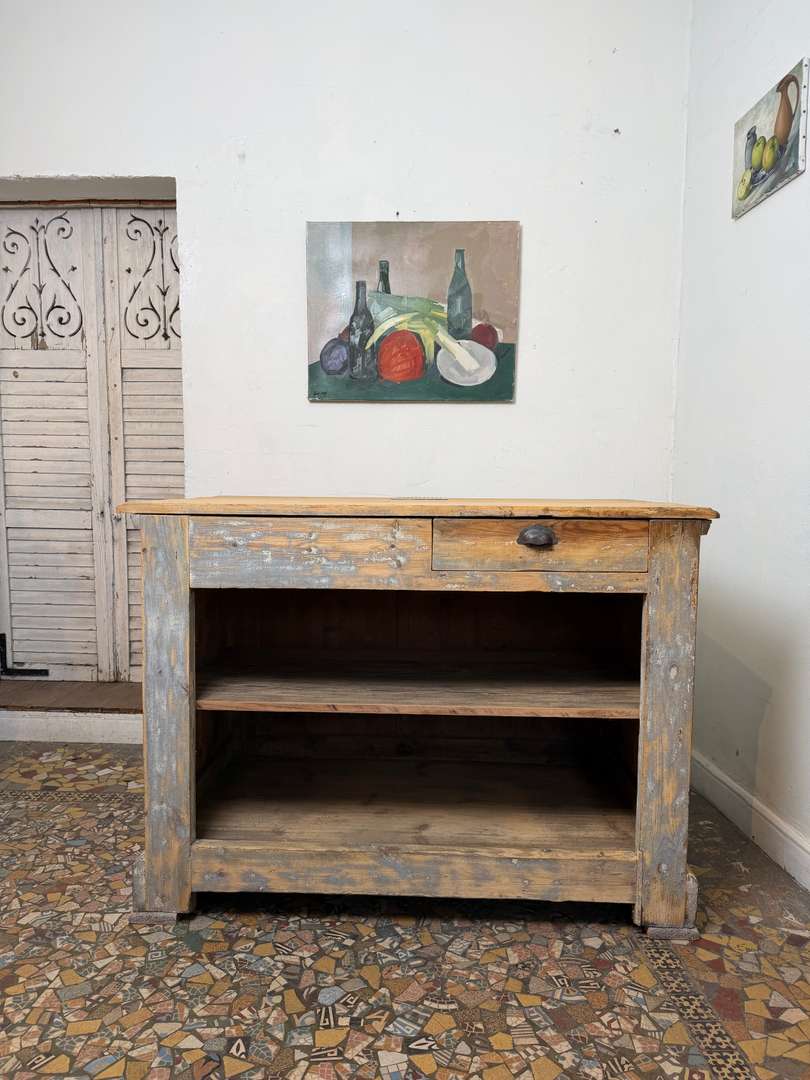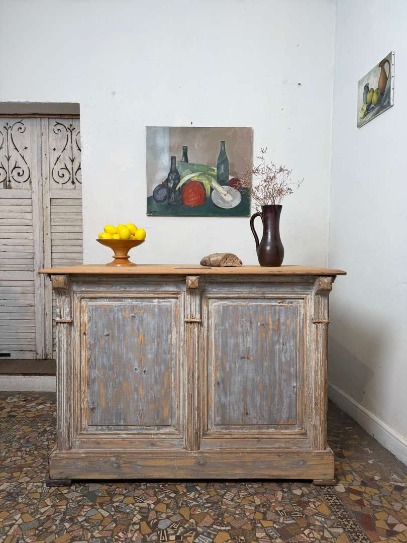 Ancien comptoir – fin XIXe 800 € Ajouter au panierAncien comptoir de la fin XIXe siècle en sapin, avec patine bleutée d’origine. Plateau avec plaque en laiton pour déposer les pièces. Un tiroir et une étagère à l’arrière. Idéal dans un commerce ou en îlot central. #anciencomptoir #comptoirancien #19eme #meubleancien #sapin #brocanteDimensionsLargeur127 cmProfondeur70 cmHauteur90 cmProfondeur intérieure57 cmRenseignementsRéférence2602009