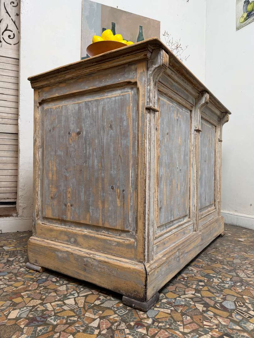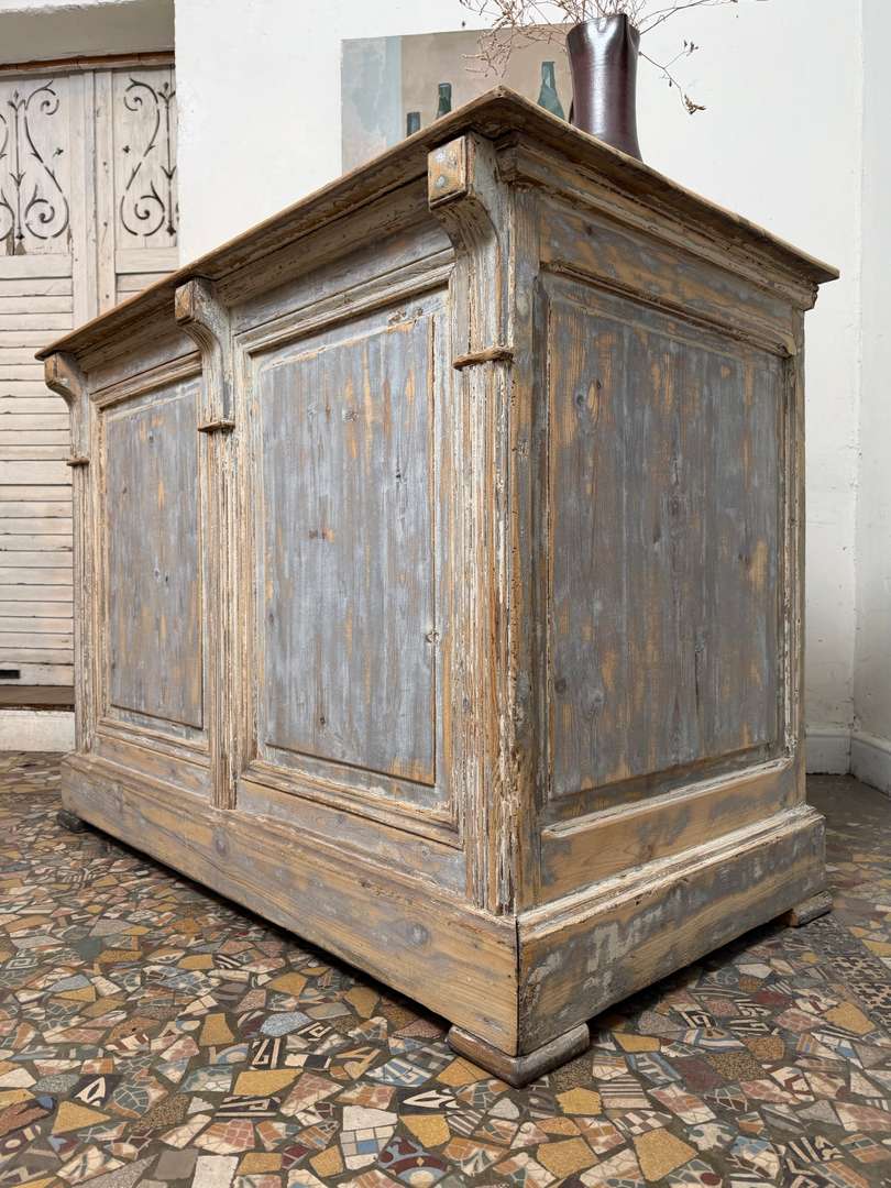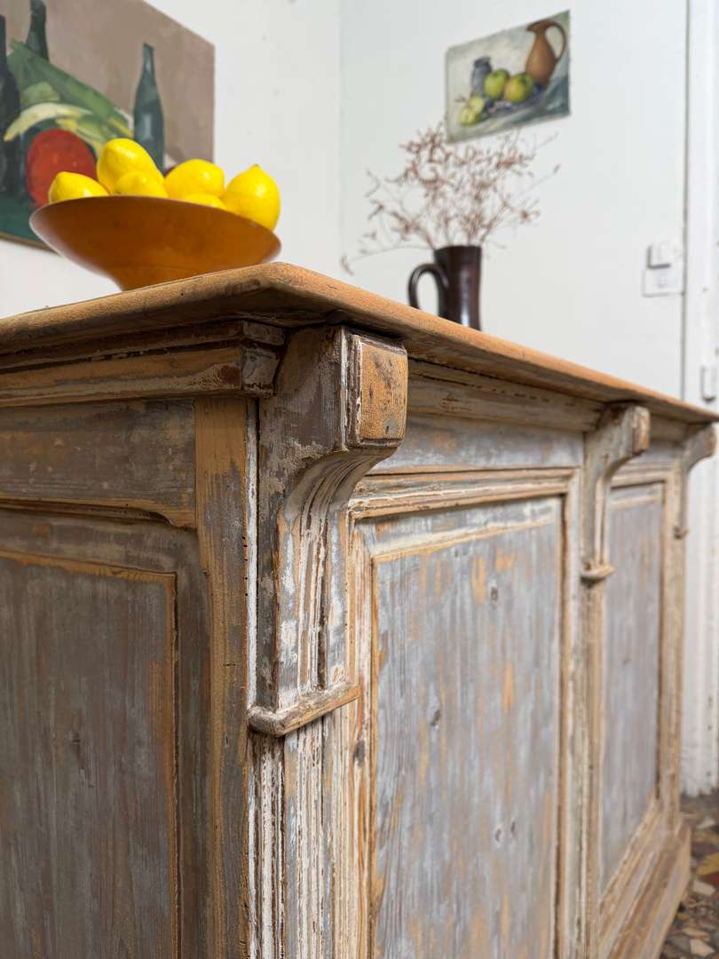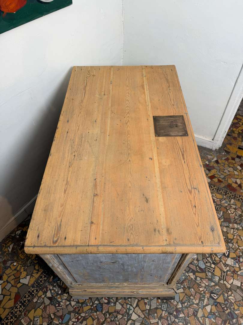 Ancien comptoir – fin XIXe 800 € Ajouter au panierAncien comptoir de la fin XIXe siècle en sapin, avec patine bleutée d’origine. Plateau avec plaque en laiton pour déposer les pièces. Un tiroir et une étagère à l’arrière. Idéal dans un commerce ou en îlot central. #anciencomptoir #comptoirancien #19eme #meubleancien #sapin #brocanteDimensionsLargeur127 cmProfondeur70 cmHauteur90 cmProfondeur intérieure57 cmRenseignementsRéférence2602009