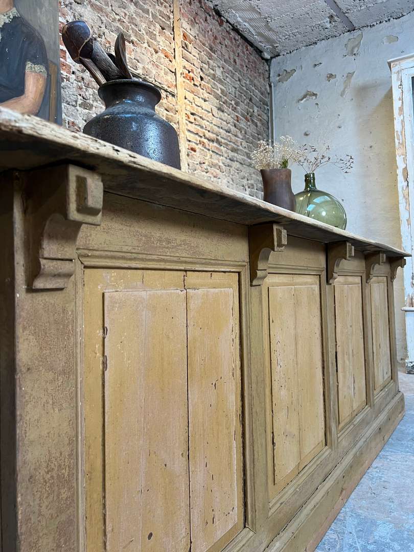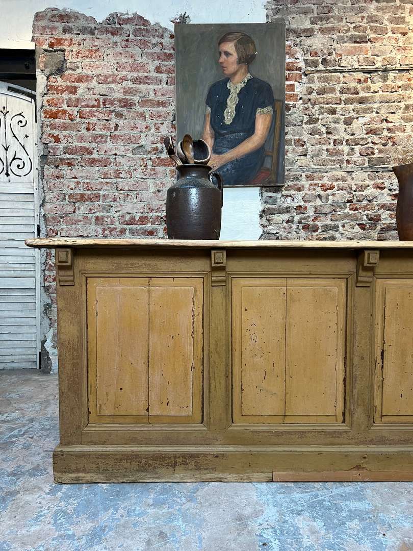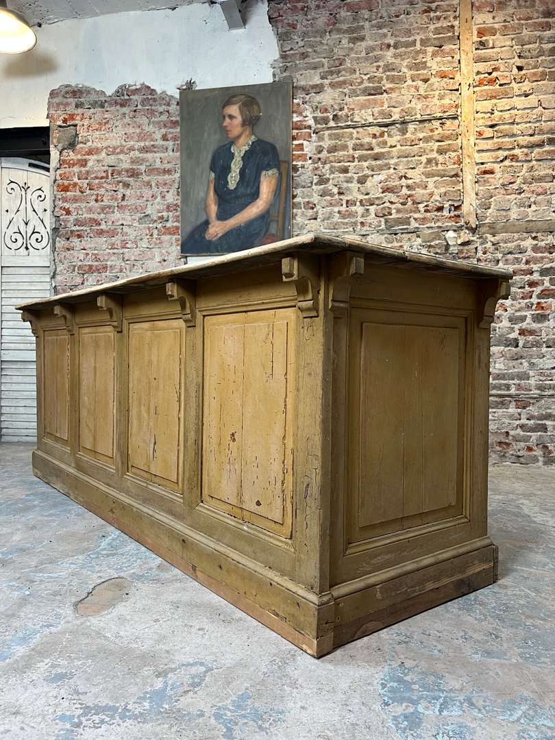 Superbe comptoir de commerce datant du XIXe siècle. Il a conservé sa belle couleur d’origine dans les tons ocre. La structure est en sapin et le plateau en tilleul. La façade est panneautée et ornée de crosses. À l’arrière, on trouve deux tiroirs et plusieurs étagères offrant un bel espace de rangement.