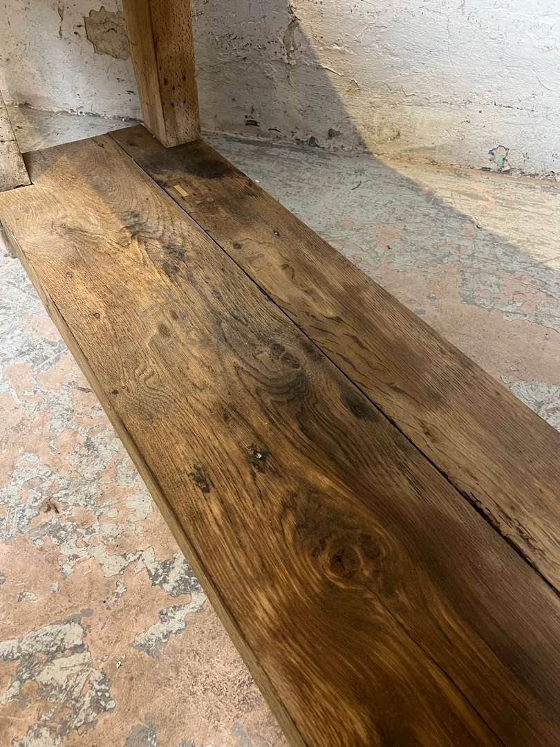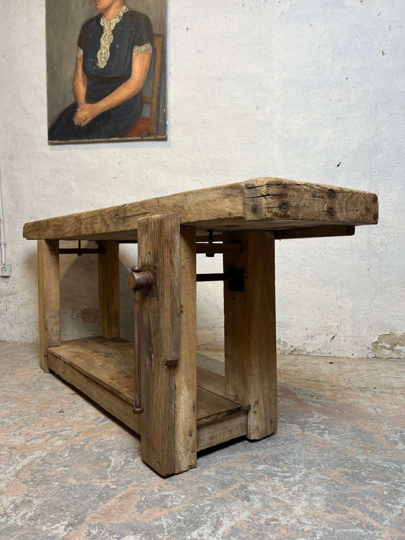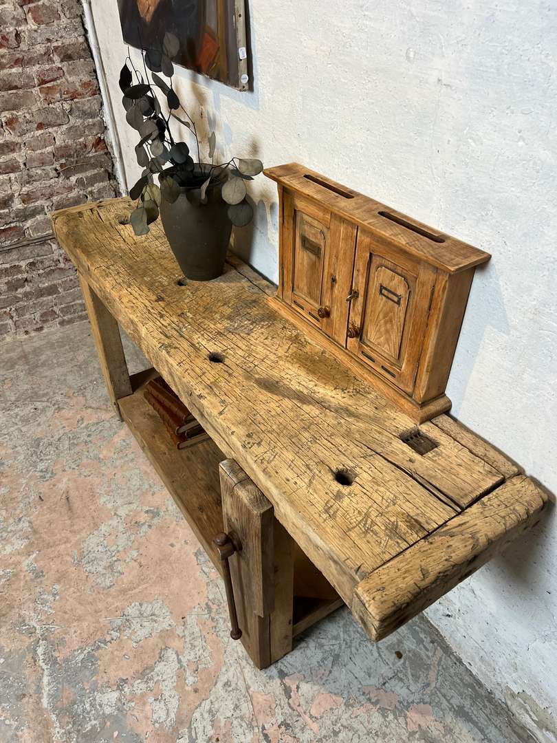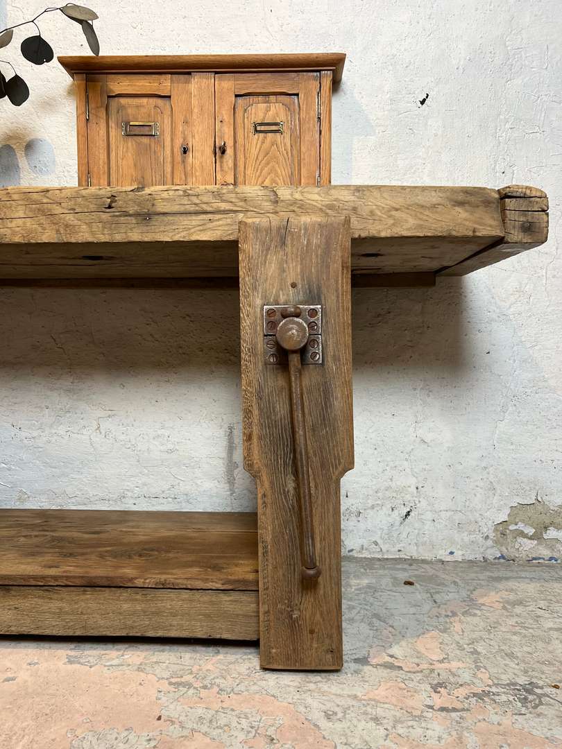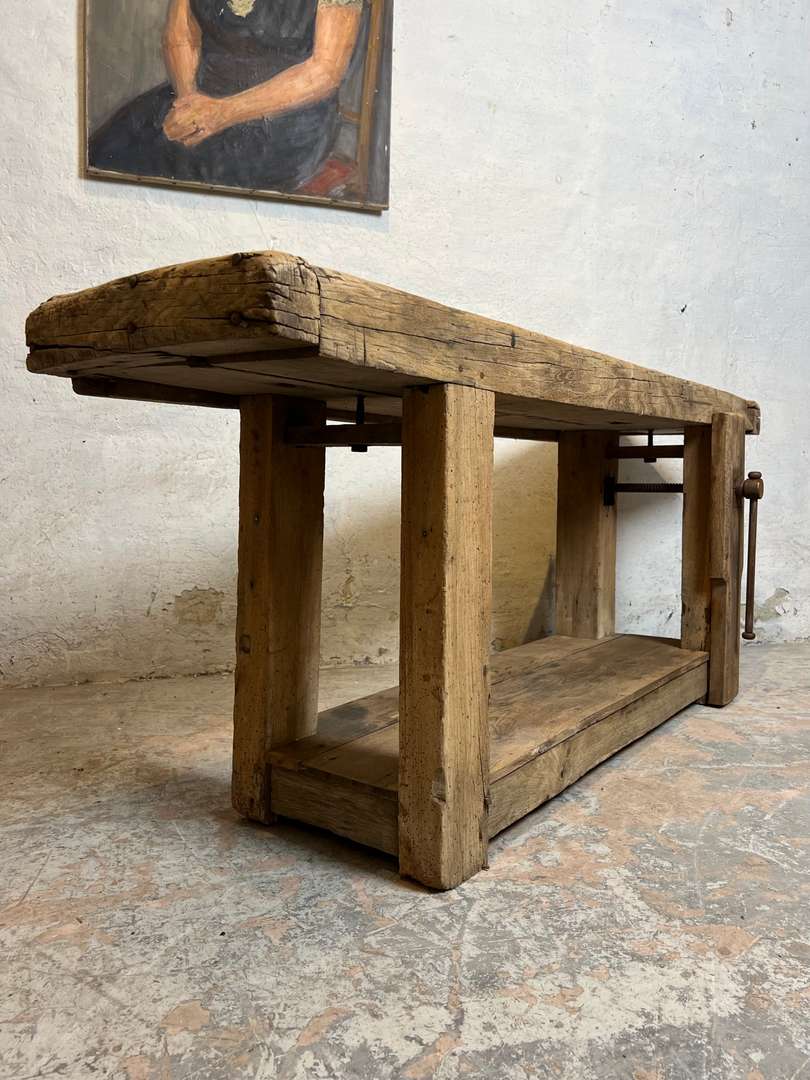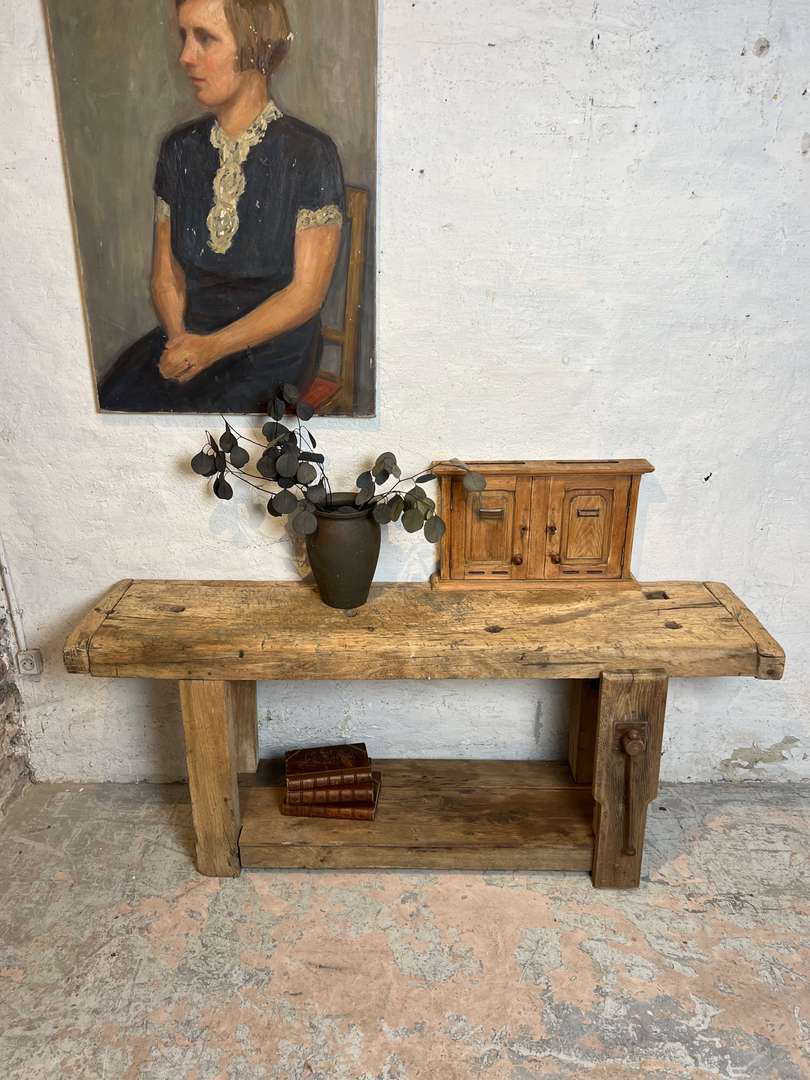 Ancien établi de menuisier au bois brut et à la belle patine du temps. Son plateau épais, marqué par les années, et son étagère basse en font une pièce pleine de caractère. Il peut être détourné en console ou en meuble de présentation dans une entrée ou un séjour.