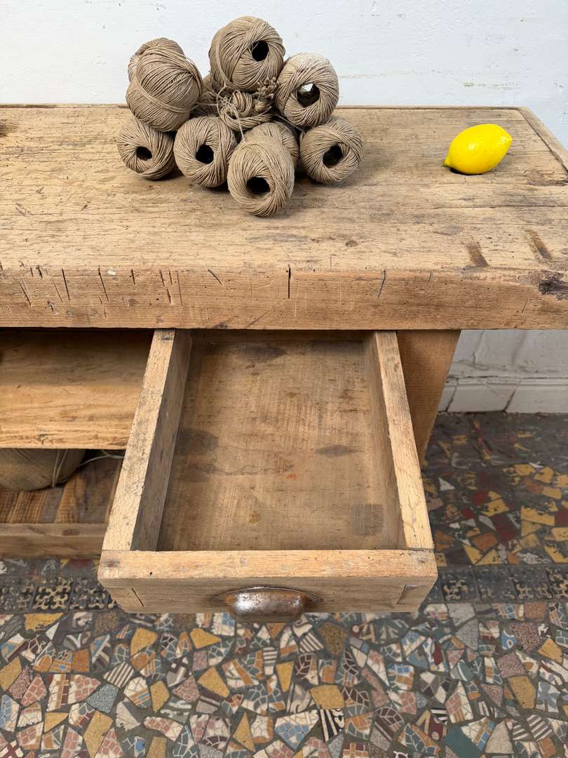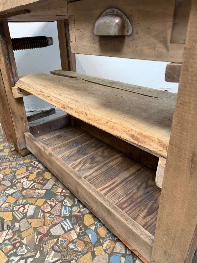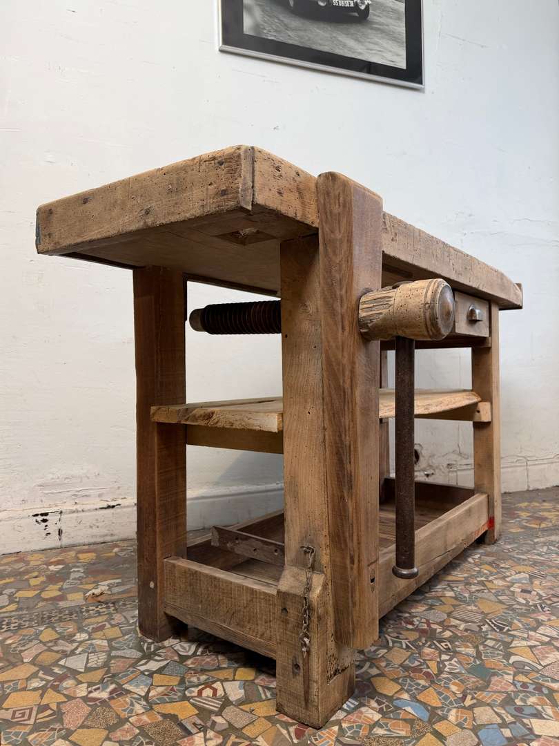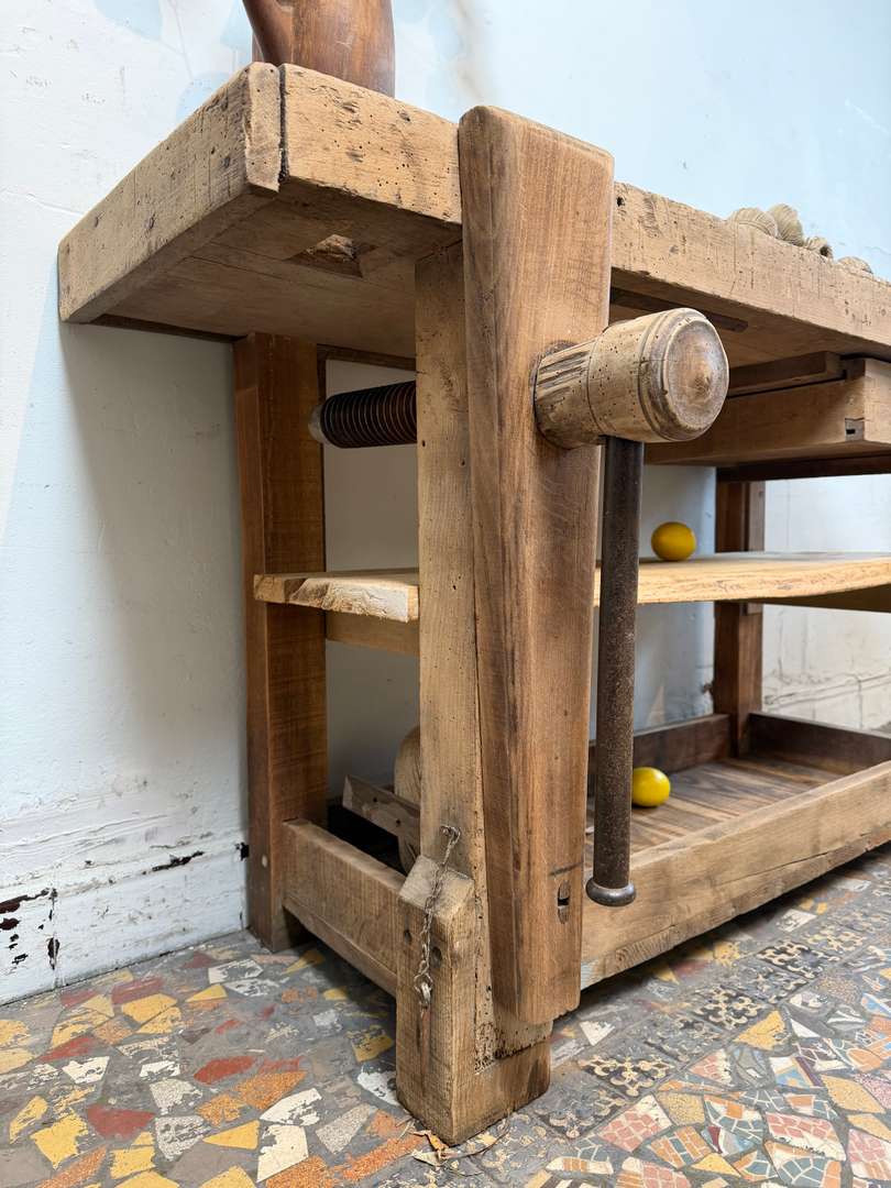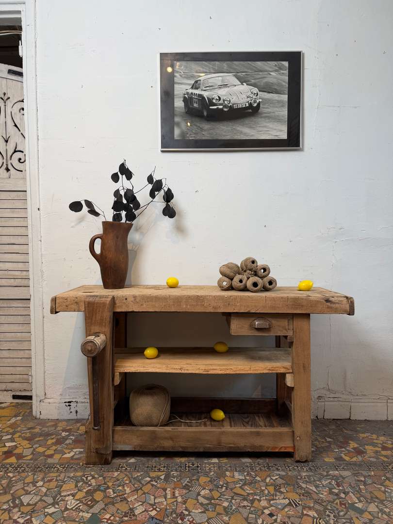Ancien établi de métier en hêtre et sapin, datant de la fin du XIXᵉ siècle. Plateau épais marqué par les traces du temps, avec trous et coups témoignant de son usage. Équipé d’un étau en bois et d’un tiroir en façade. Un meuble authentique, idéal en console, îlot ou établi décoratif.