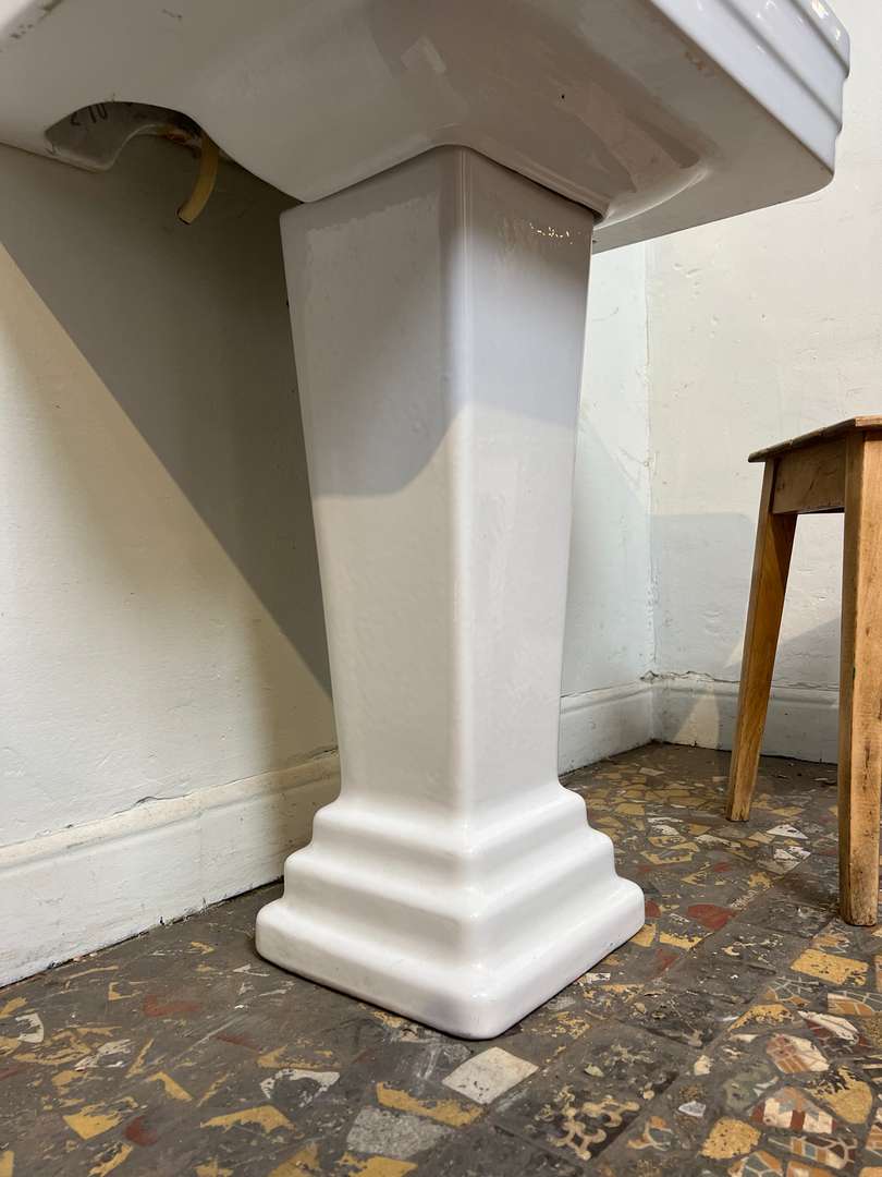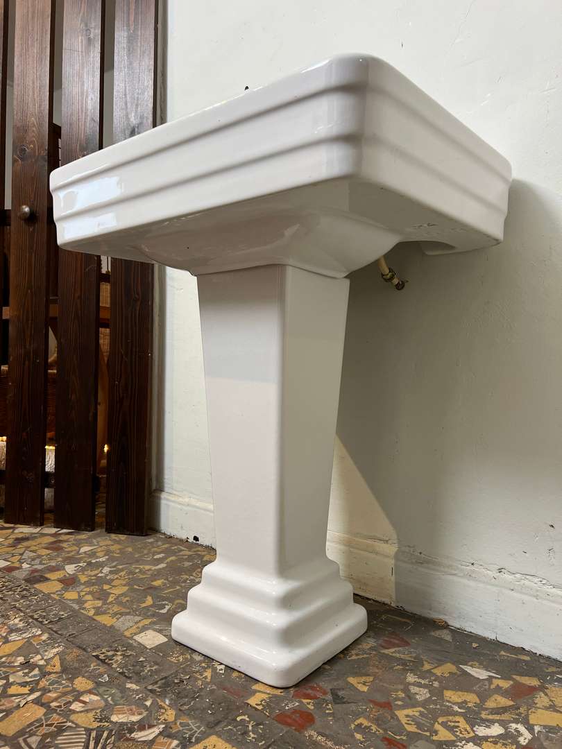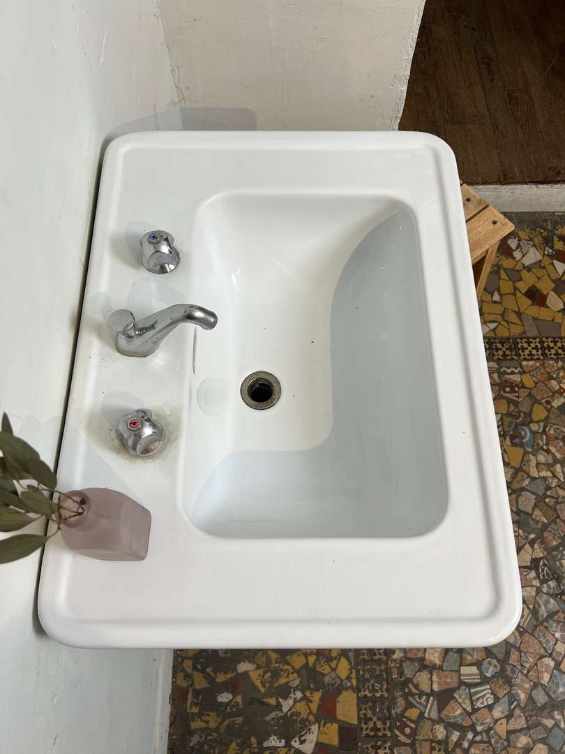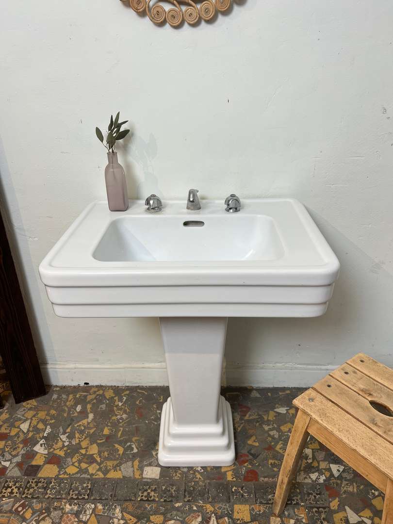 Ancien lavabo sur pied des années 50 180 € Ajouter au panierAncien lavabo en céramique blanche, typique des années 50, avec une vasque rectangulaire et un pied en colonne. Un modèle simple et solide, parfait pour une salle de bain. #lavaboancien #annees50 #ceramique #sdbancienne #brocante #decoauthentique #meubleancien #pieceuniqueDimensionsLargeur67 cmProfondeur50 cmHauteur80 cmRenseignementsRéférence2547003