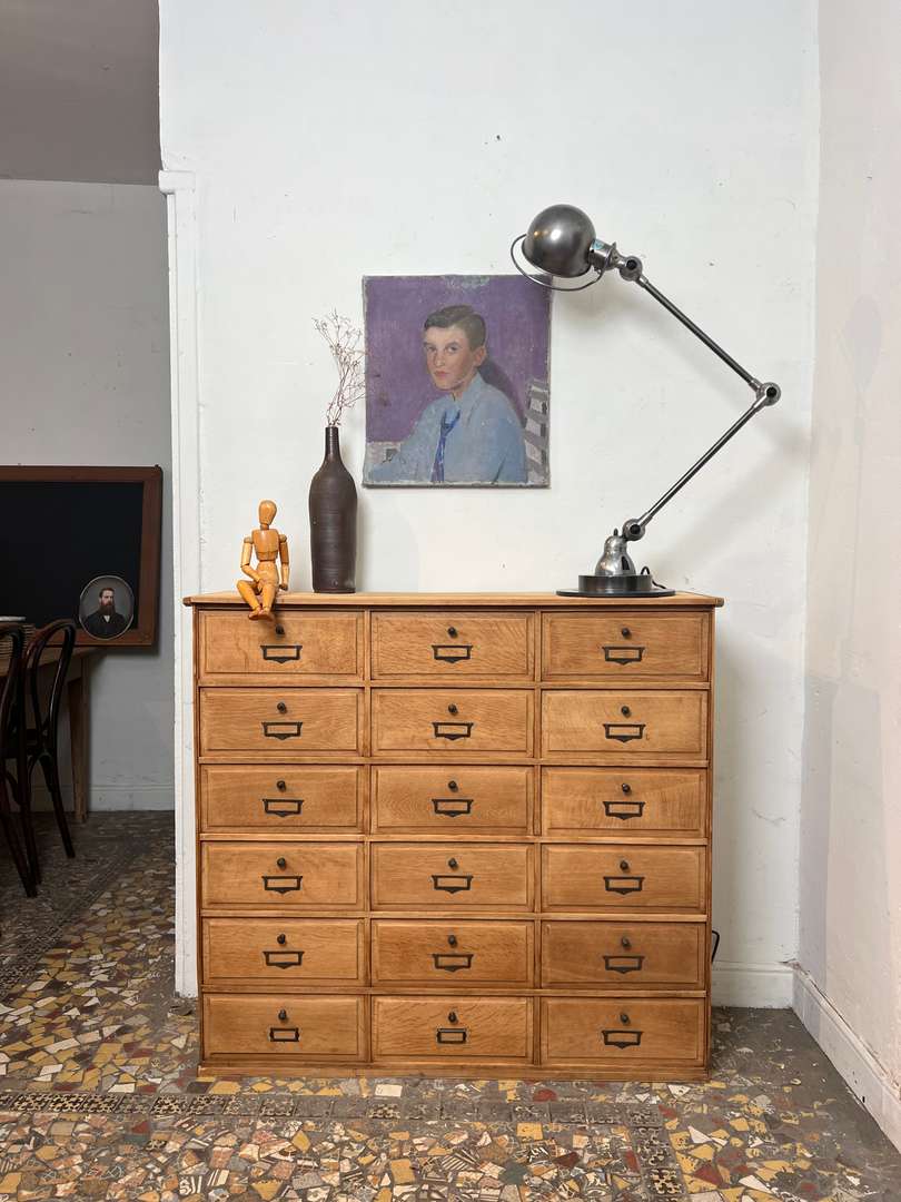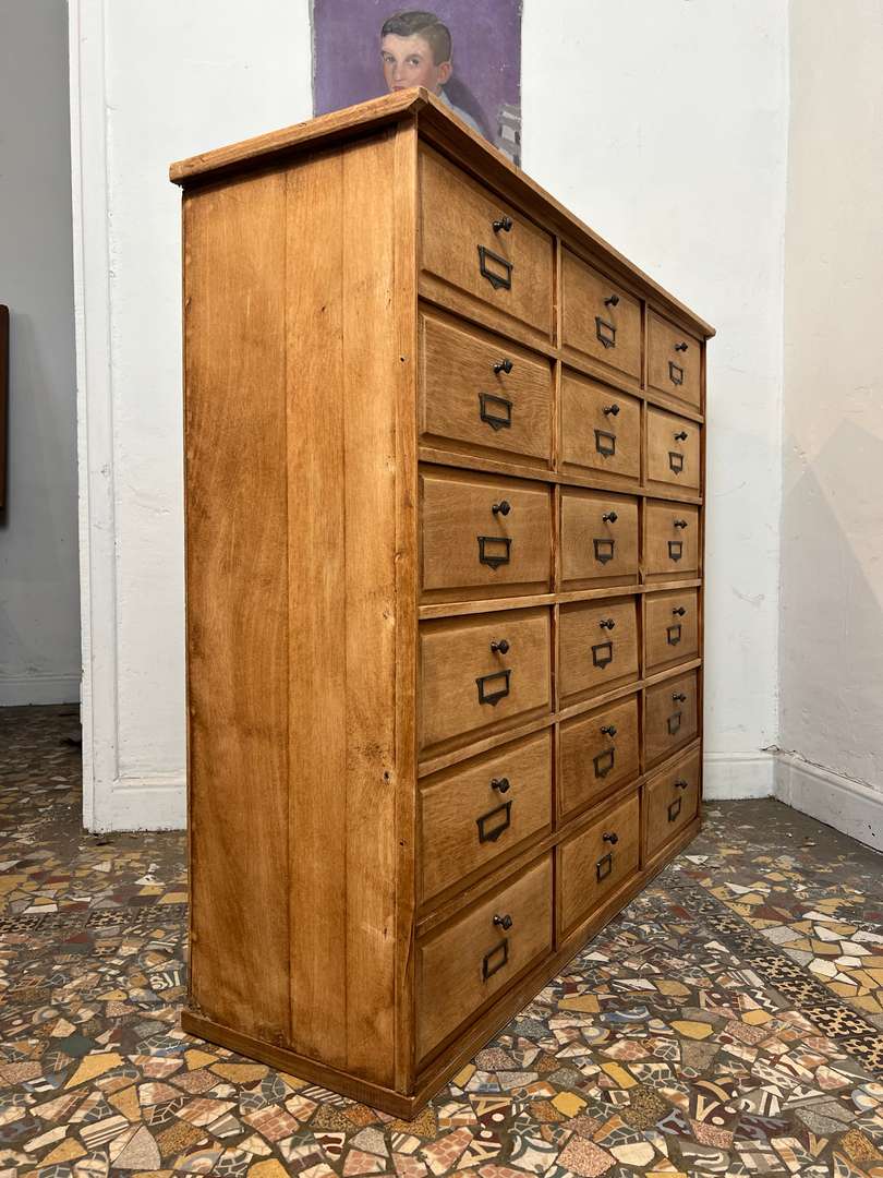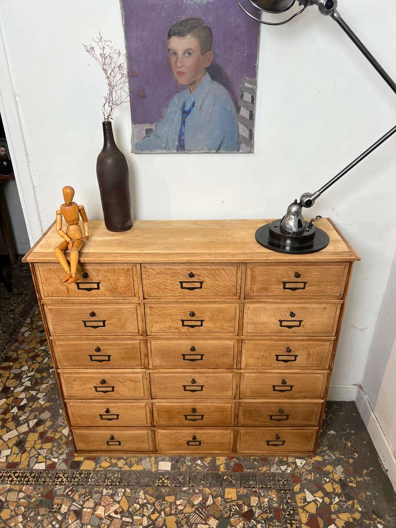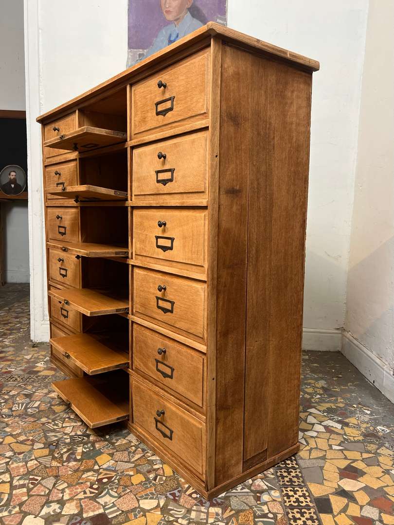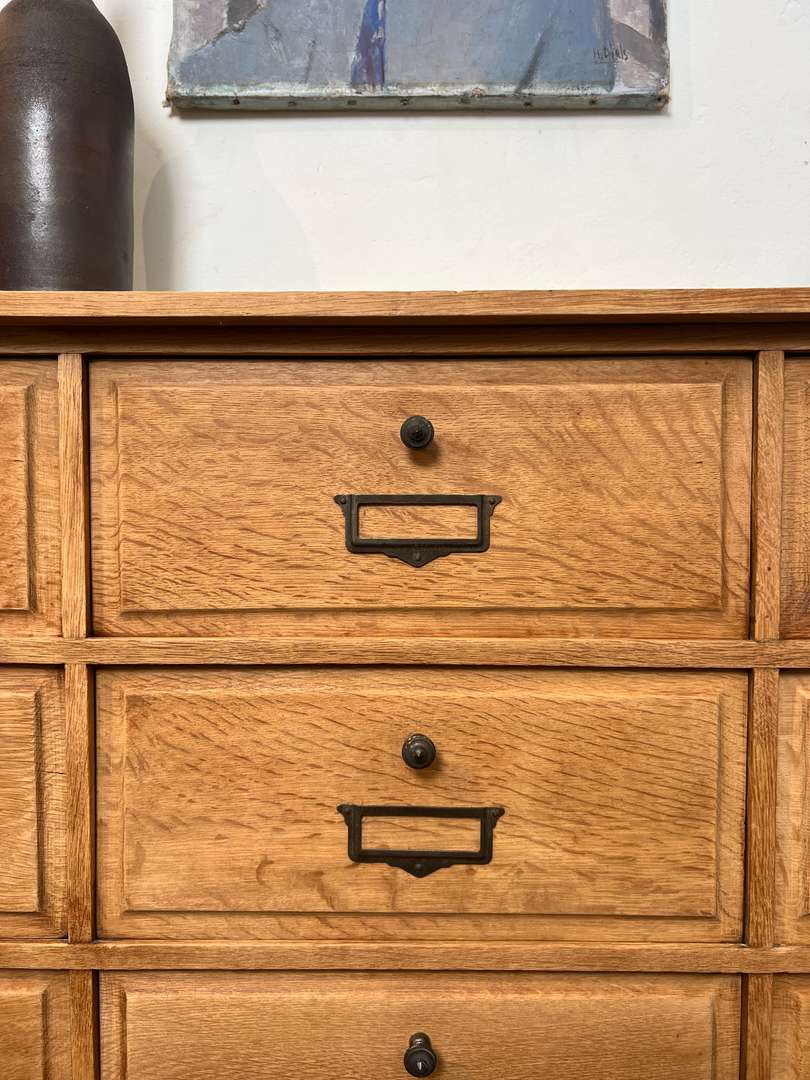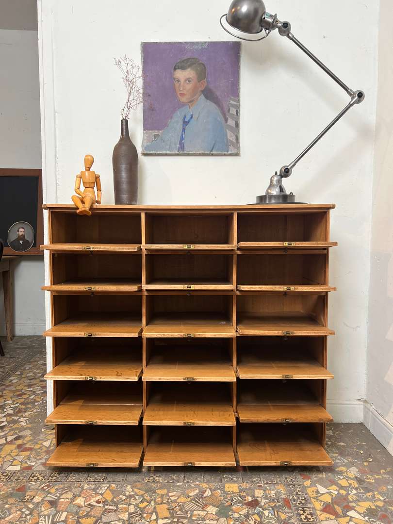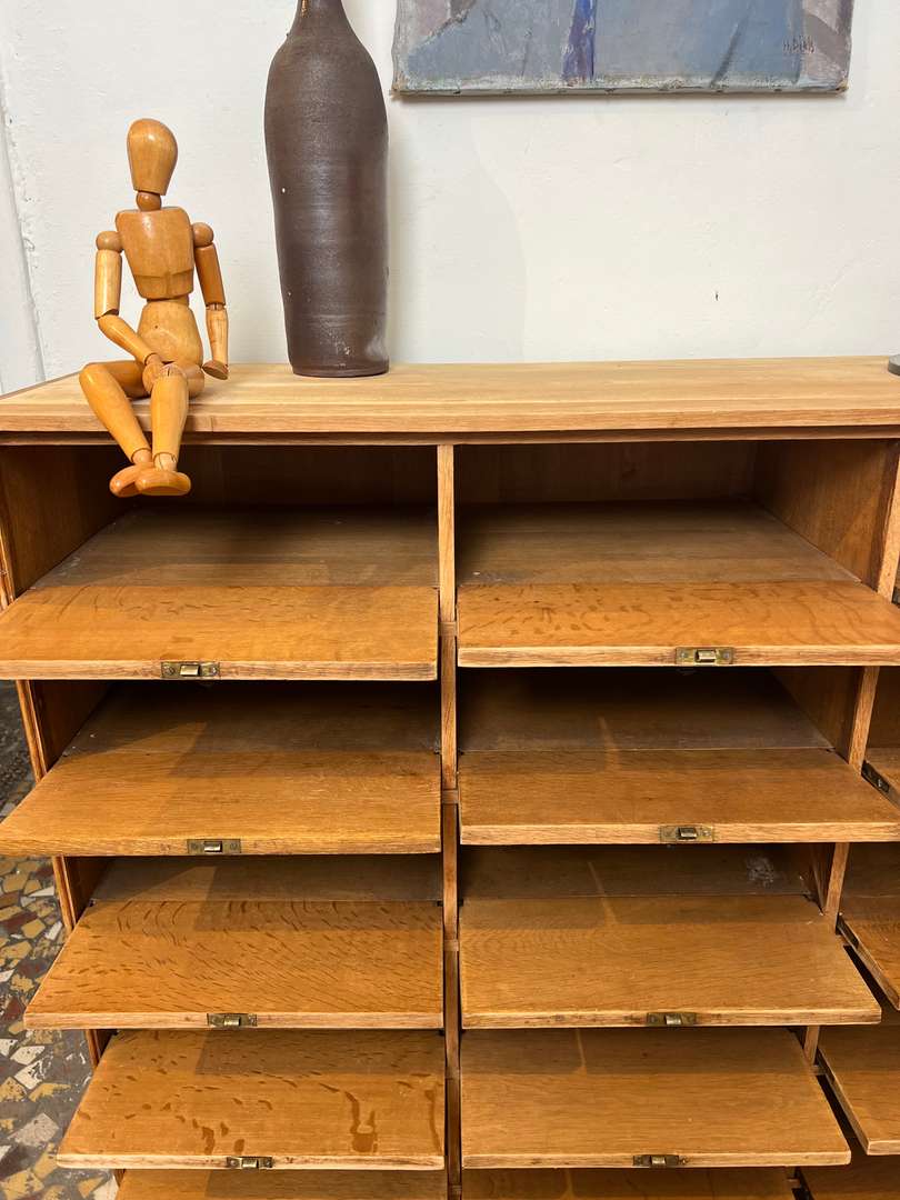 Beau meuble de rangement en chêne composé de nombreux clapets basculants. Chaque porte est équipée de boutons et porte-étiquettes en laiton, apportant une jolie touche authentique. Un meuble pratique et décoratif pour organiser facilement vos affaires.