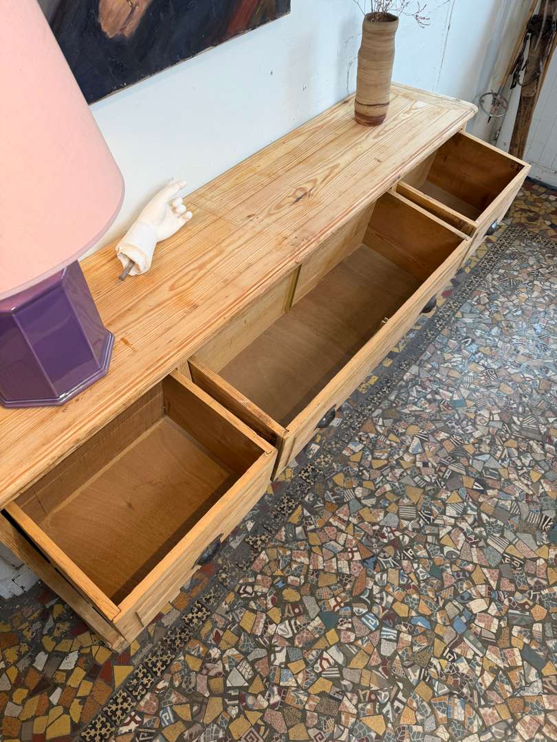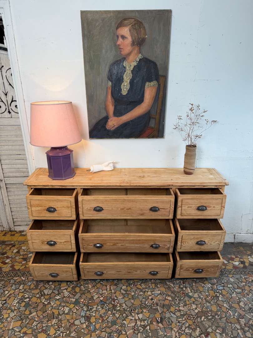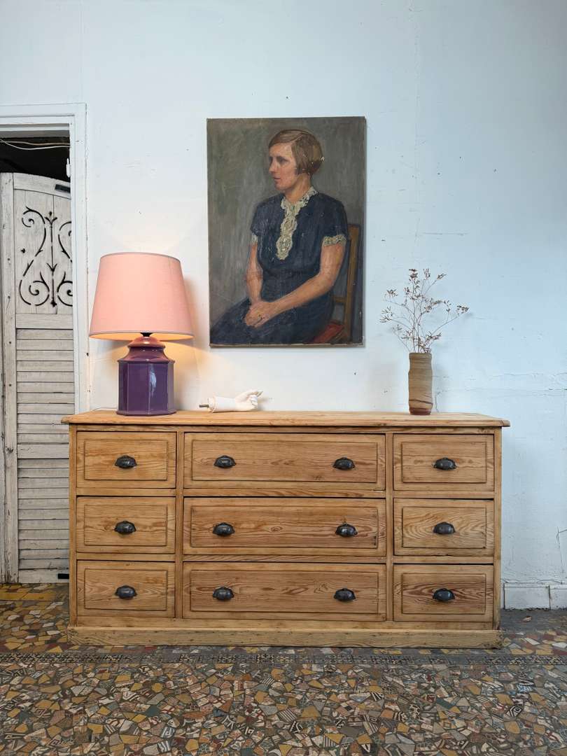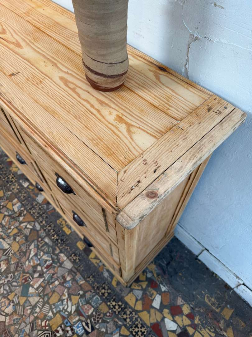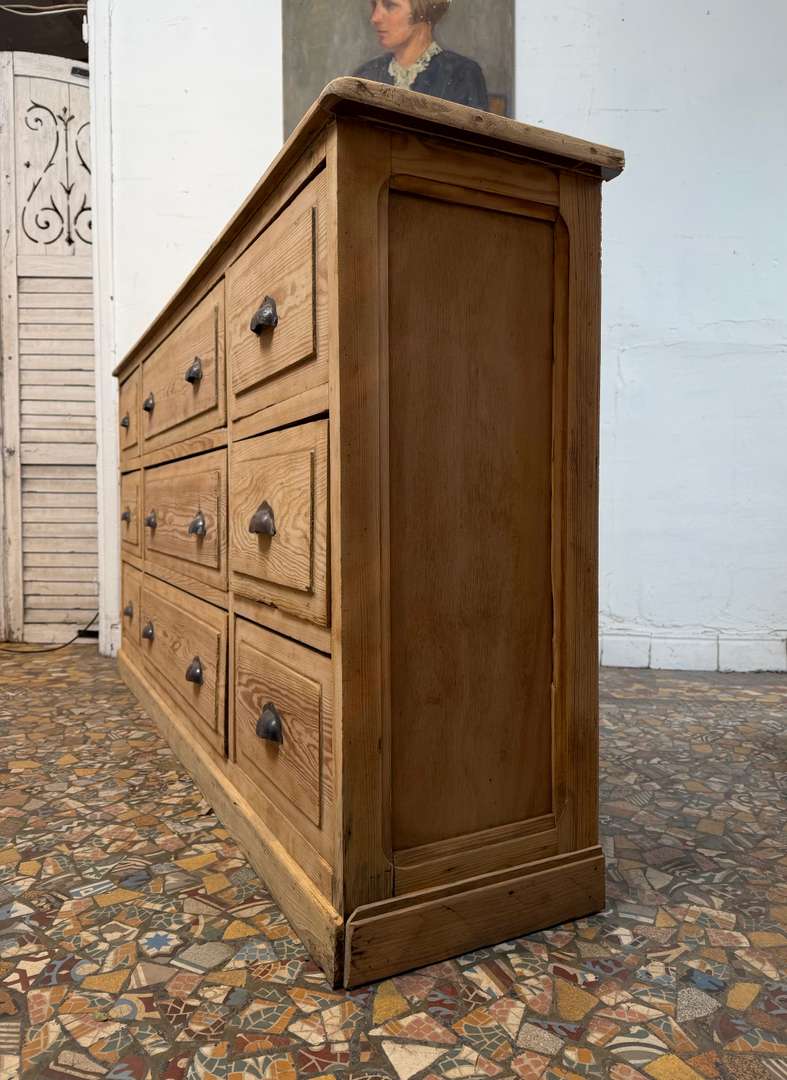 Ancien meuble à tiroirs en sapin, au format étroit. Beau volume de rangement, lignes simples et patine naturelle.