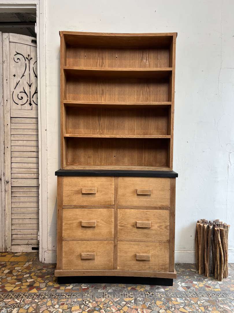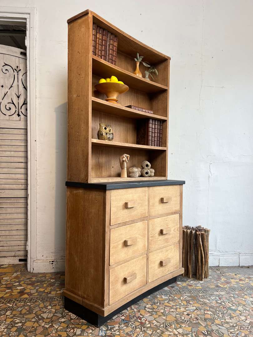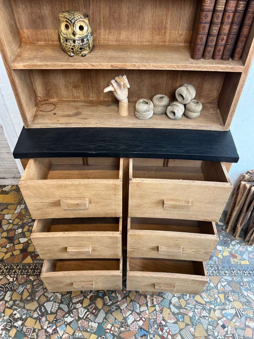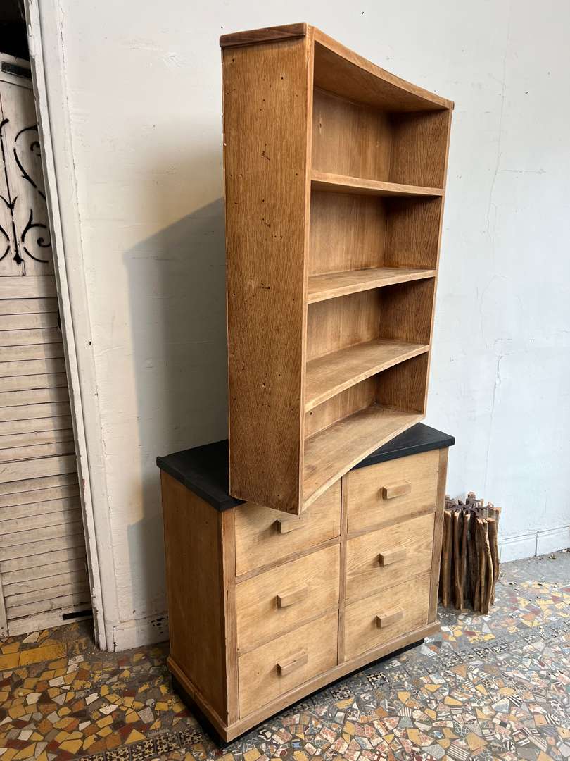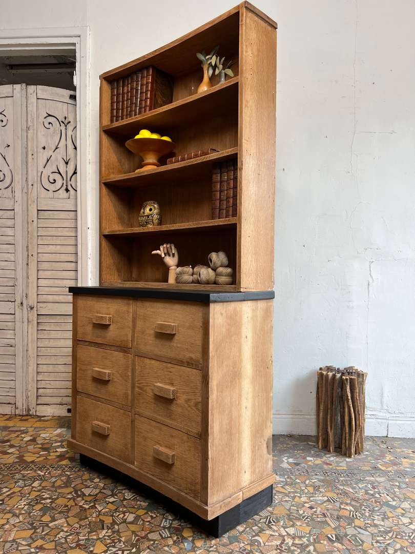 Ancien meuble d’atelier des années 50, composé de deux parties : une partie basse à tiroirs et une partie haute à étagères. Il est réalisé en chêne et contreplaqué chêne, avec une belle ligne légèrement incurvée qui lui donne tout son caractère. Un meuble original et fonctionnel, parfait pour une pièce de vie, un bureau ou un atelier.