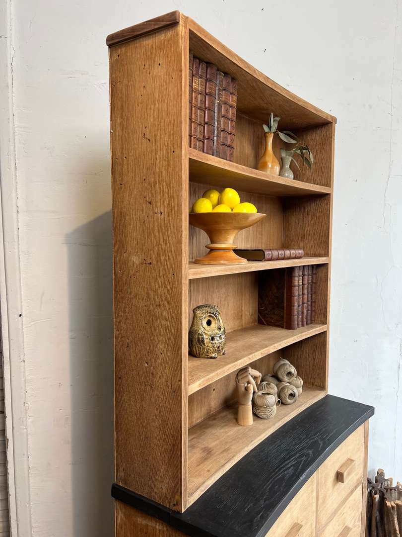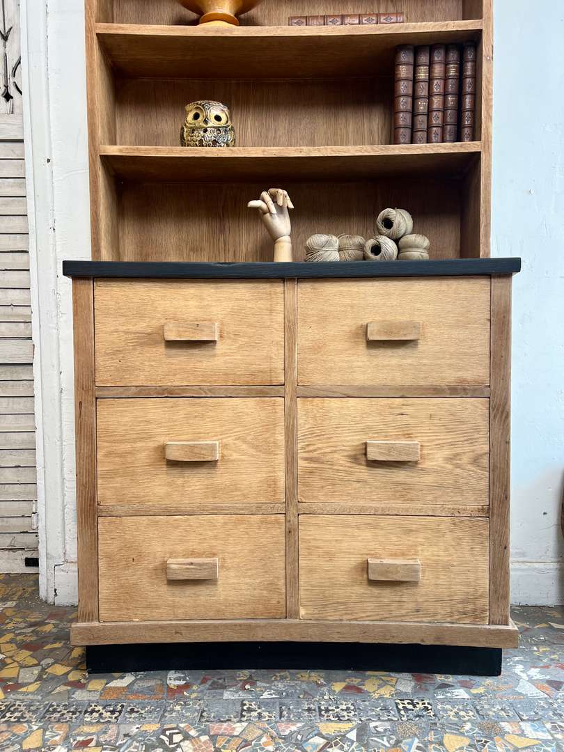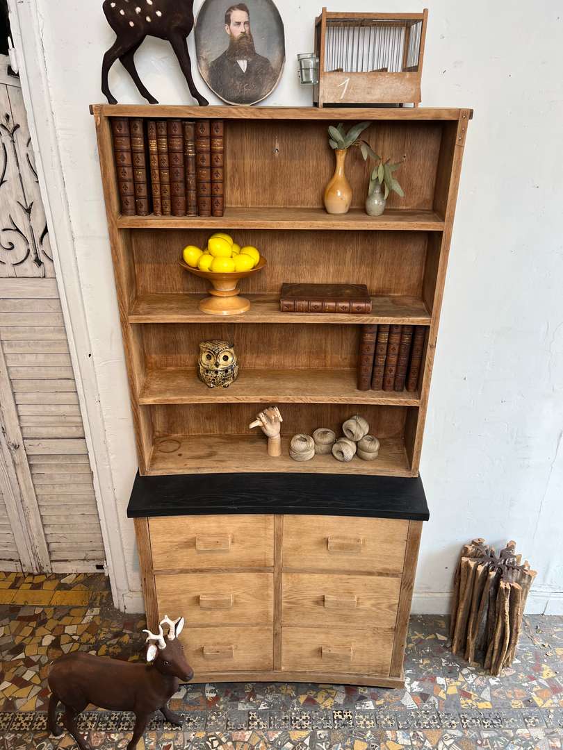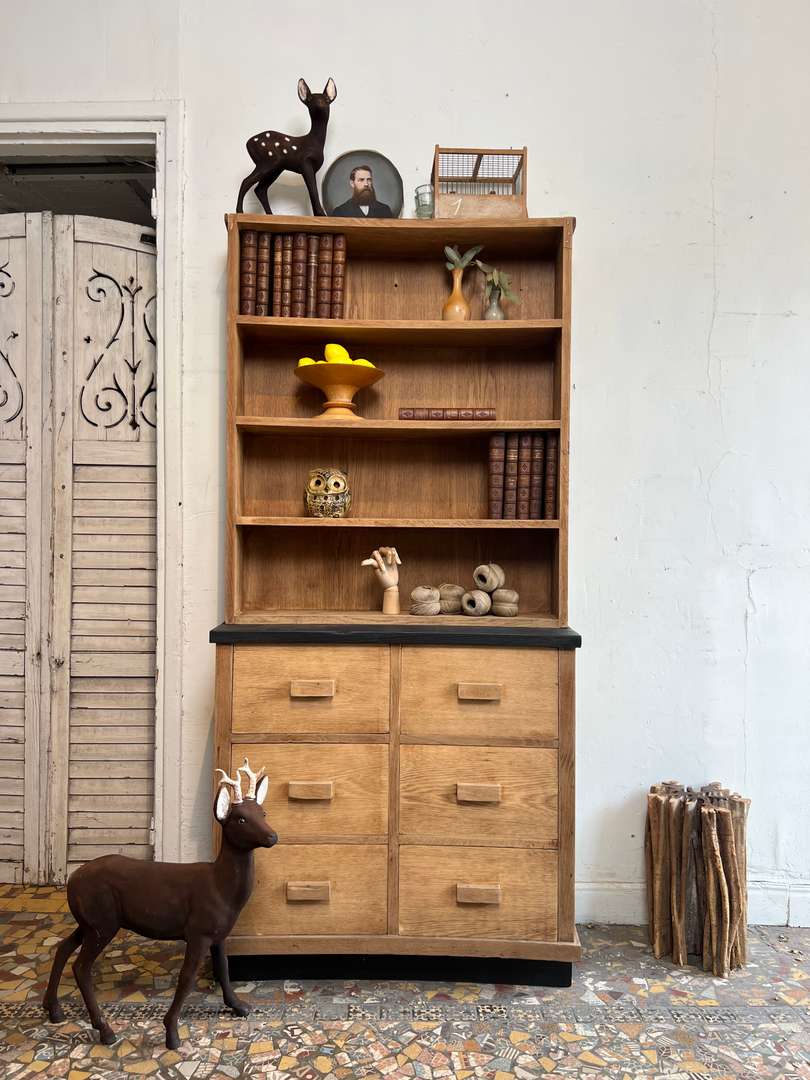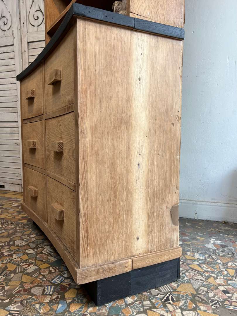 Ancien meuble d’atelier des années 50, composé de deux parties : une partie basse à tiroirs et une partie haute à étagères. Il est réalisé en chêne et contreplaqué chêne, avec une belle ligne légèrement incurvée qui lui donne tout son caractère. Un meuble original et fonctionnel, parfait pour une pièce de vie, un bureau ou un atelier.