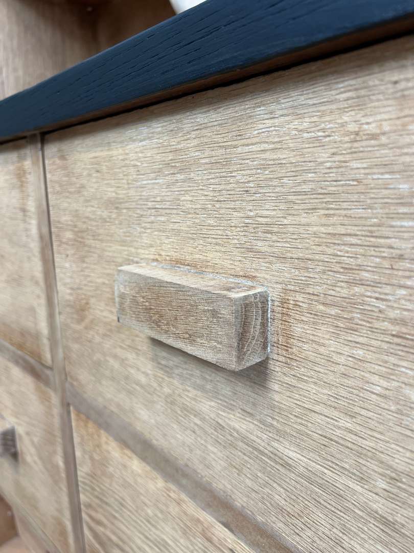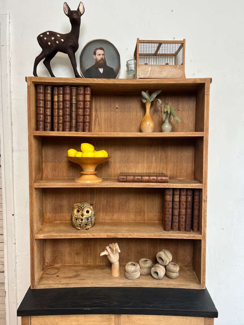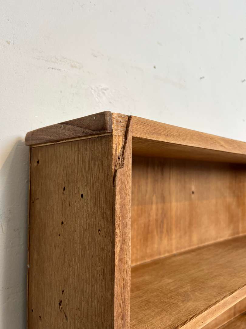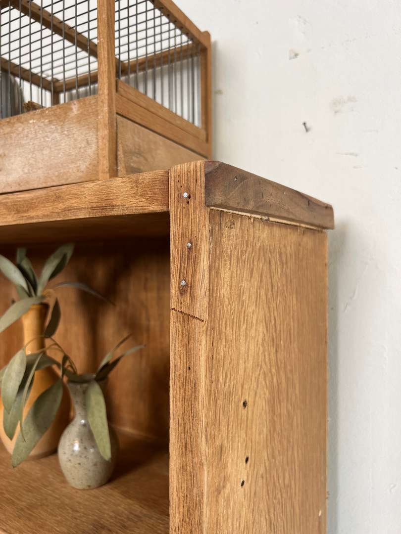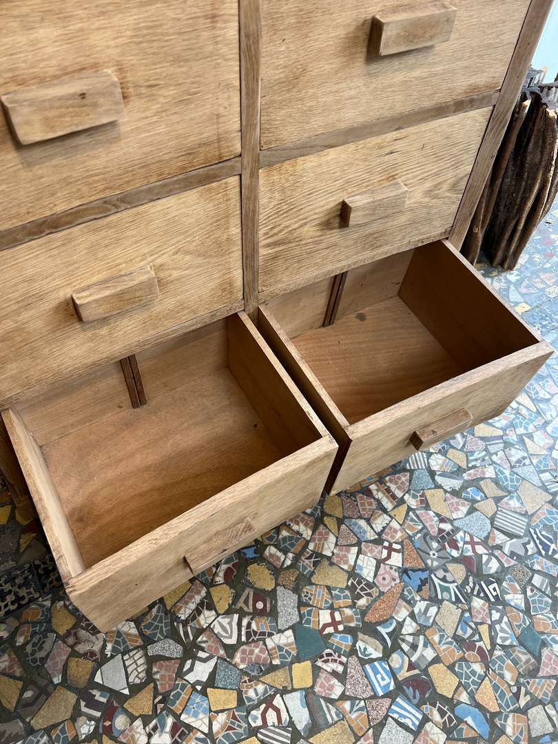 Ancien meuble d’atelier des années 50, composé de deux parties : une partie basse à tiroirs et une partie haute à étagères. Il est réalisé en chêne et contreplaqué chêne, avec une belle ligne légèrement incurvée qui lui donne tout son caractère. Un meuble original et fonctionnel, parfait pour une pièce de vie, un bureau ou un atelier.