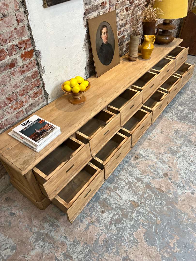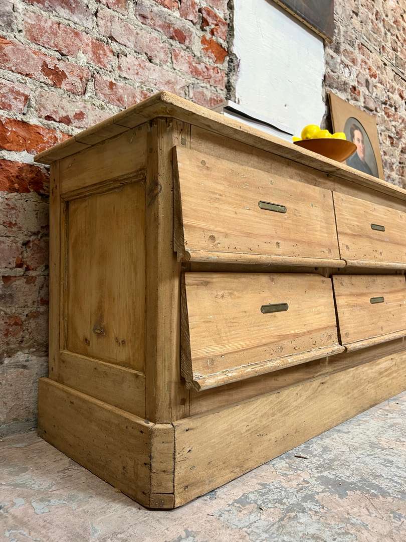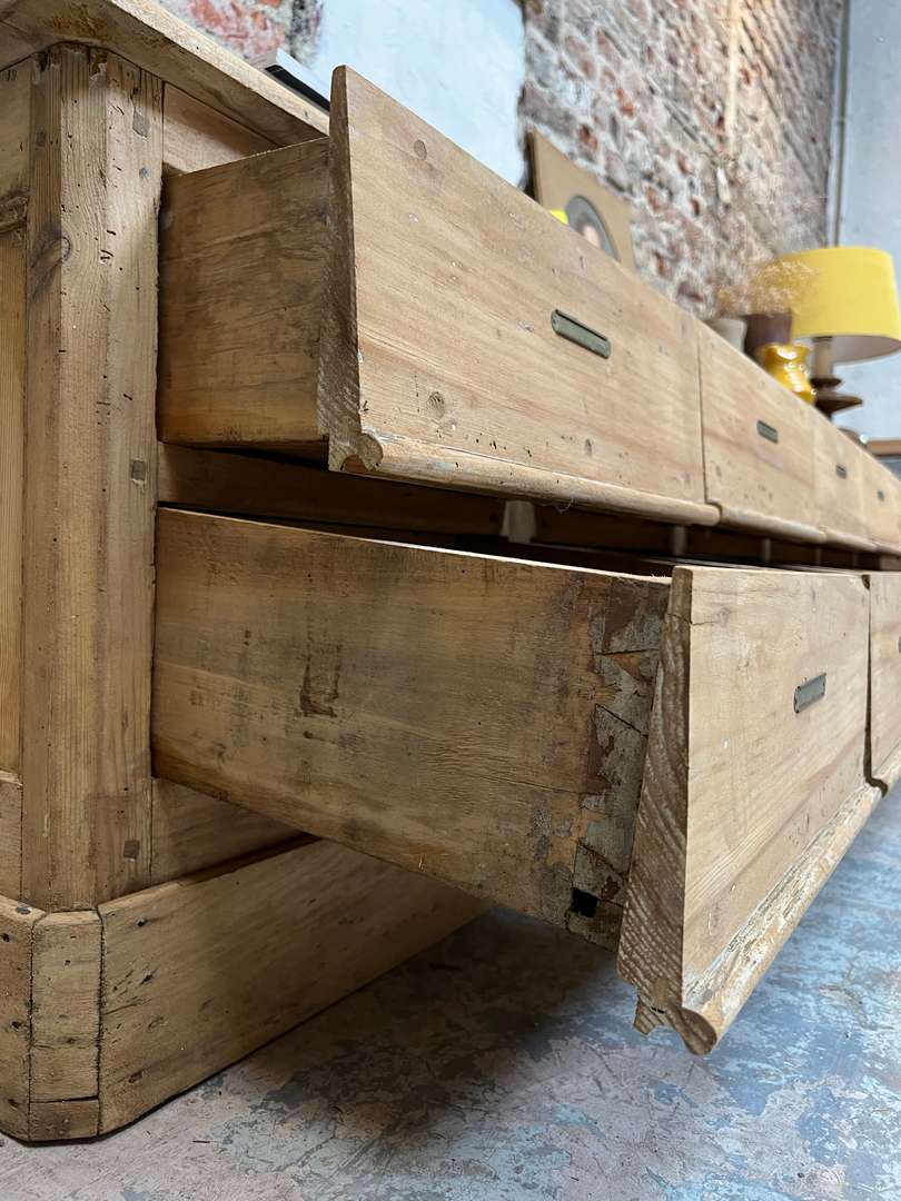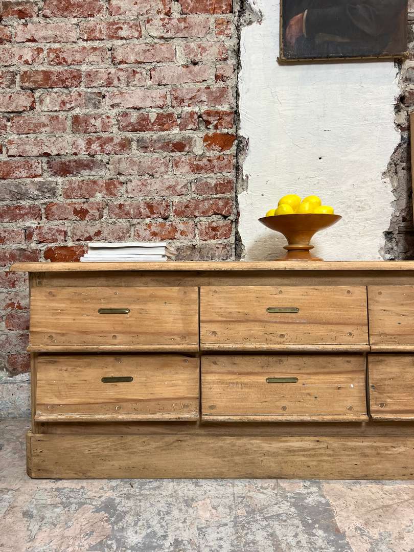 Beau meuble bas en sapin et peuplier datant du début du XXe siècle. Il est composé de nombreux tiroirs montés à queues d’aronde, chacun équipé d’une plaque en laiton et d’une discrète poignée ronde. Un meuble de rangement pratique, idéal en enfilade ou en meuble TV.