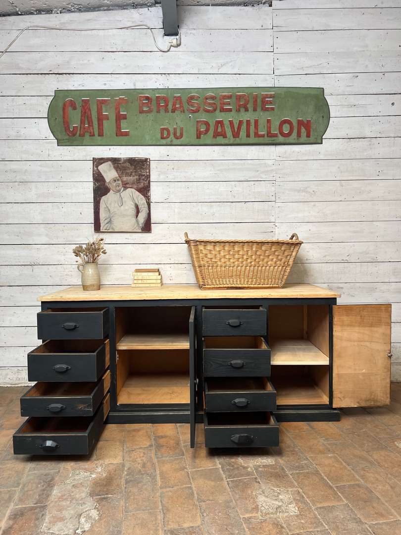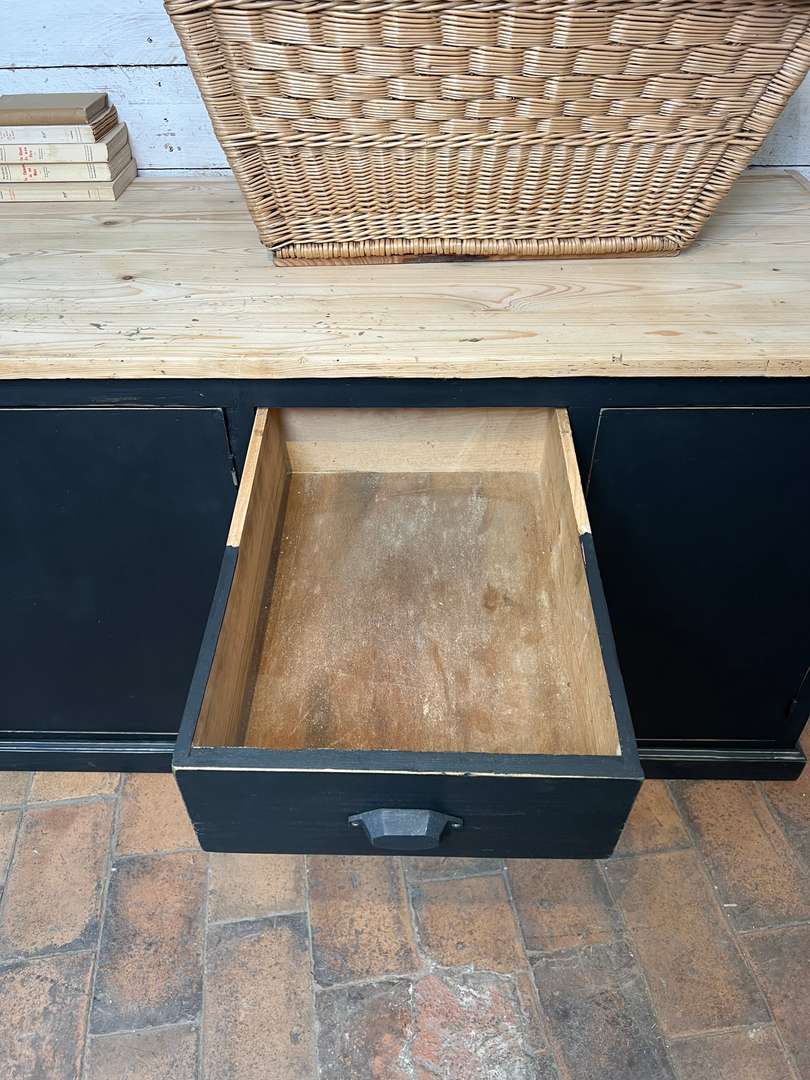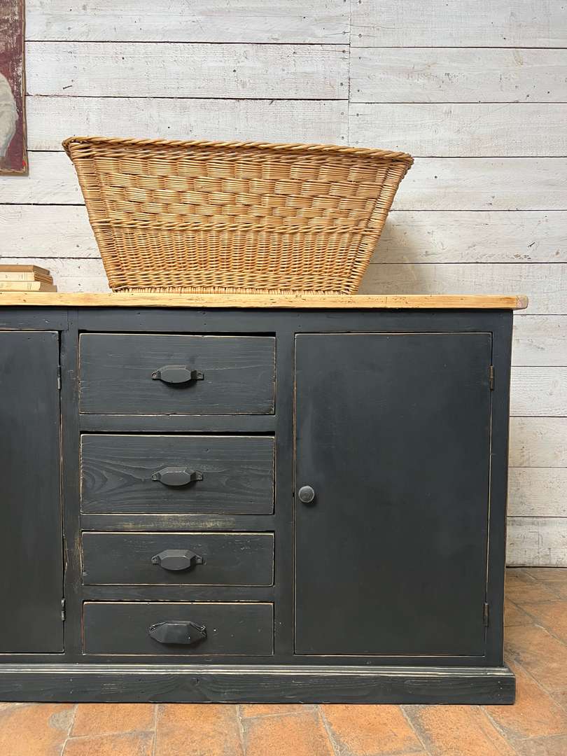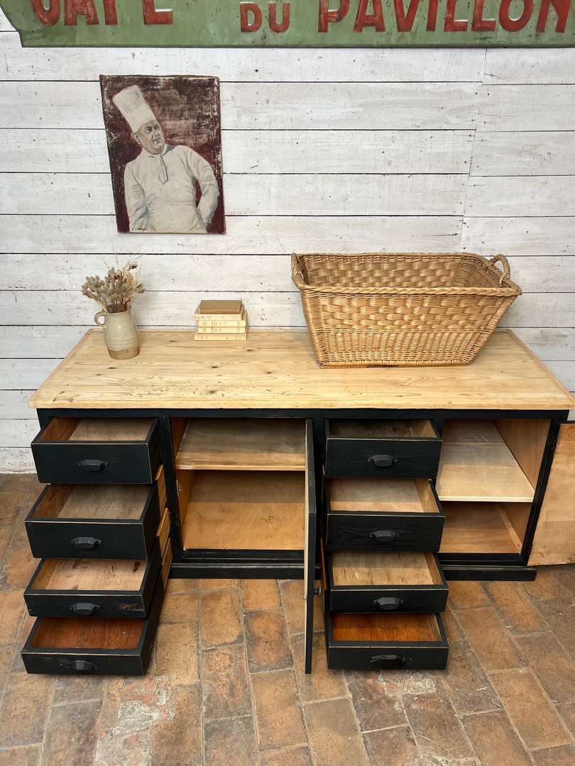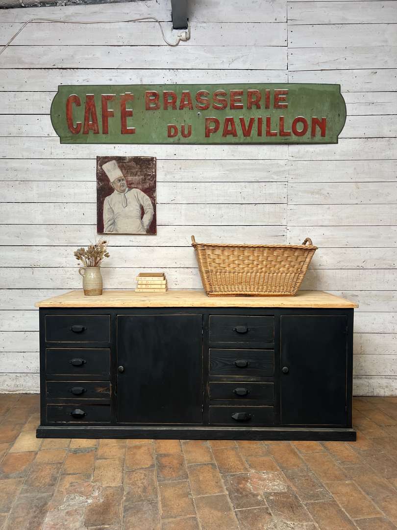 Ancien meuble de métier en sapin, peint en noir avec un plateau en bois brut. Il est composé de tiroirs et de portes offrant de beaux espaces de rangement. Son format et son allure sobre lui permettent de s’intégrer facilement dans un intérieur contemporain, en meuble bas ou en meuble TV.