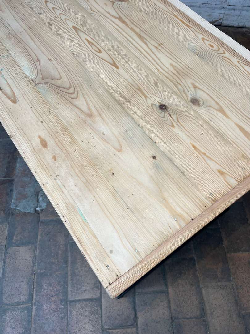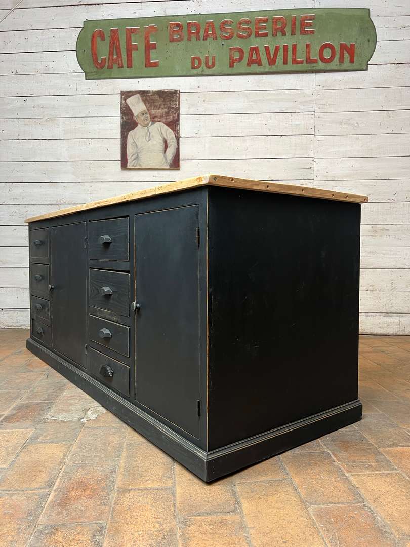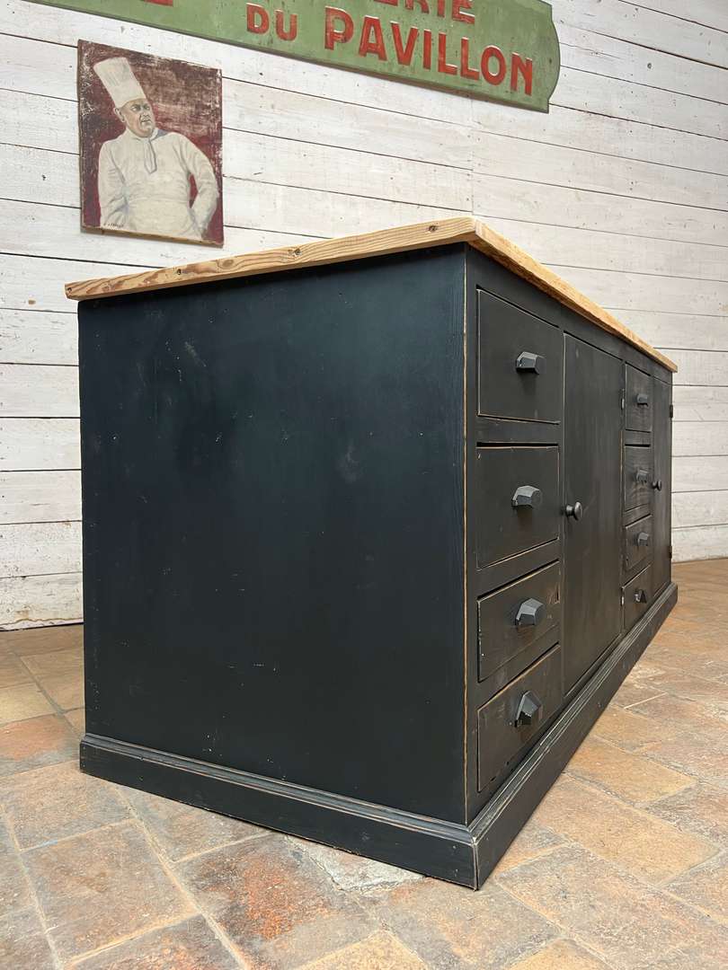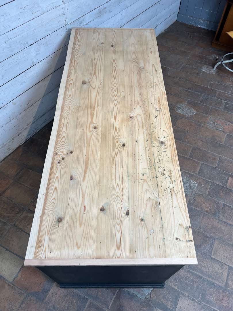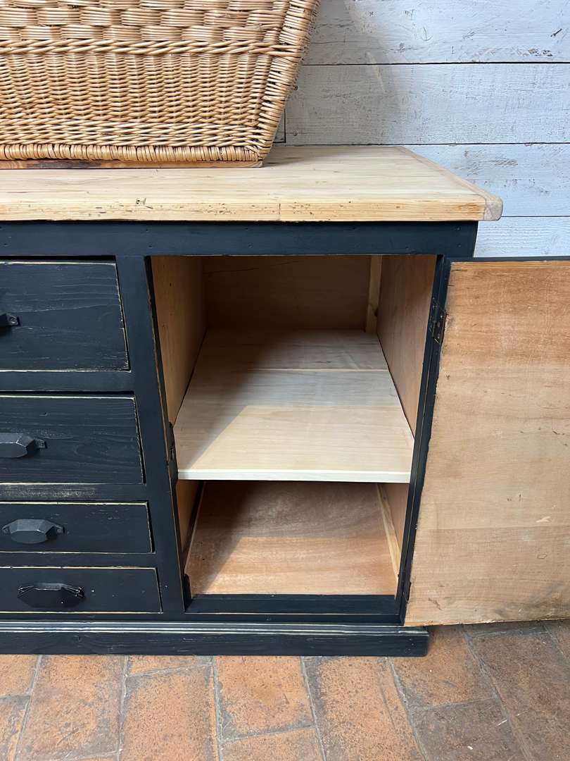 Ancien meuble de métier en sapin, peint en noir avec un plateau en bois brut. Il est composé de tiroirs et de portes offrant de beaux espaces de rangement. Son format et son allure sobre lui permettent de s’intégrer facilement dans un intérieur contemporain, en meuble bas ou en meuble TV.