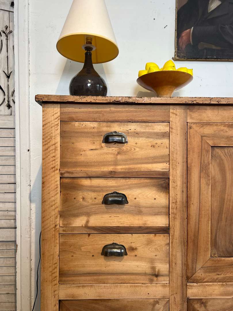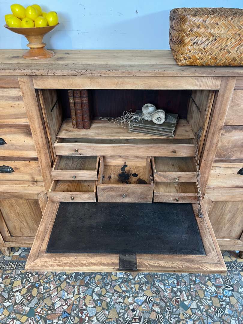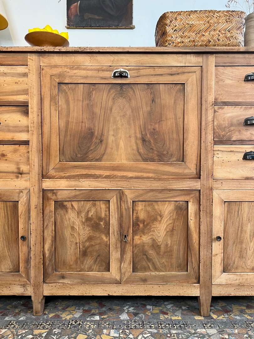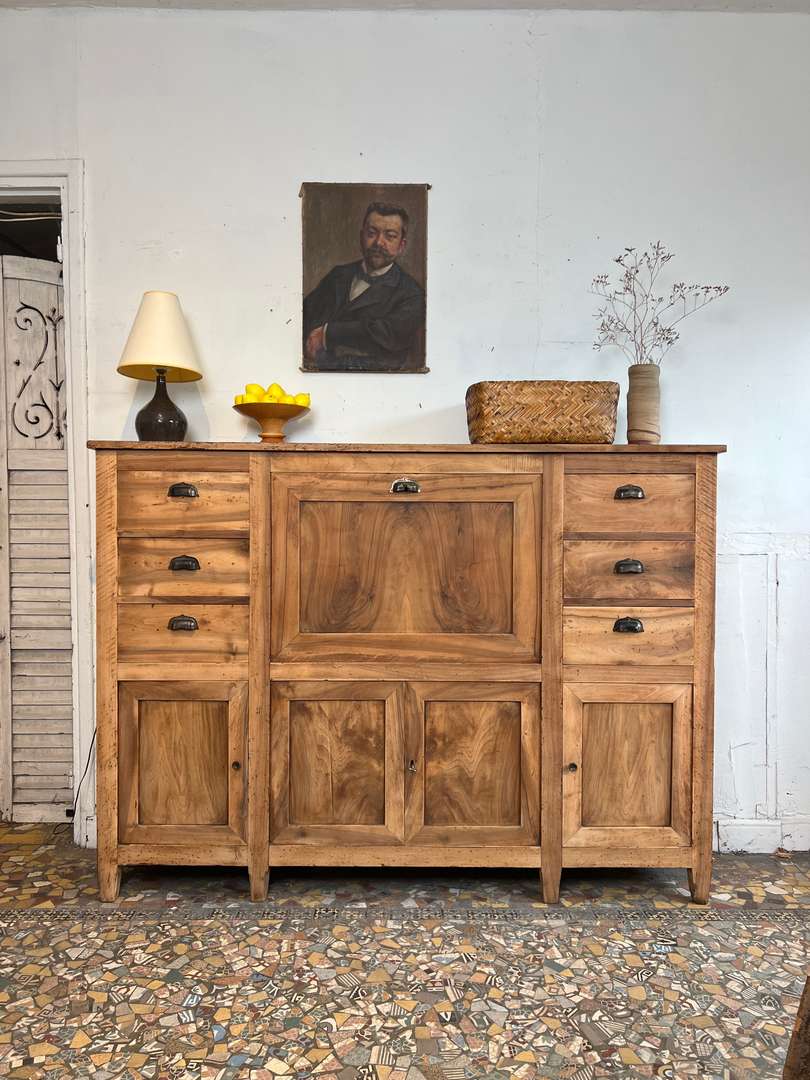 Ancien meuble secrétaire en noyer datant du début du XXe siècle. Il se compose de plusieurs tiroirs latéraux et d’un abattant central ouvrant sur un espace secrétaire avec petits tiroirs et rangements.