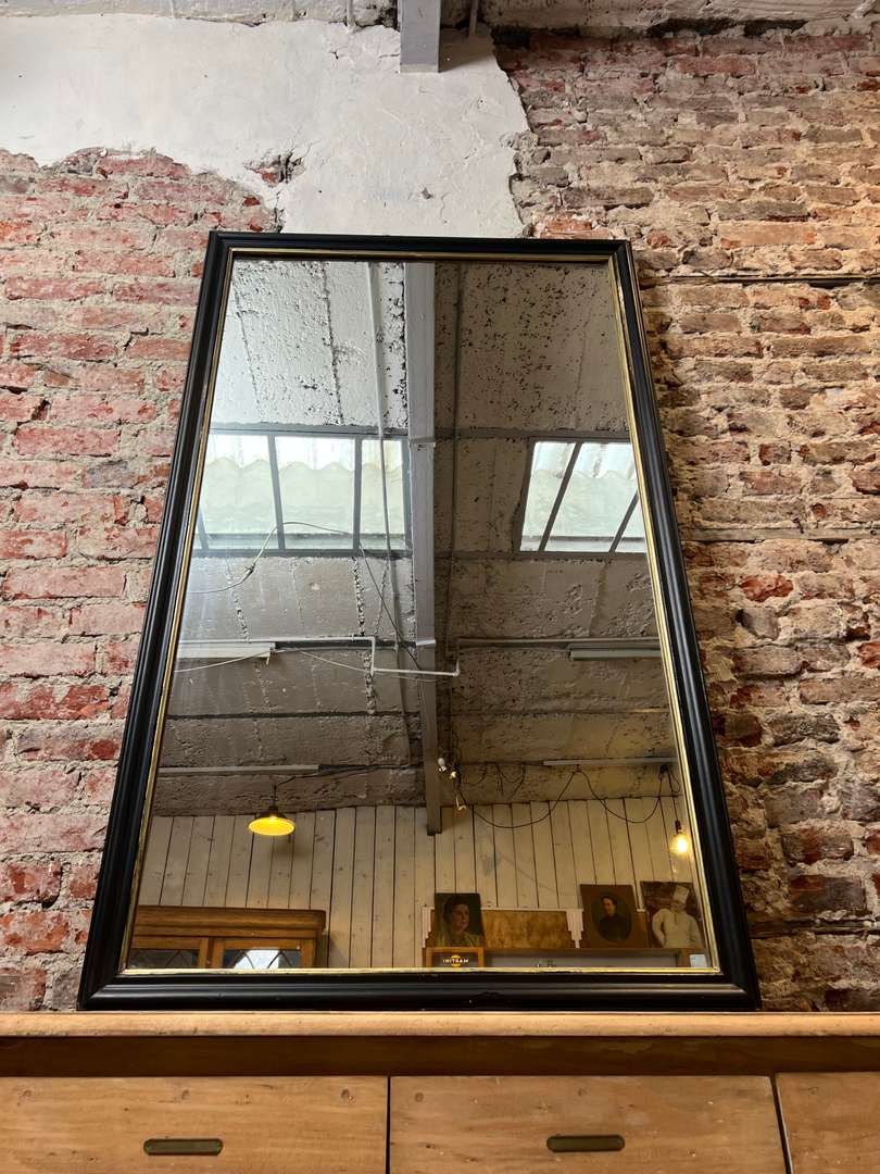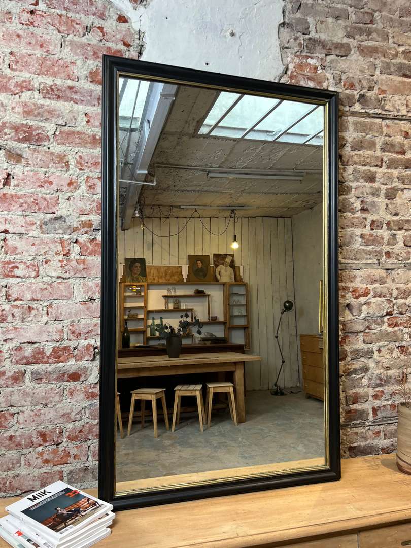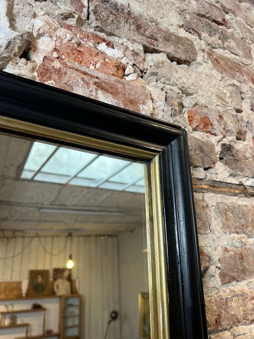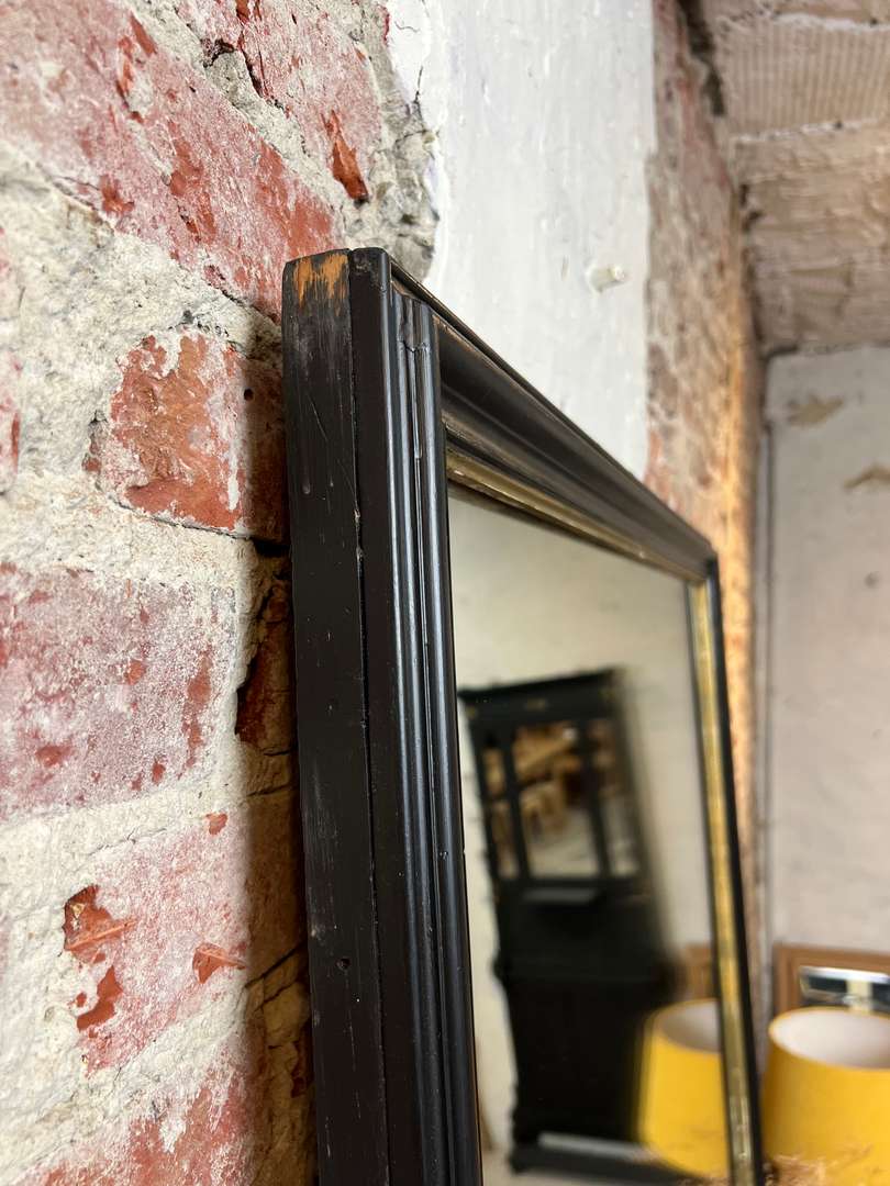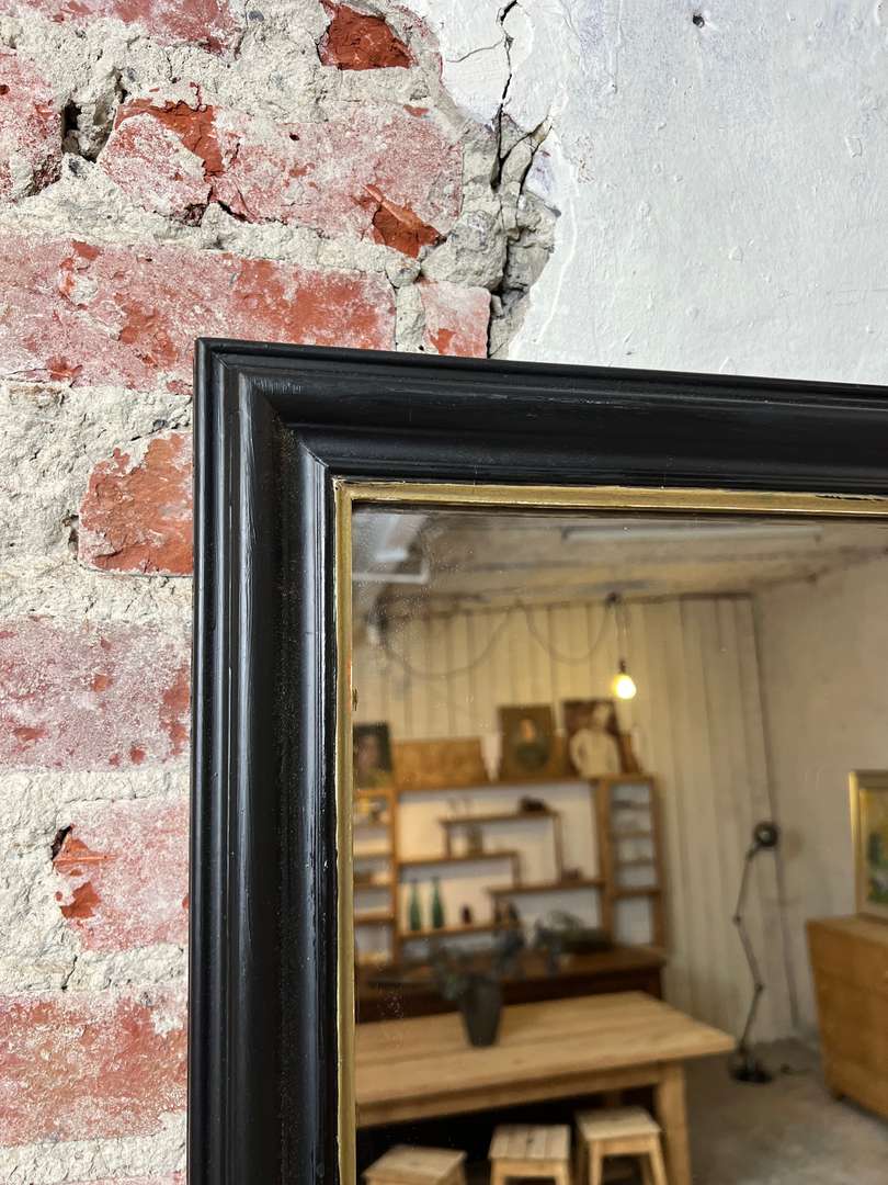 Grand miroir ancien du début du XXe siècle, doté d’une glace au nitrate d’argent. Cadre en bois noir, souligné d’un contour doré, et fond en bois d’origine. Un modèle intemporel, idéal au-dessus d’une cheminée, d’un buffet ou posé au sol.