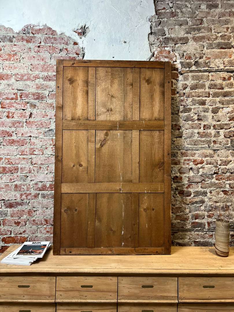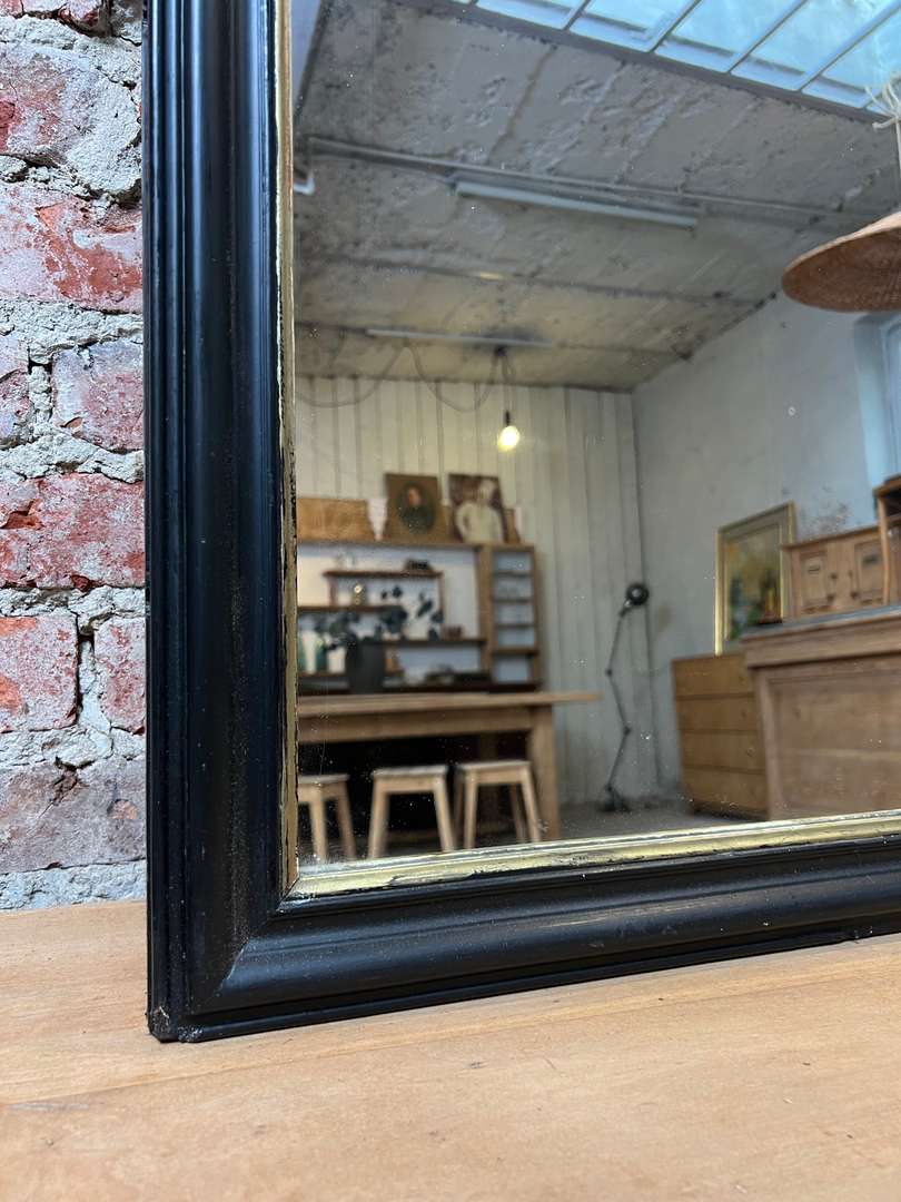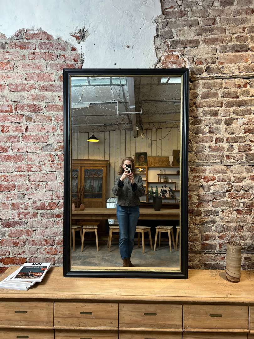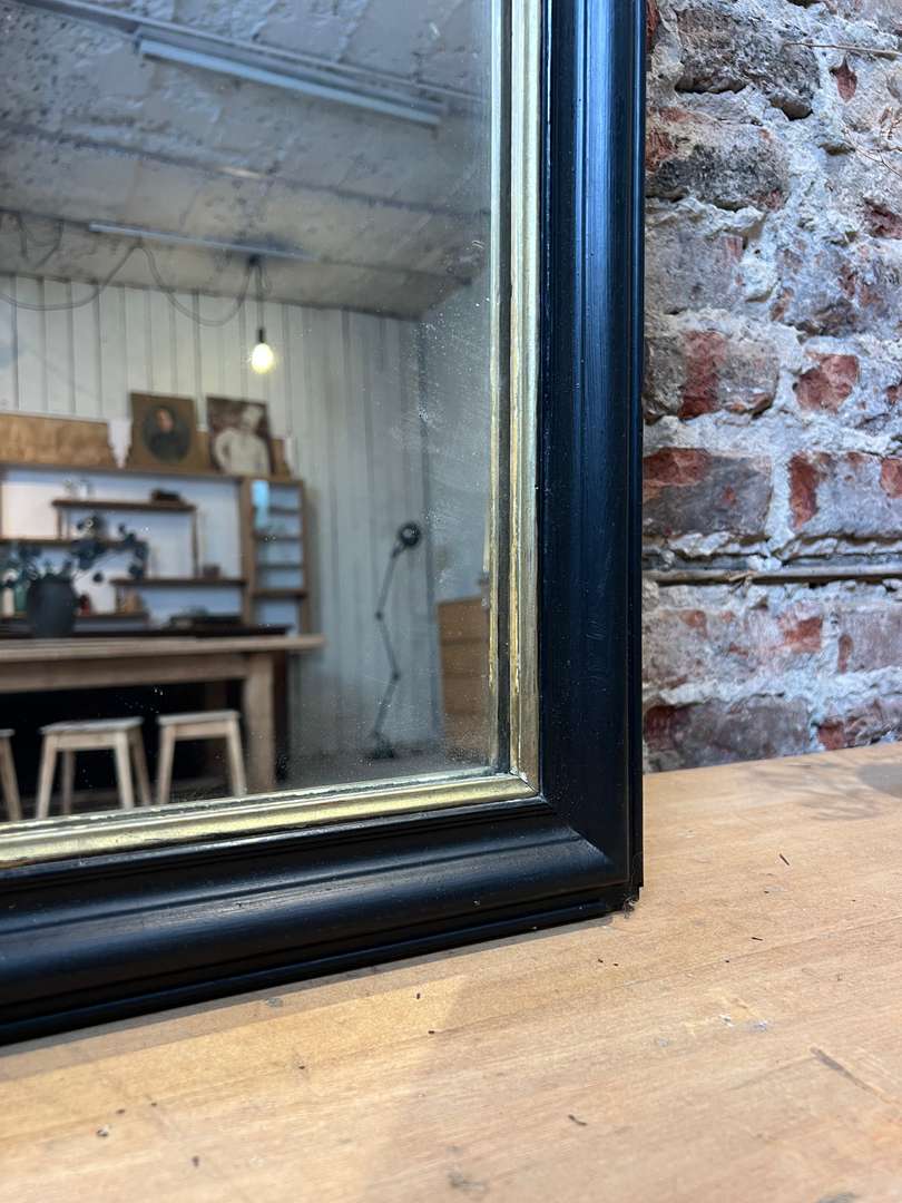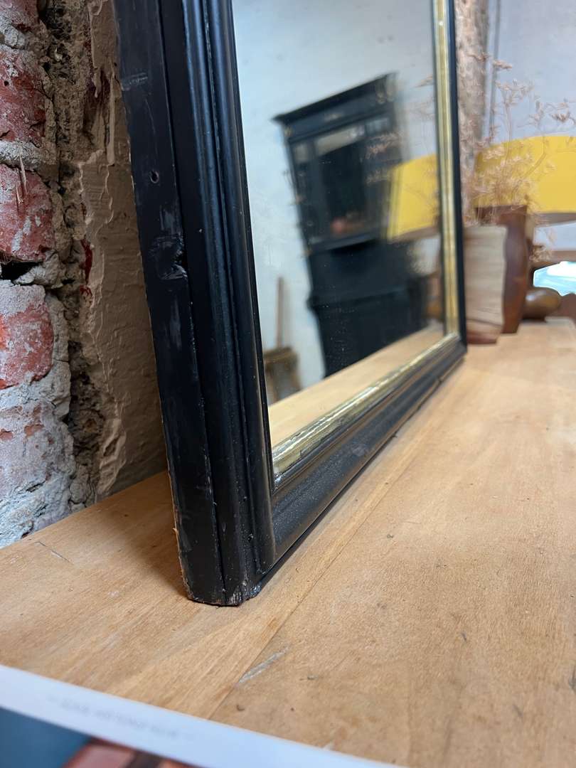 Grand miroir ancien du début du XXe siècle, doté d’une glace au nitrate d’argent. Cadre en bois noir, souligné d’un contour doré, et fond en bois d’origine. Un modèle intemporel, idéal au-dessus d’une cheminée, d’un buffet ou posé au sol.