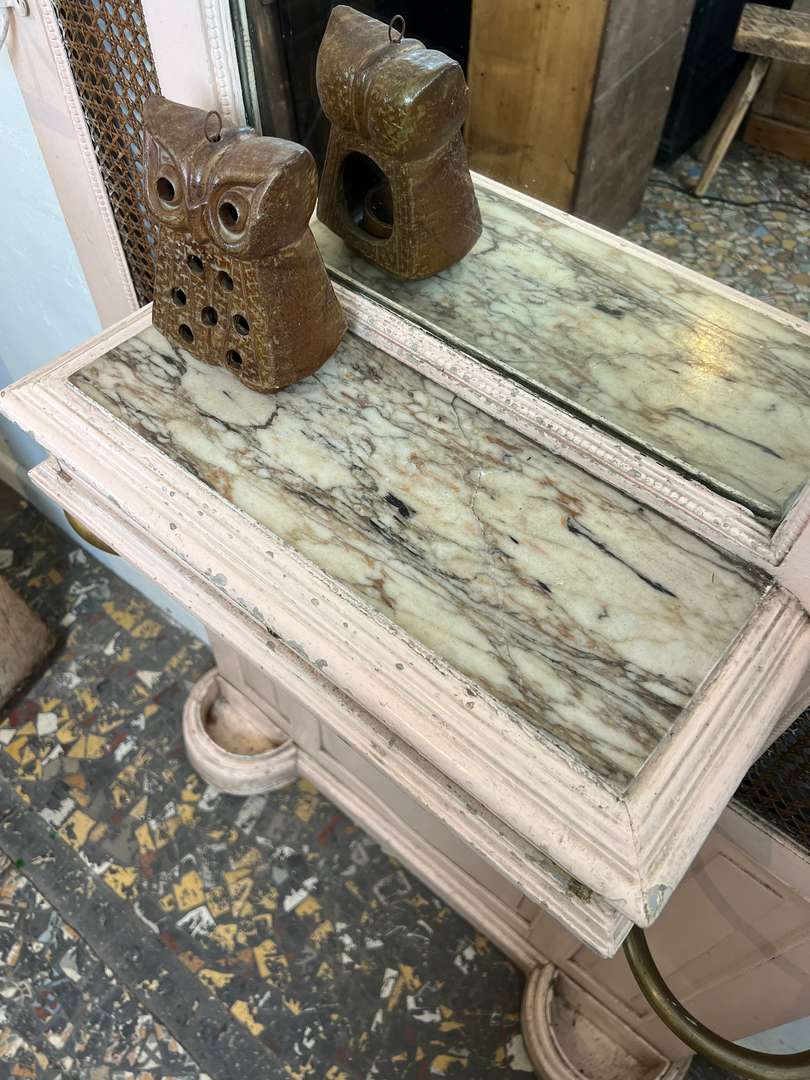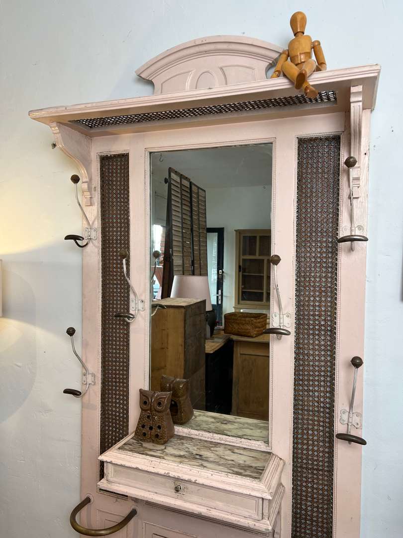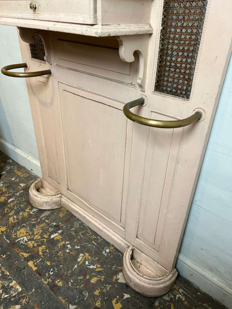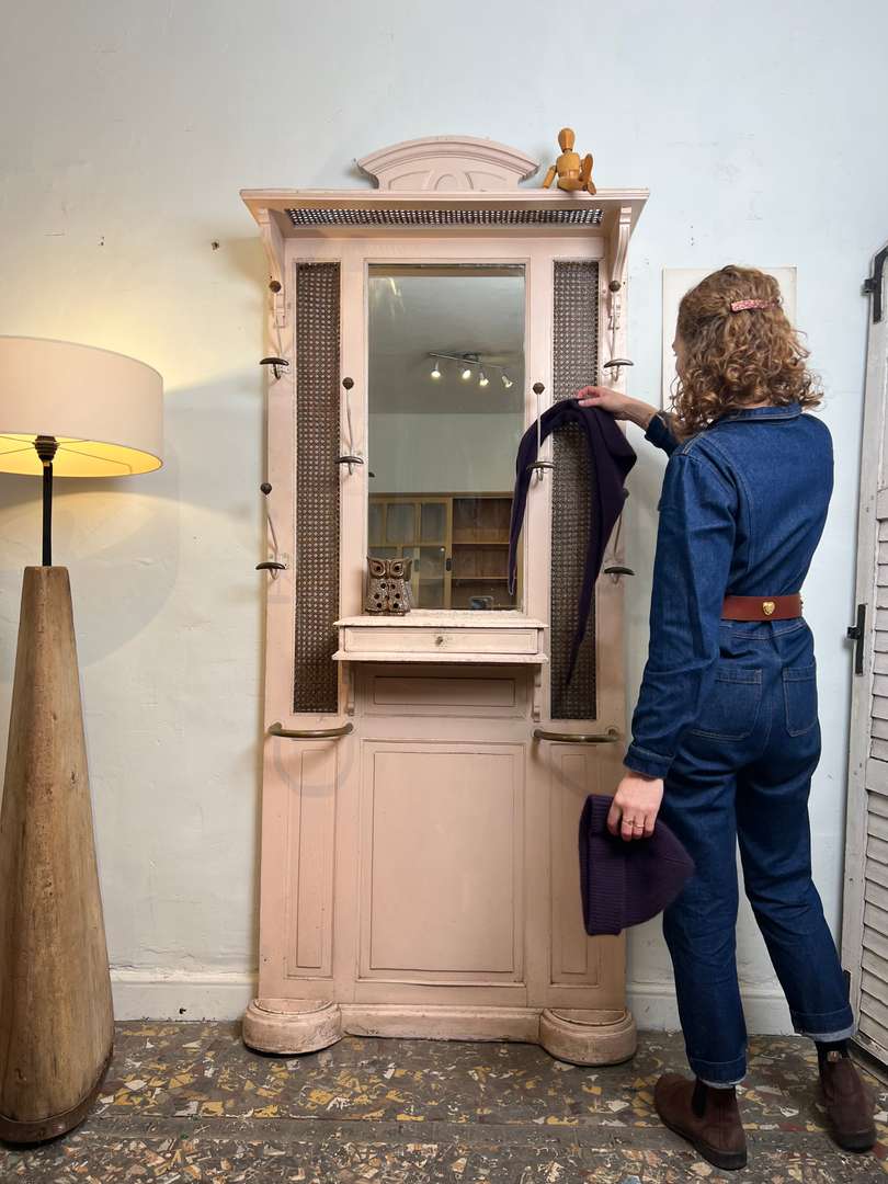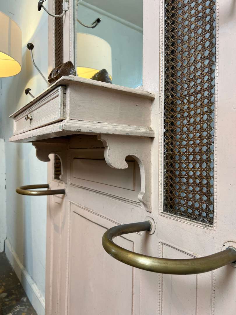 Élégant porte-manteau d’époque Napoléon III, en bois peint rose poudré. Miroir central biseauté, panneaux en cannage et nombreux crochets en métal. Tablette en marbre avec petit tiroir. Bases en métal prévues pour les parapluies. Belle patine ancienne, beaucoup de charme.