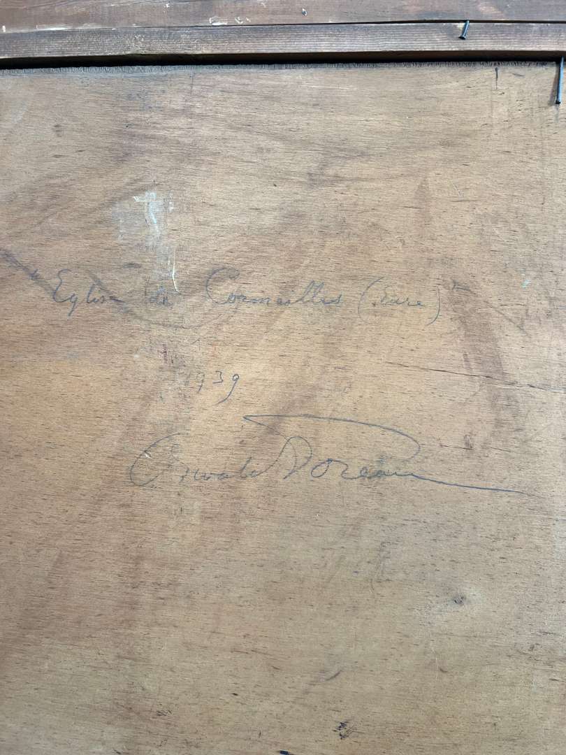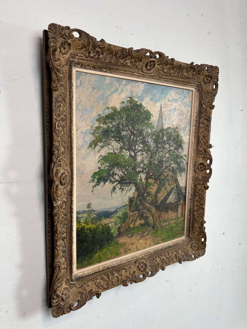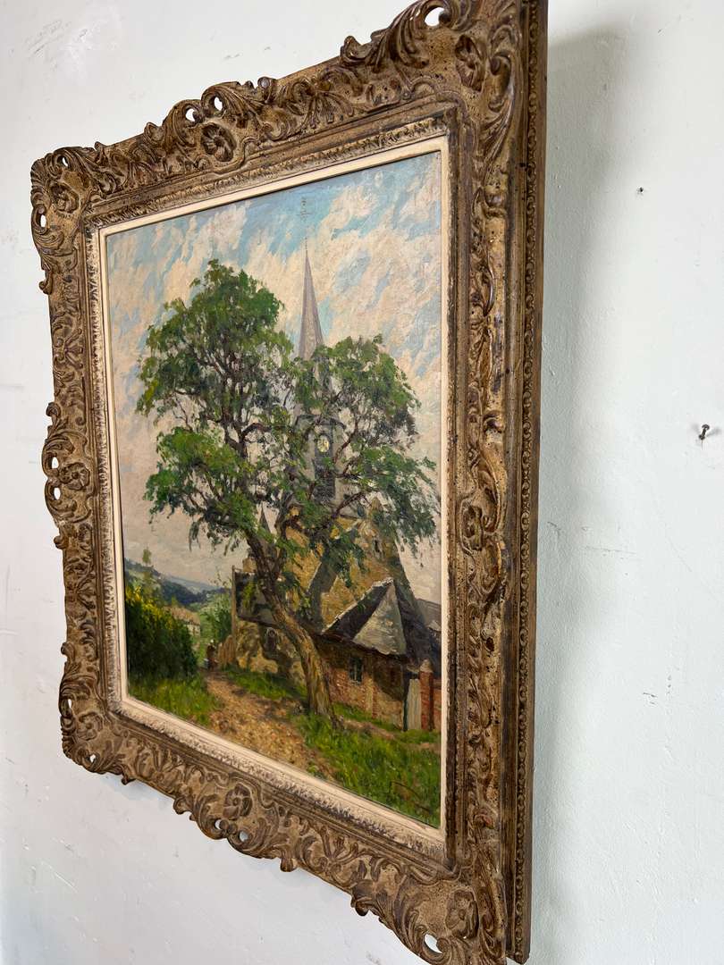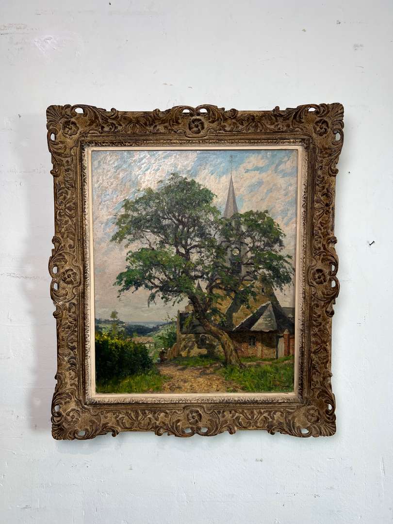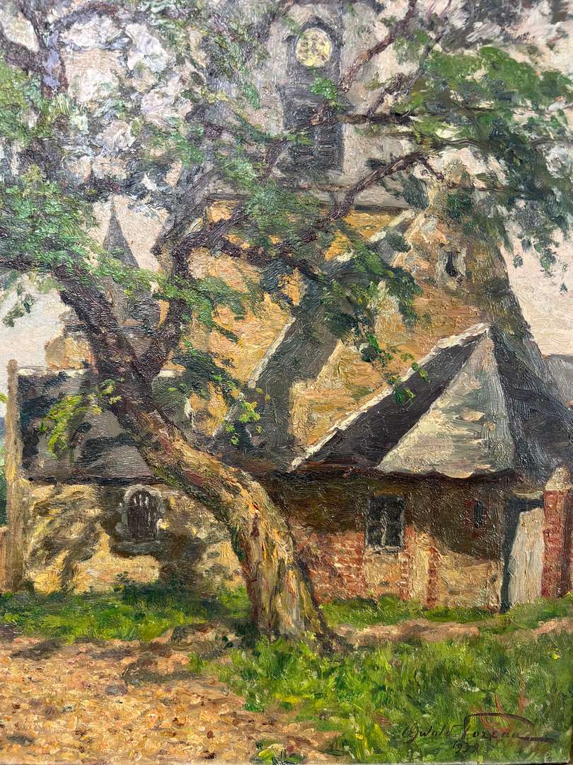 Huile sur toile représentant l’église de Cormeilles, dans l’Eure. La scène, datée de 1939 et signée par l’artiste, met en valeur un paysage verdoyant avec un chemin menant à l’église, son clocher et ses bâtiments attenants. Le tableau est présenté dans un cadre sculpté ancien.