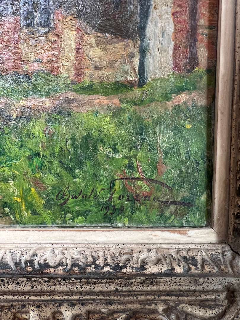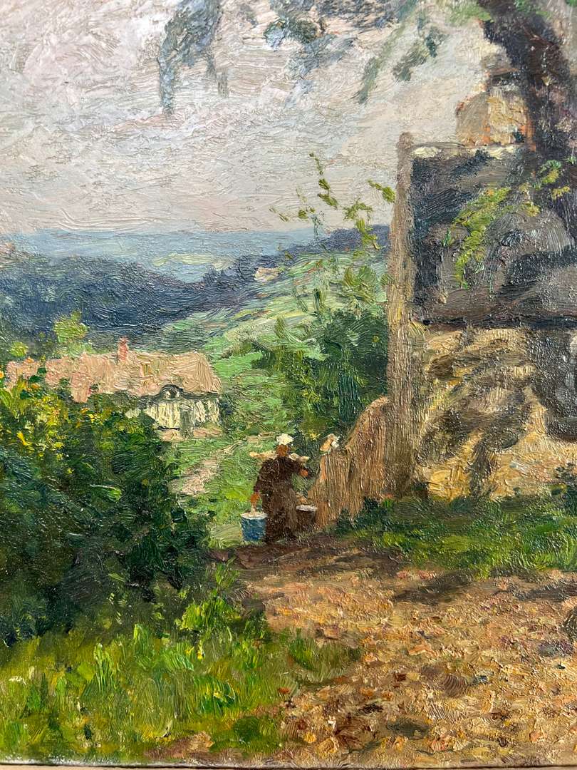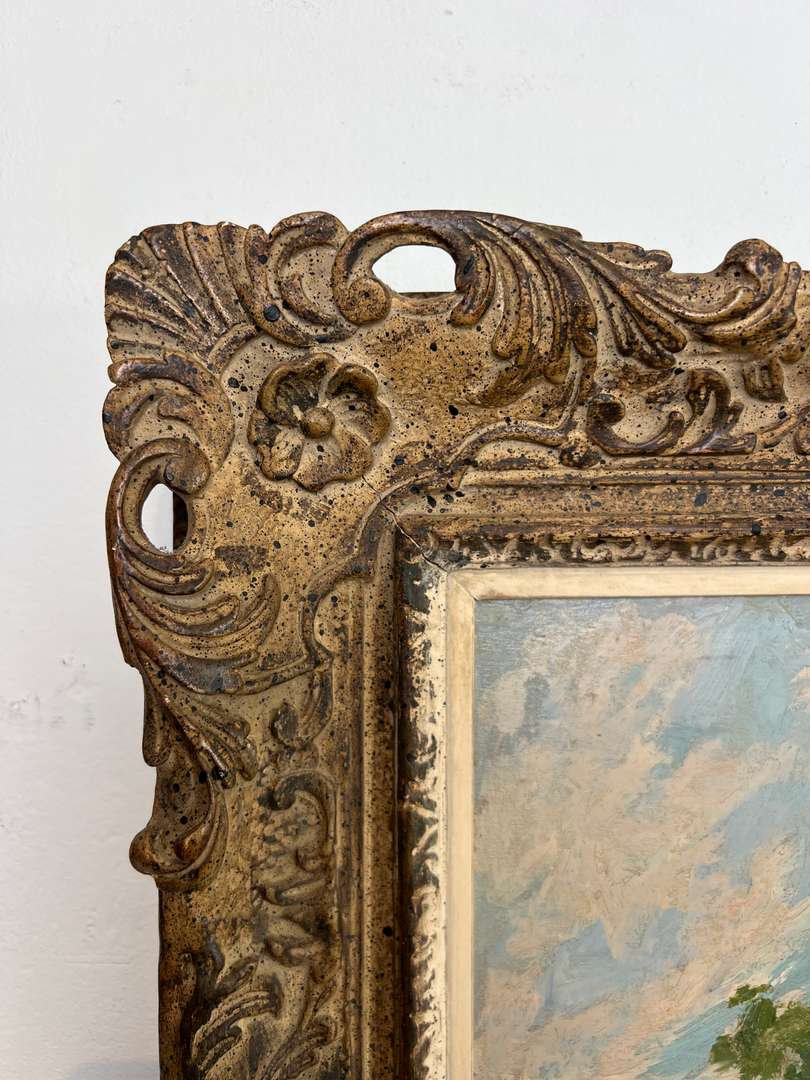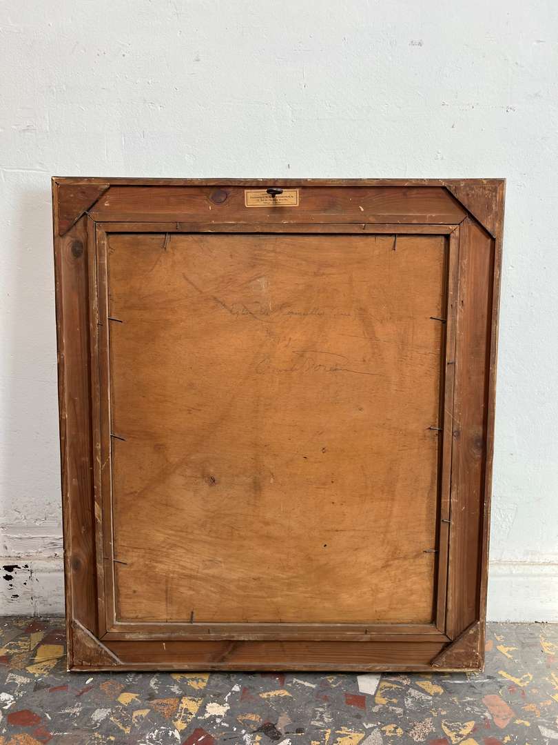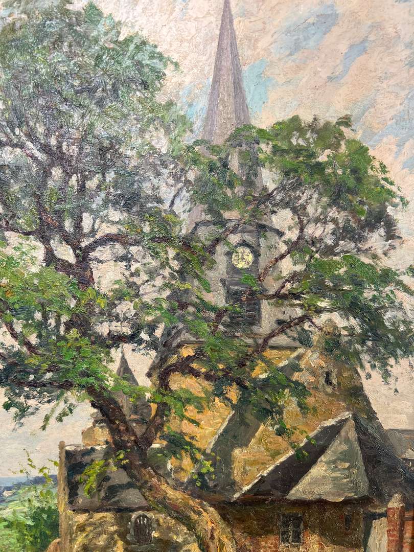 Huile sur toile représentant l’église de Cormeilles, dans l’Eure. La scène, datée de 1939 et signée par l’artiste, met en valeur un paysage verdoyant avec un chemin menant à l’église, son clocher et ses bâtiments attenants. Le tableau est présenté dans un cadre sculpté ancien.