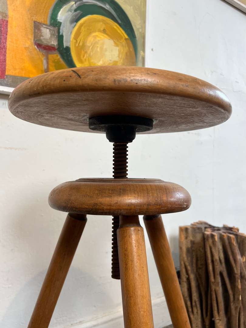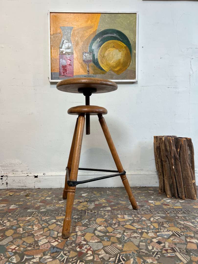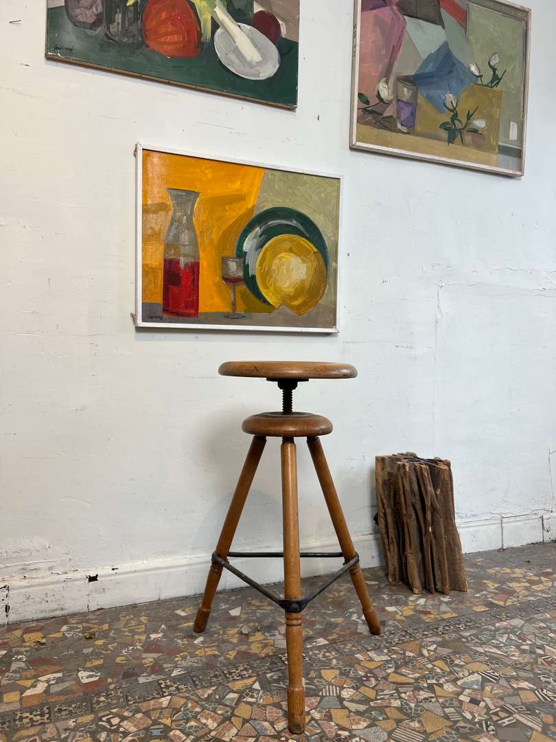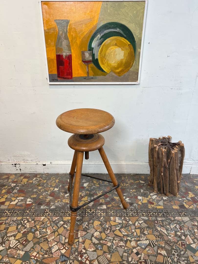 Ancien tabouret d’atelier en hêtre, réglable en hauteur grâce à son système à vis. Il repose sur trois pieds renforcés par une entretoise en métal, lui donnant une bonne stabilité. Une pièce authentique et fonctionnelle, idéale en siège d’appoint ou en décoration.