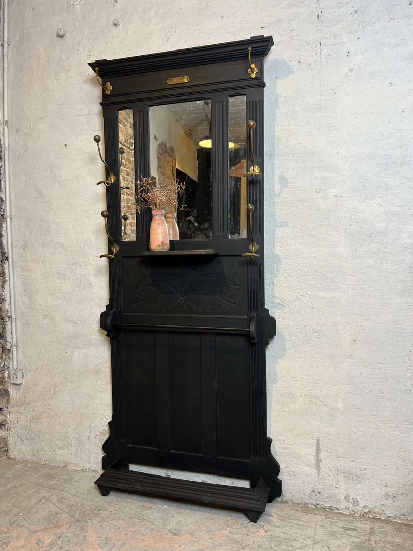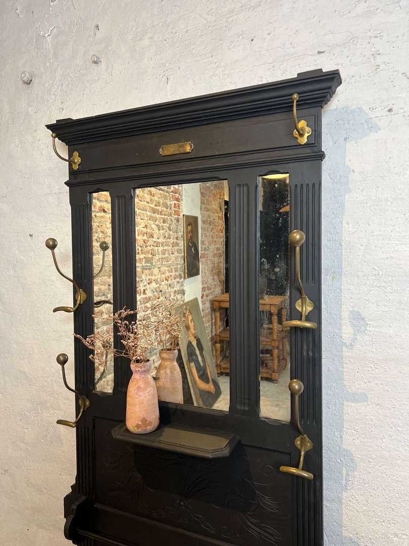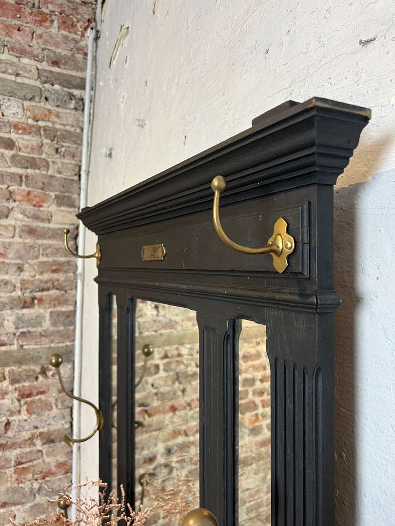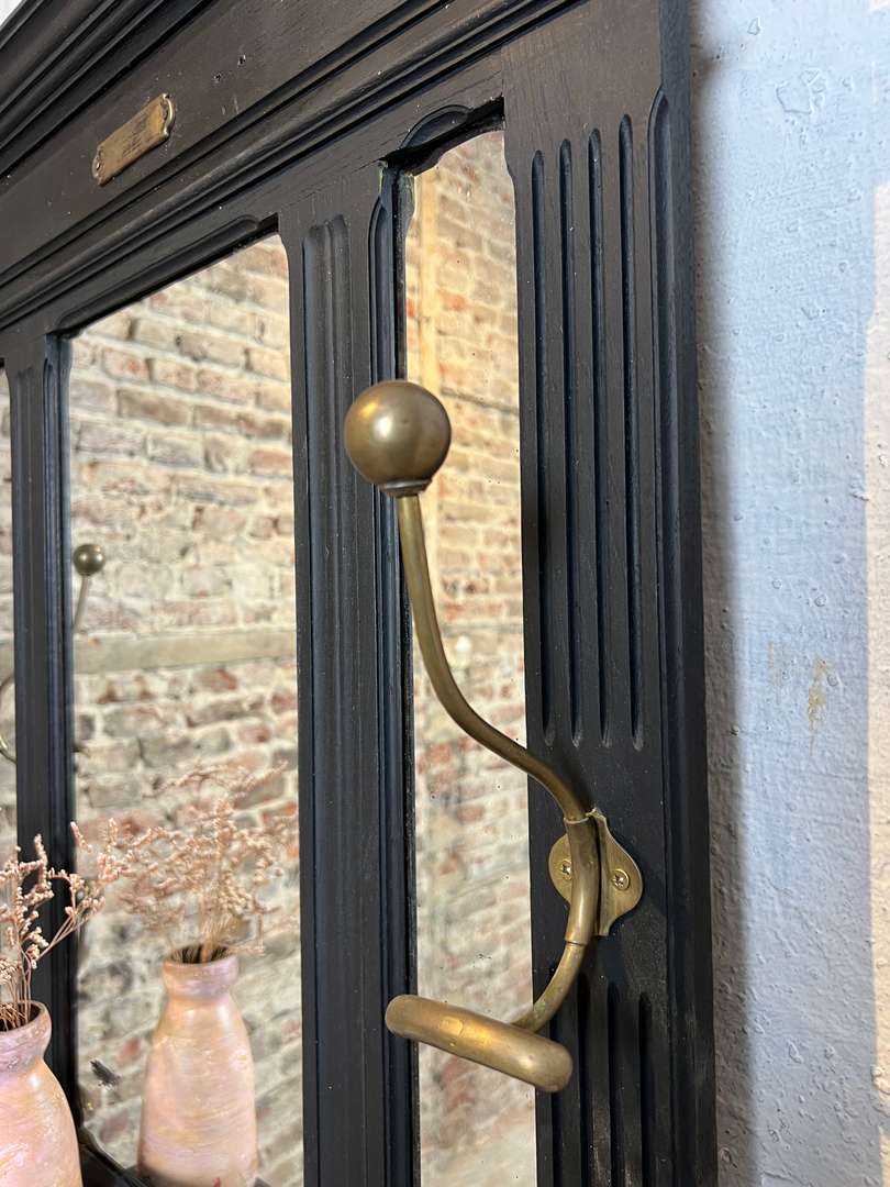 Ancien vestiaire mural en bois sculpté, peint en noir mat. Il est composé de plusieurs patères en laiton, d’un miroir ancien à trois sections et d’une petite tablette centrale. De jolis détails sculptés ornent la partie basse, et une tringle permet d’y déposer un parapluie ou une canne. Un bel élément de caractère, parfait dans une entrée pour allier praticité et élégance.