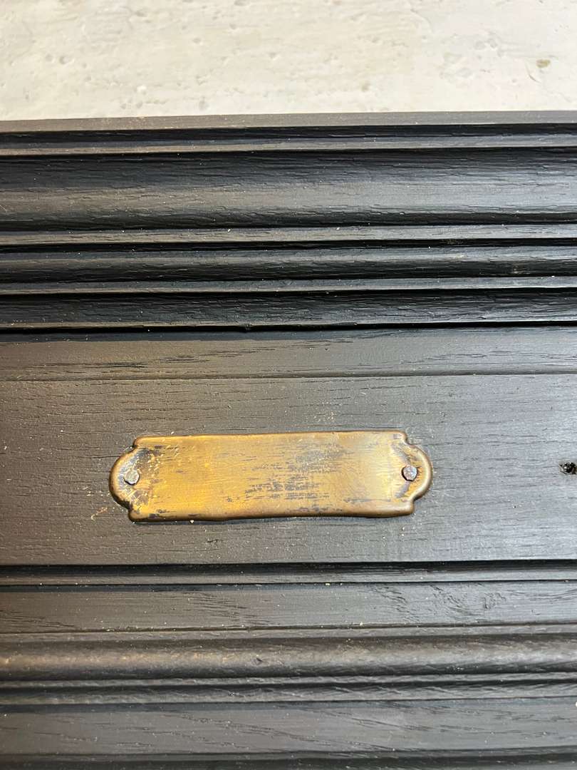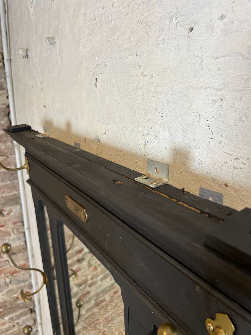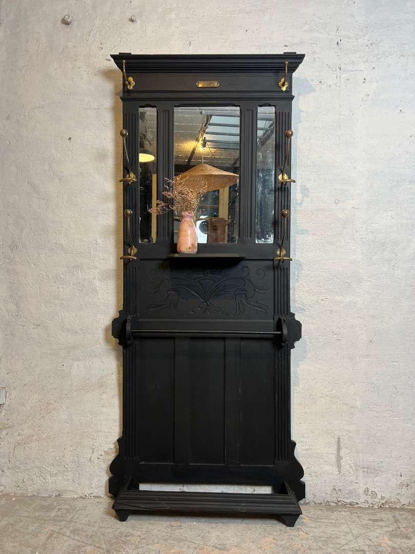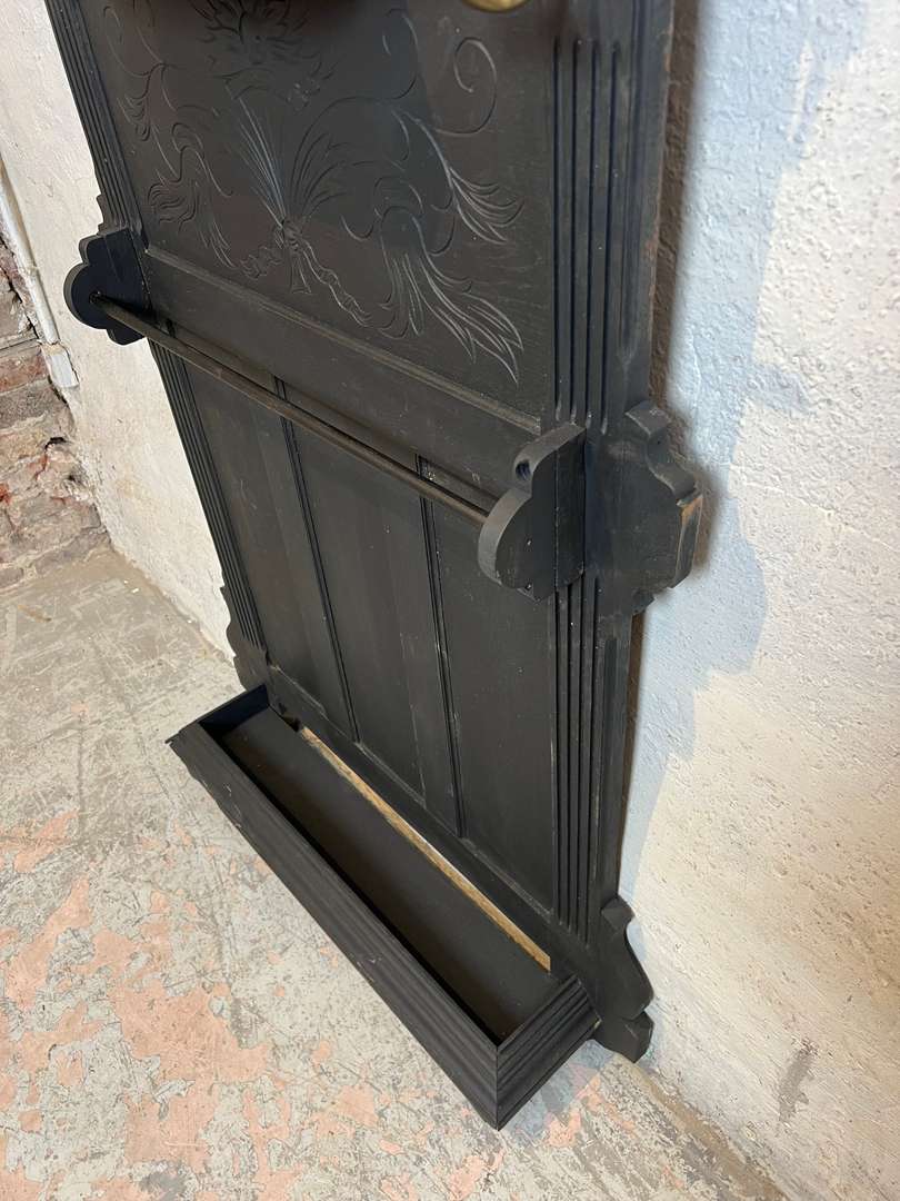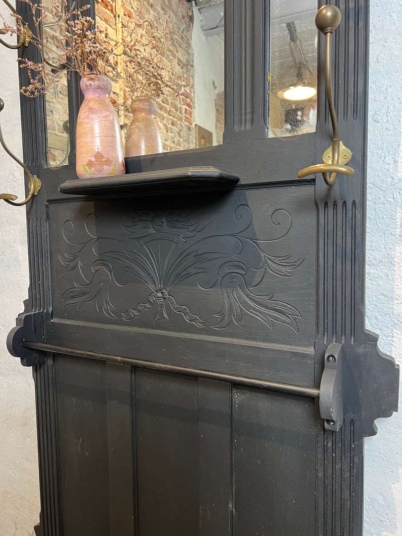 Ancien vestiaire mural en bois sculpté, peint en noir mat. Il est composé de plusieurs patères en laiton, d’un miroir ancien à trois sections et d’une petite tablette centrale. De jolis détails sculptés ornent la partie basse, et une tringle permet d’y déposer un parapluie ou une canne. Un bel élément de caractère, parfait dans une entrée pour allier praticité et élégance.