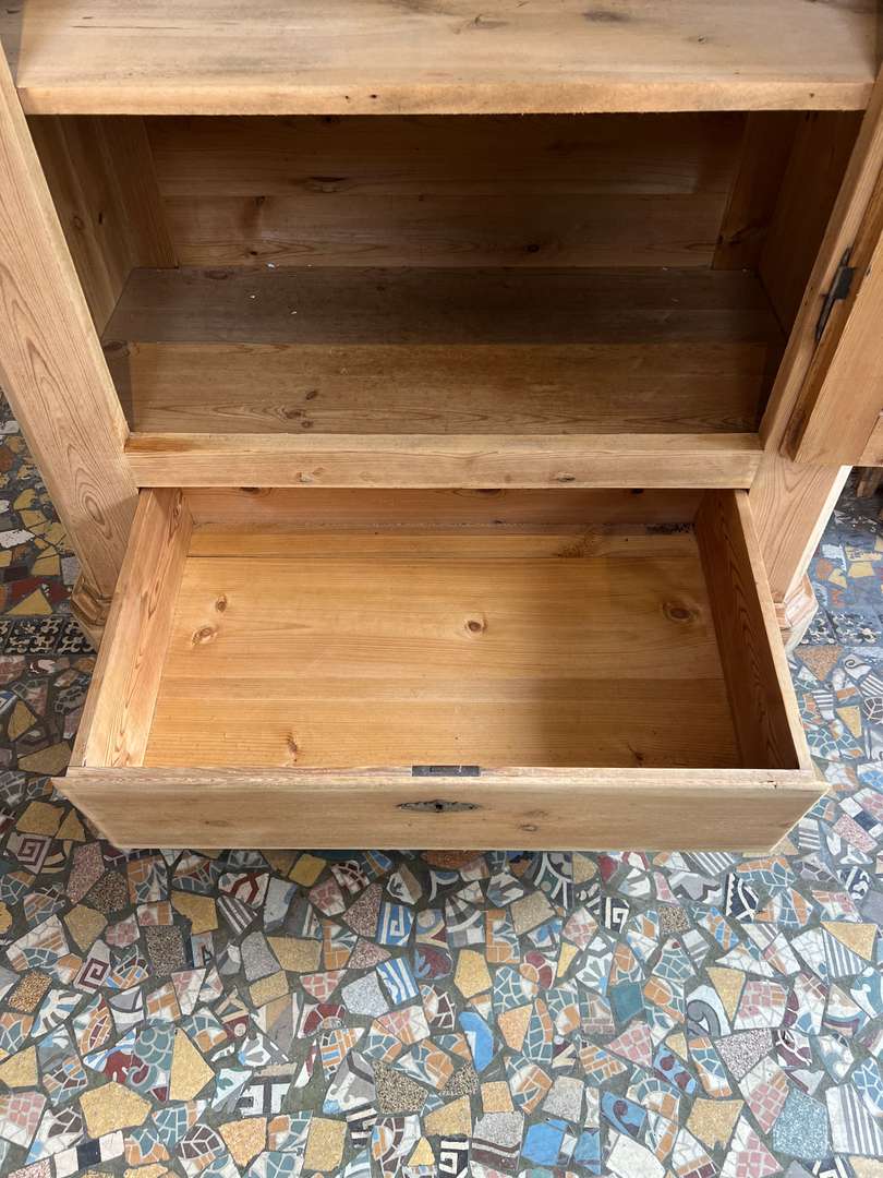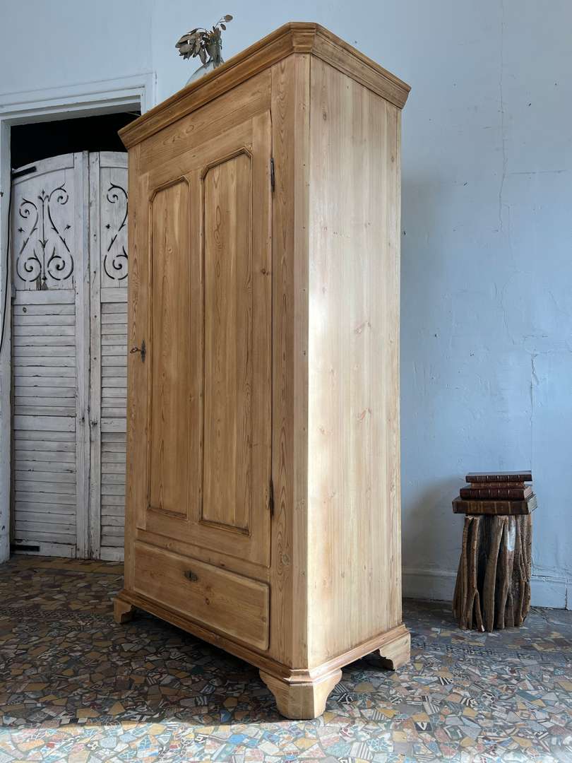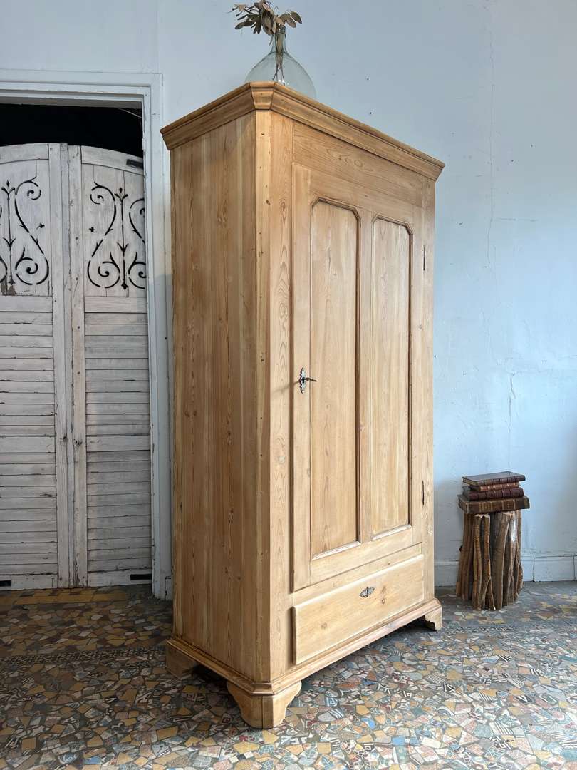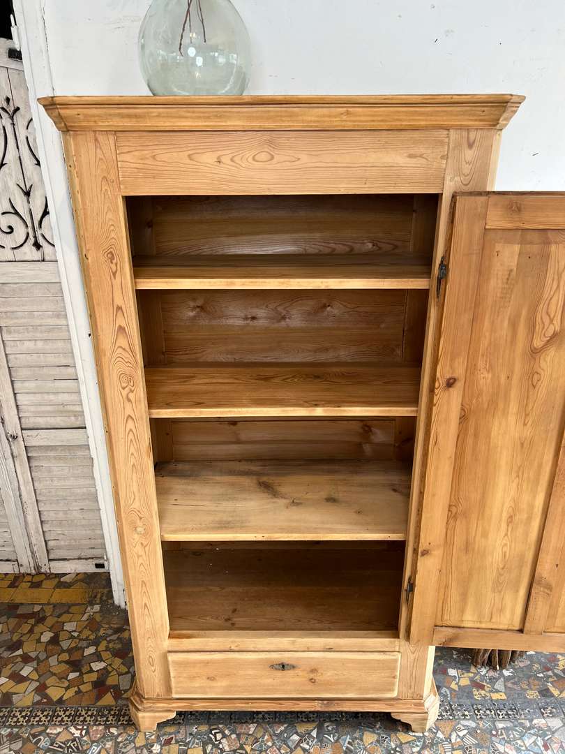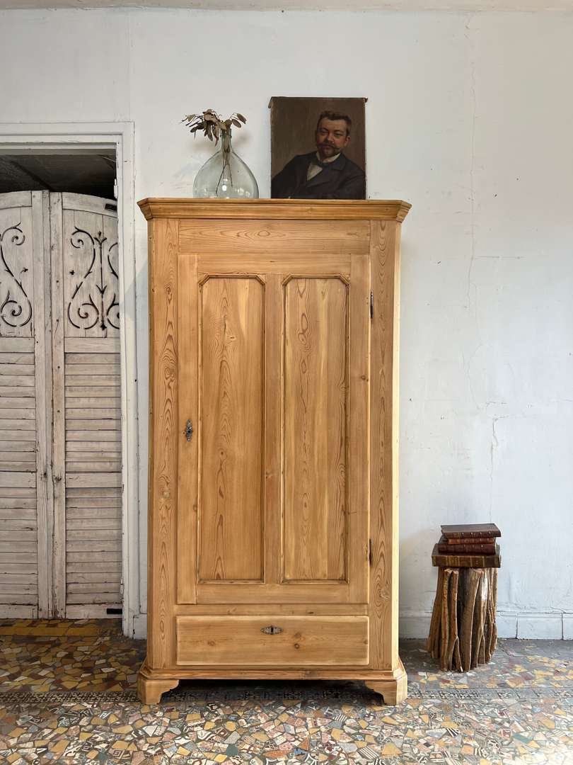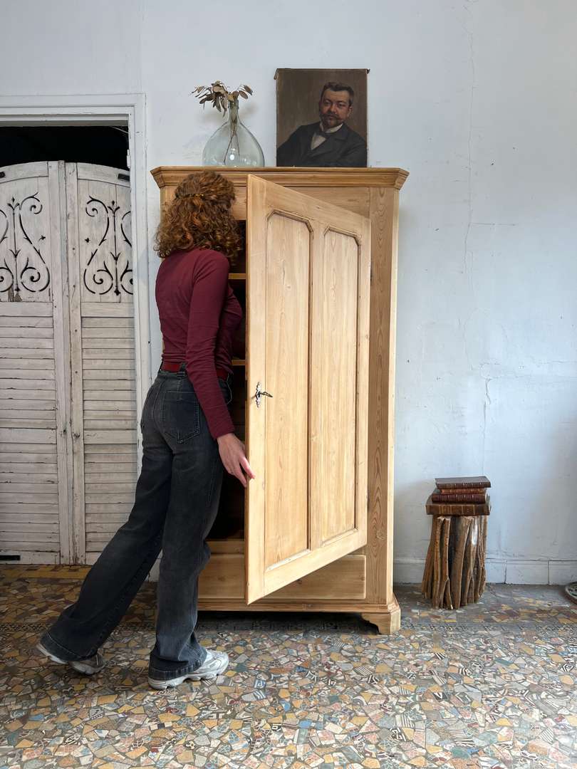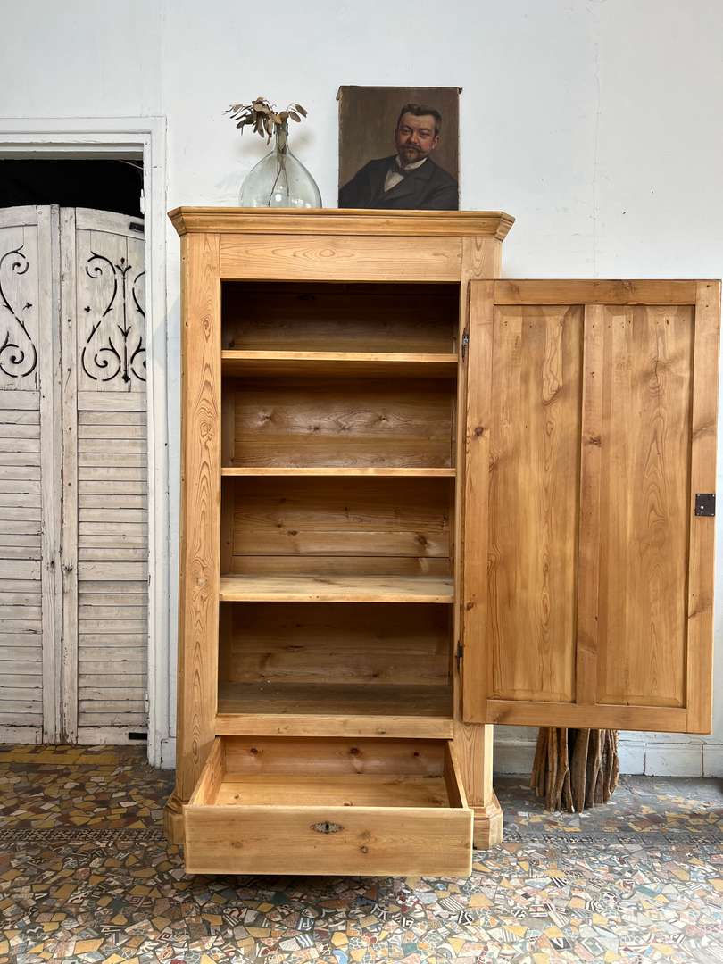 Ancienne bonnetière en sapin datant du début du XXe siècle. Elle dispose d’une porte pleine et d’un grand tiroir en partie basse. L’intérieur est aménagé avec plusieurs étagères fixes, offrant une belle capacité de rangement. Son bois clair et sa ligne sobre lui permettent de s’intégrer facilement dans tous les intérieurs.