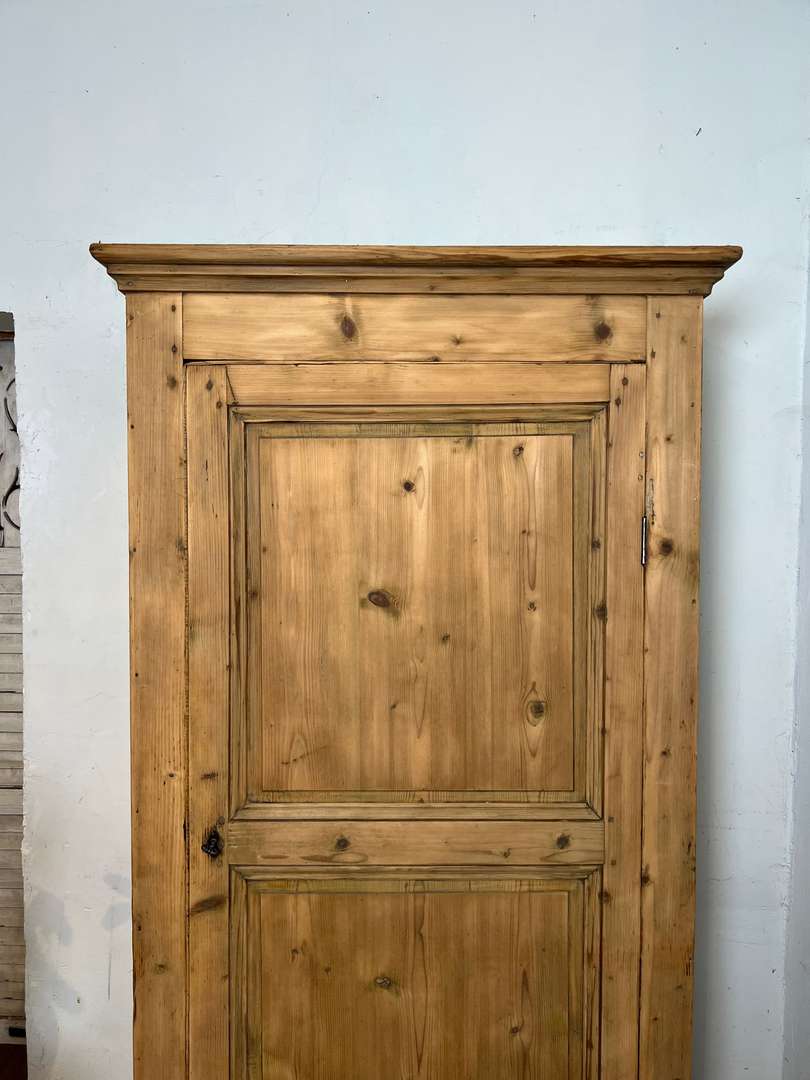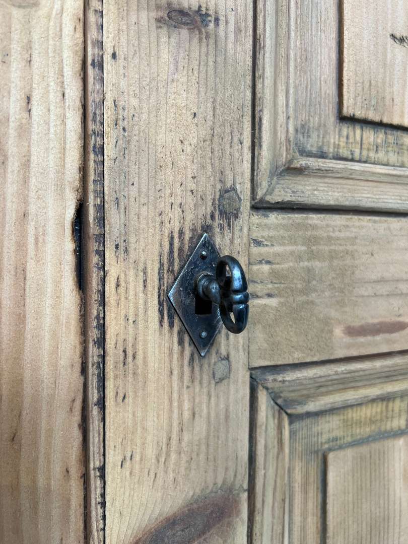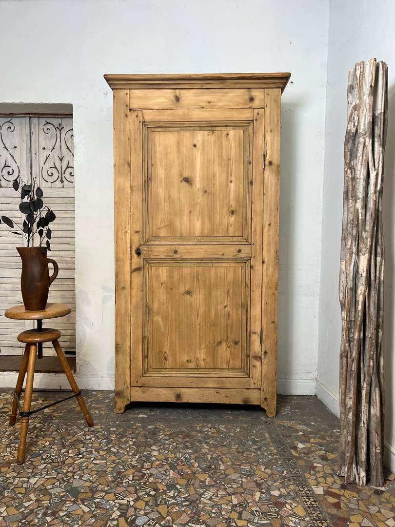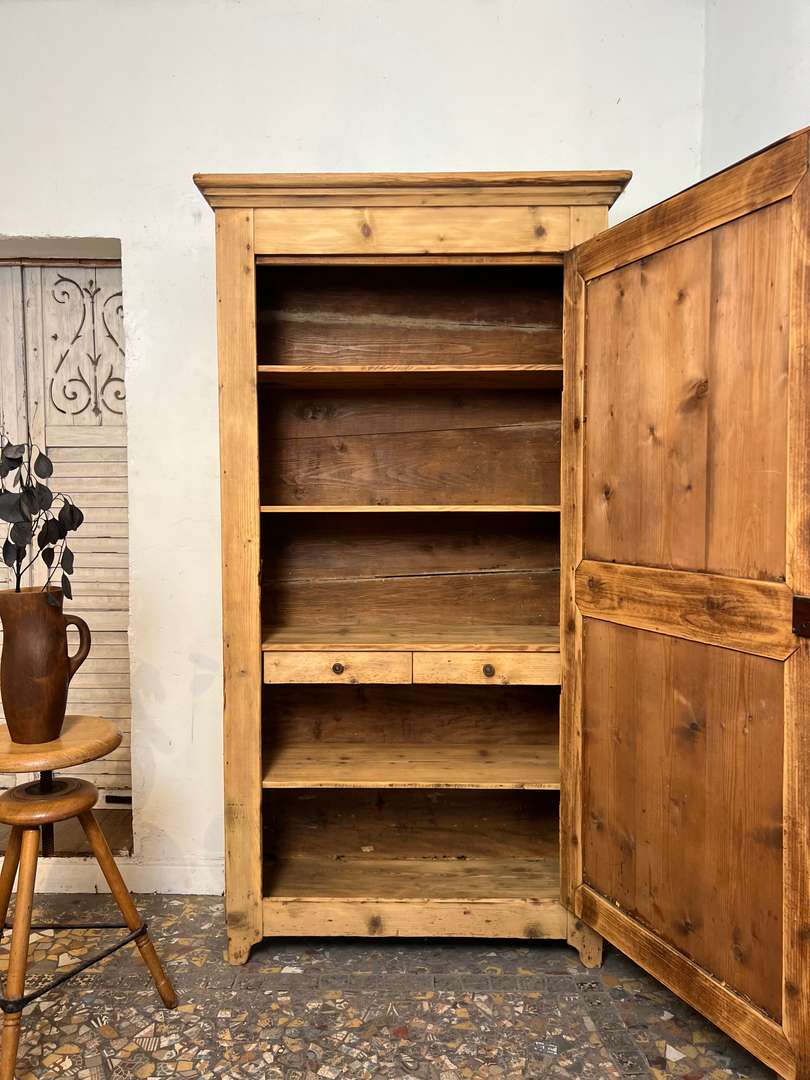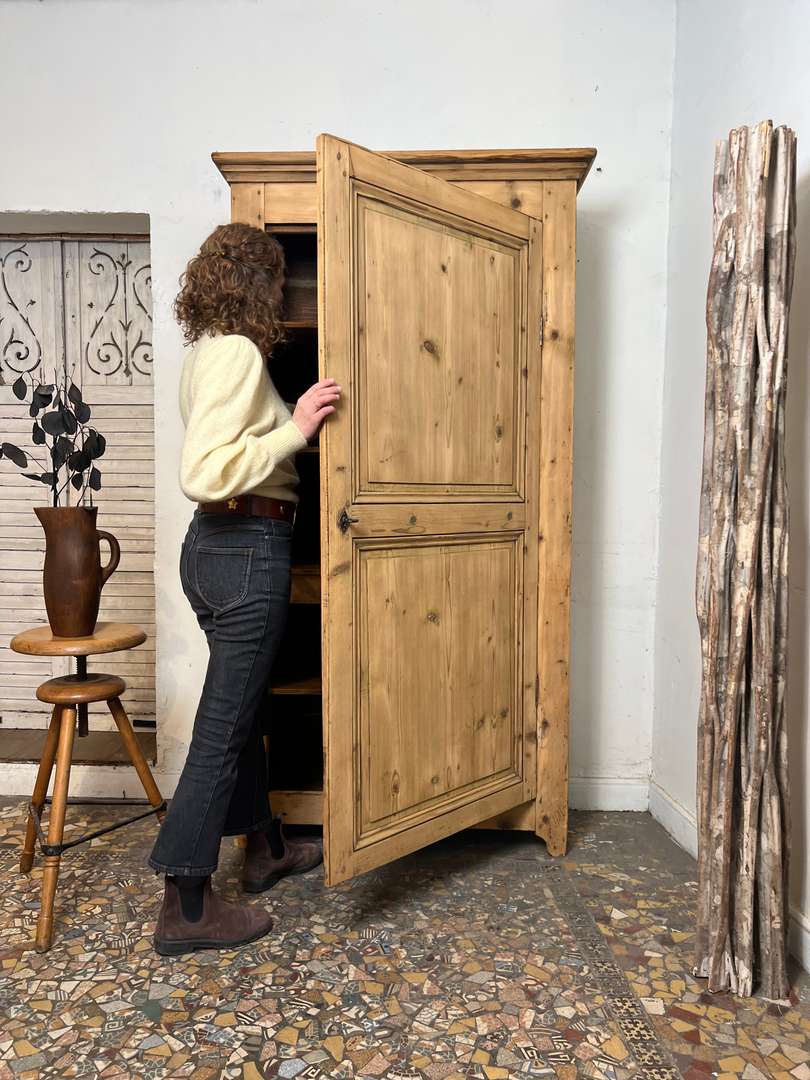 Charmante bonnetière en sapin du début du XXᵉ siècle, laissée dans son bois brut. Elle offre plusieurs étagères et deux petits tiroirs intérieurs pratiques. La porte ferme correctement mais ne verrouille pas à clé. Un meuble simple et authentique, idéal pour du linge ou du rangement au quotidien.