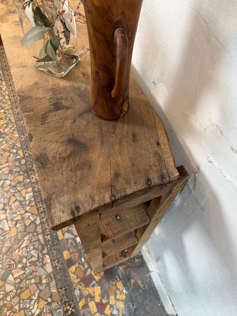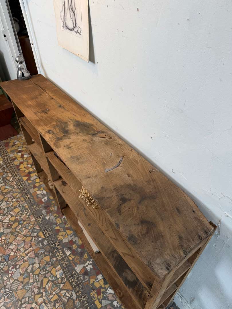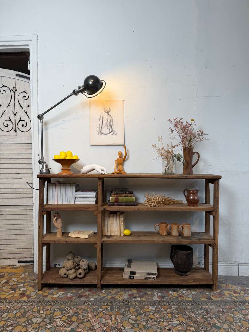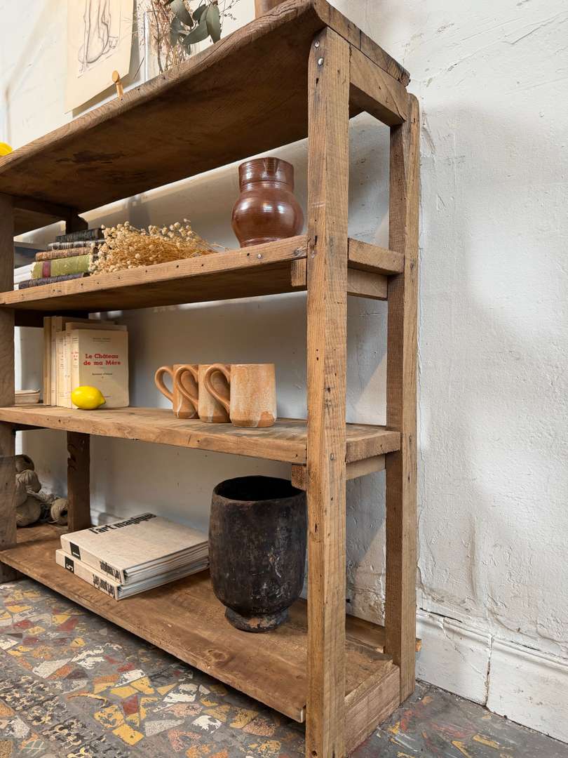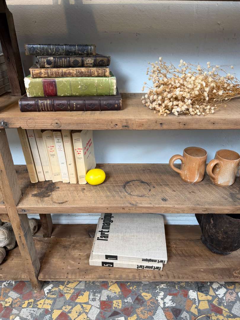 Ancienne étagère d’atelier 420 € Ajouter au panierAncienne étagère d’atelier en châtaignier et sapin. Belle patine du temps, bois marqué et authentique. Idéale en bibliothèque, meuble de rangement ou pour une décoration esprit atelier. #etagereAncienne #mobilierAtelier #boisAncienDimensionsLargeur152 cmProfondeur29.5 cmHauteur99 cmProfondeur des étagères25 cmHauteur des étagères24(2) + 32 cmRenseignementsRéférence2606015