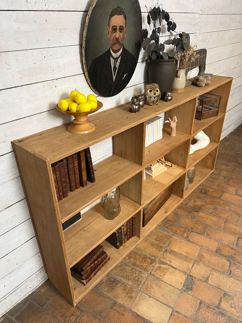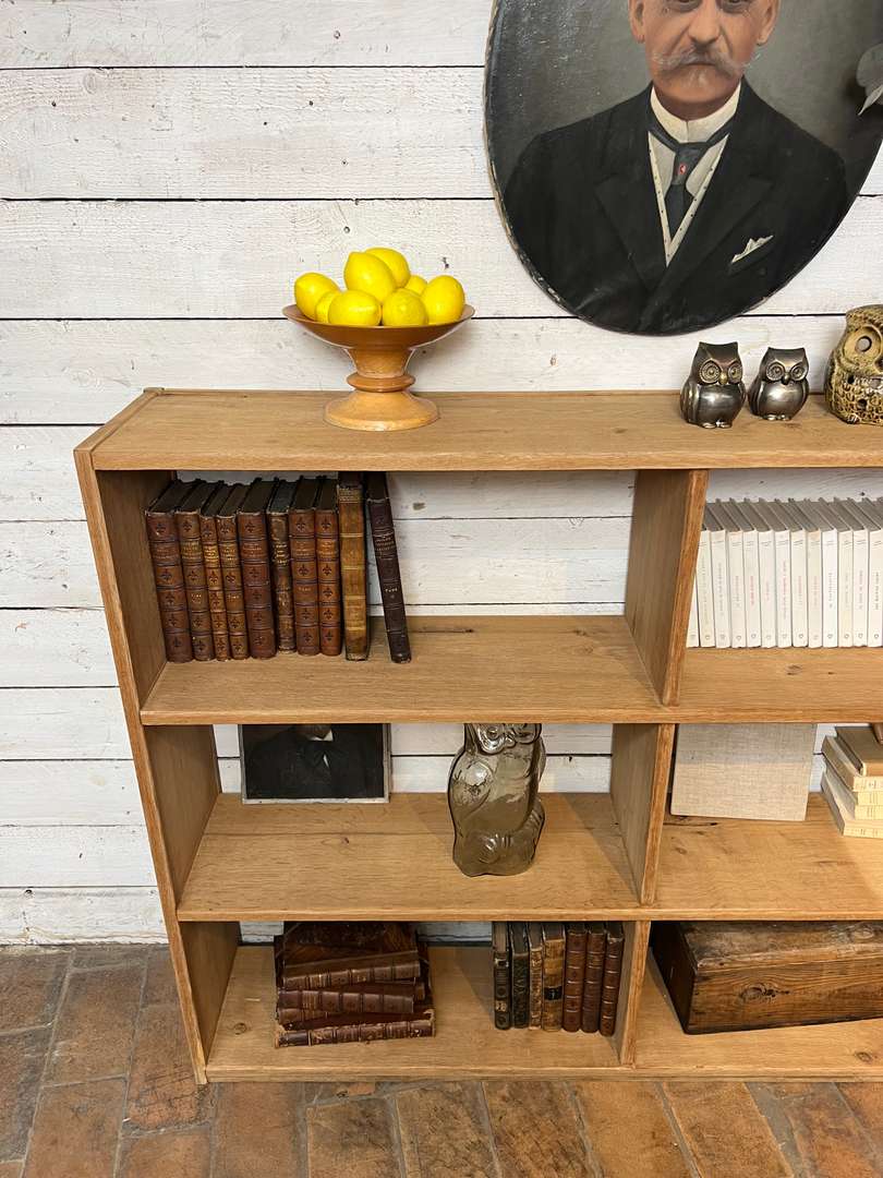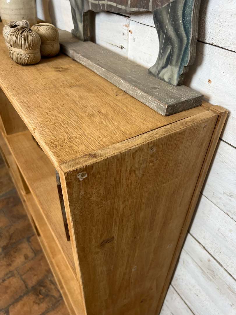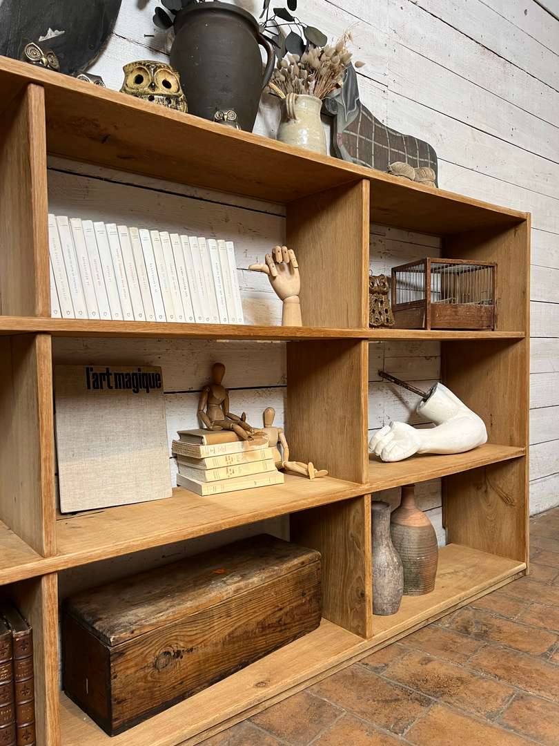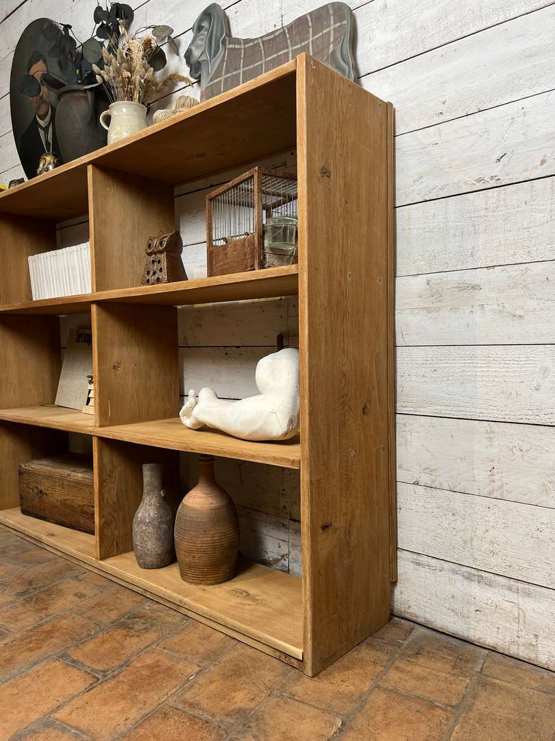 Étagère en chêne massif datant des années 50. Elle est composée de plusieurs casiers ouverts offrant de belles possibilités de rangement. Son design simple et fonctionnel lui permet de s’intégrer facilement dans toutes les pièces de la maison, que ce soit dans un salon, une chambre ou un bureau.