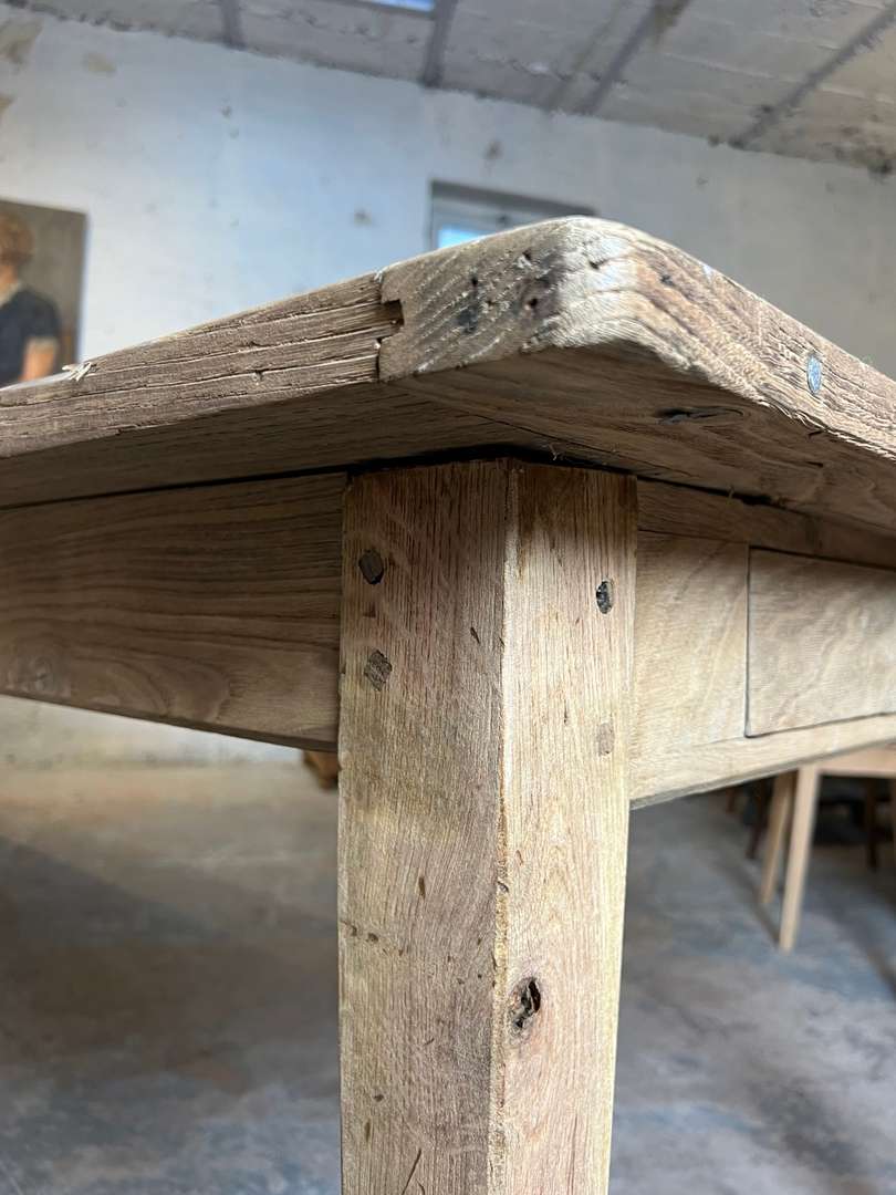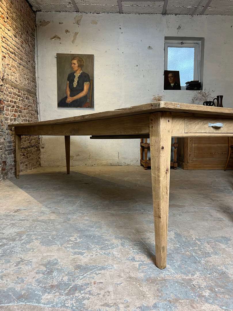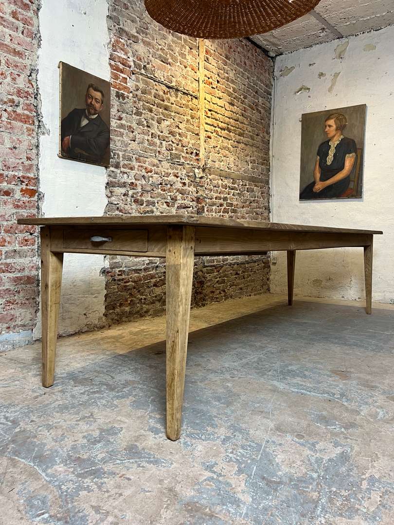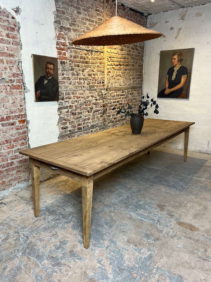 Superbe table ancienne en châtaignier, au format généreux, pouvant accueillir 12 à 14 personnes. Elle possède un tiroir en bout de table et un beau plateau en bois brut, pouvant être laissé tel quel ou recevoir la finition de votre choix. Une table authentique et conviviale, idéale pour les grandes tablées familiales ou pour un espace de réception.