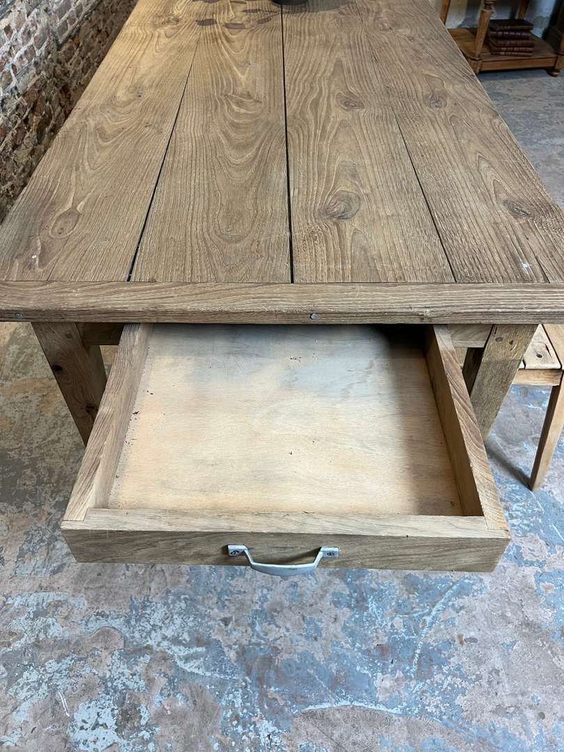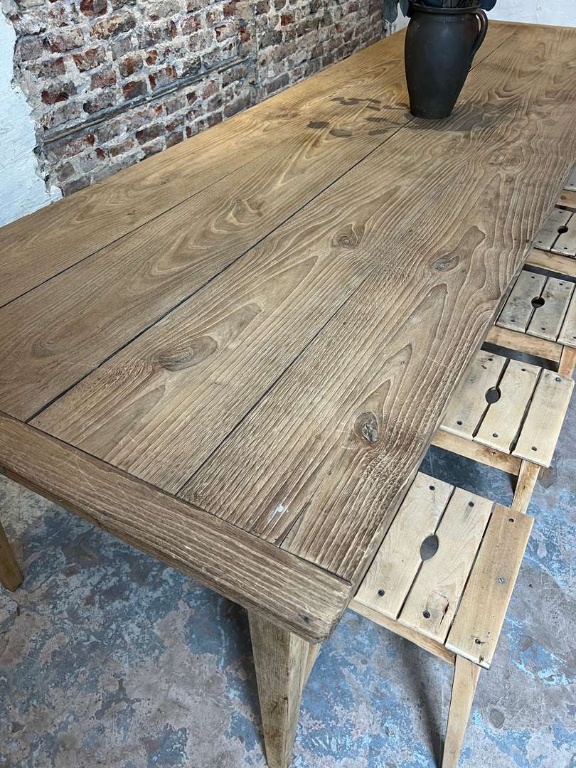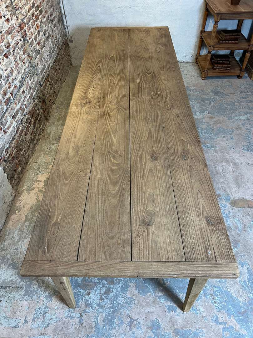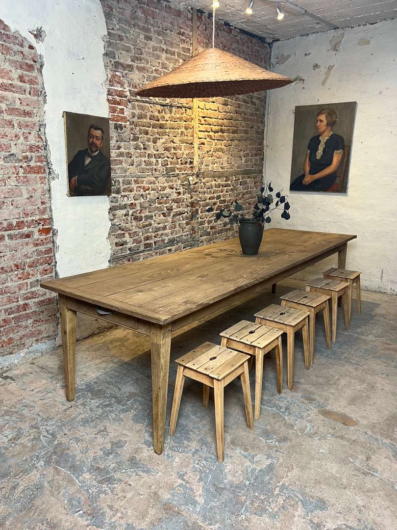 Superbe table ancienne en châtaignier, au format généreux, pouvant accueillir 12 à 14 personnes. Elle possède un tiroir en bout de table et un beau plateau en bois brut, pouvant être laissé tel quel ou recevoir la finition de votre choix. Une table authentique et conviviale, idéale pour les grandes tablées familiales ou pour un espace de réception.