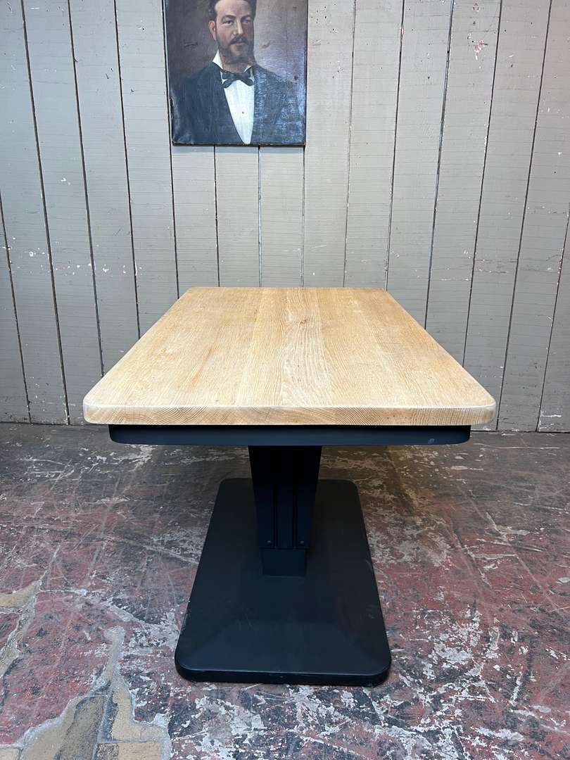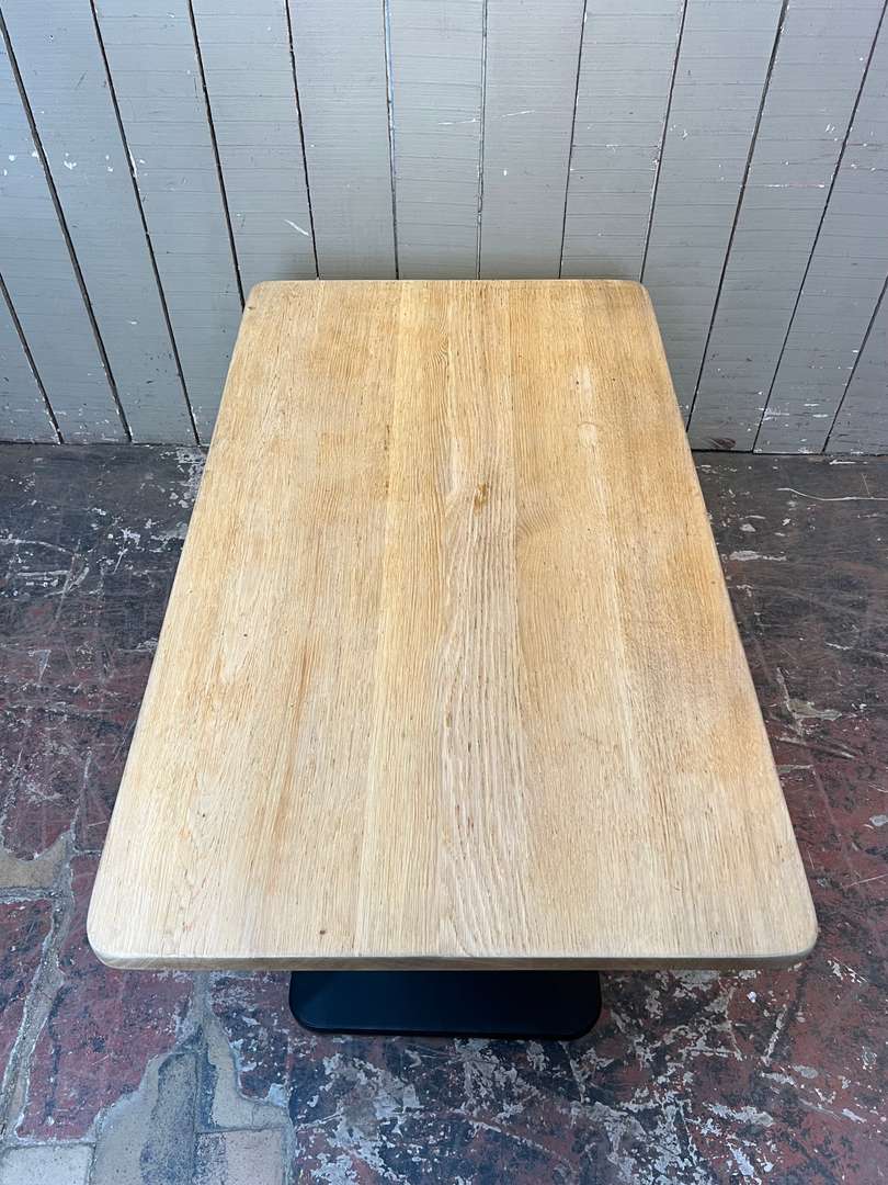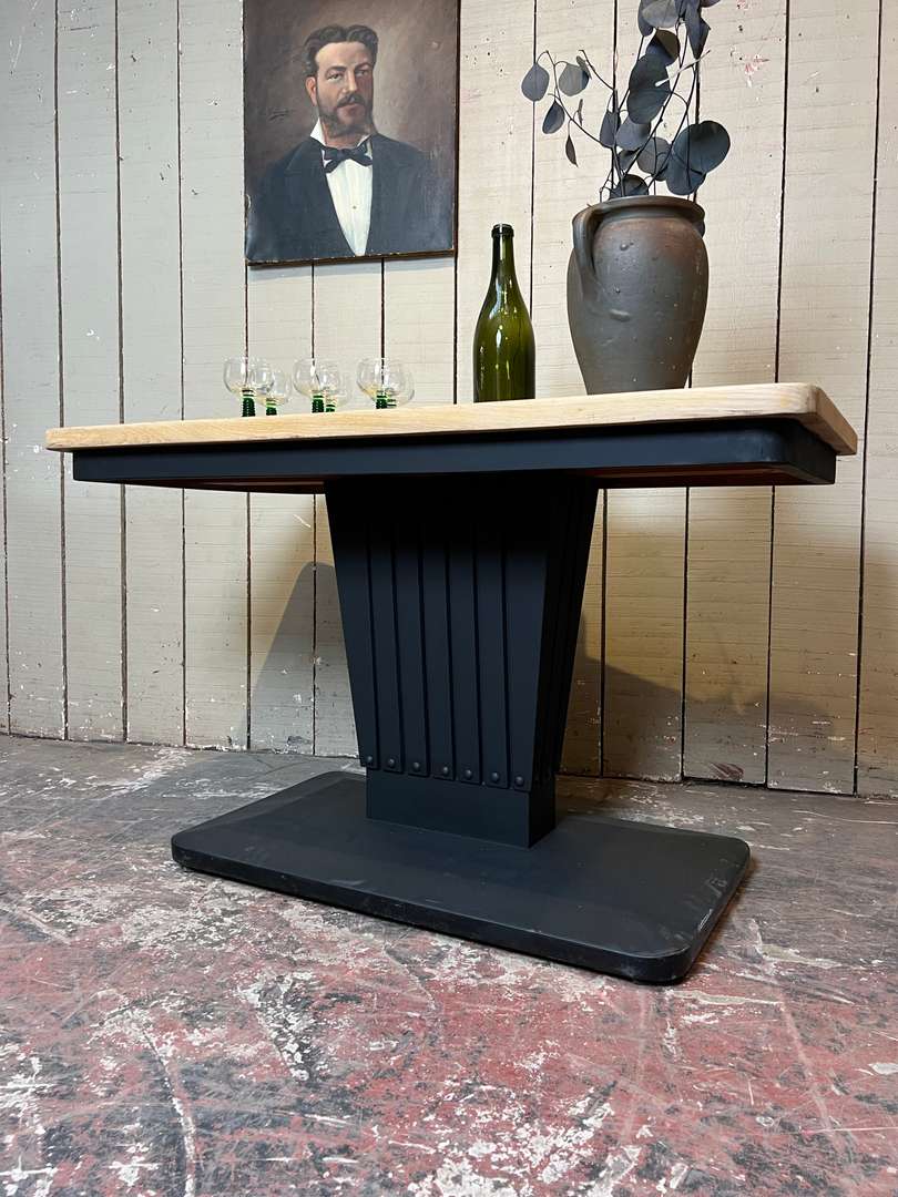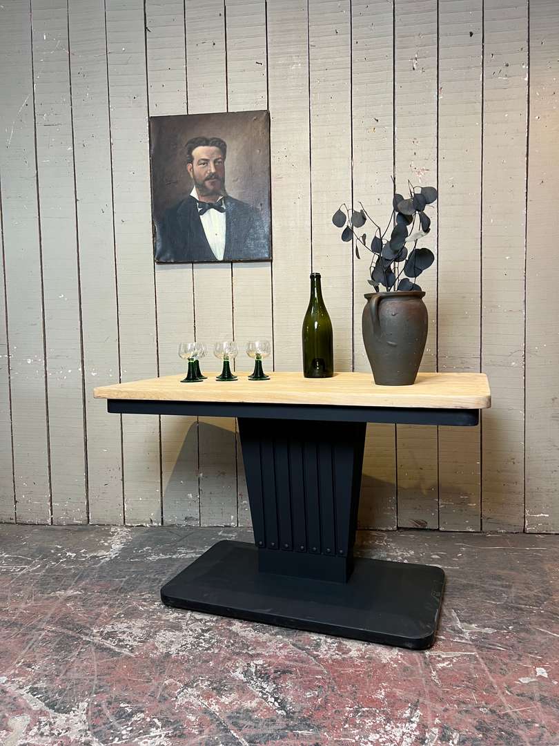 Ancienne table bistrot Art Déco 350 € Ajouter au panierAncienne table bistrot Art Déco avec un plateau en chêne brut et un piètement central peint en noir. Son format permet de l’utiliser comme console, petite table d’appoint ou encore table de cuisine. #tableartdeco #tablebistrot #tableancienne #mobiliervintage #consolebois #meubleauthentique #brocanteDimensionsLargeur120 cmProfondeur70 cmHauteur75 cmHauteur dessous bandeau67 cmRenseignementsRéférence2545020