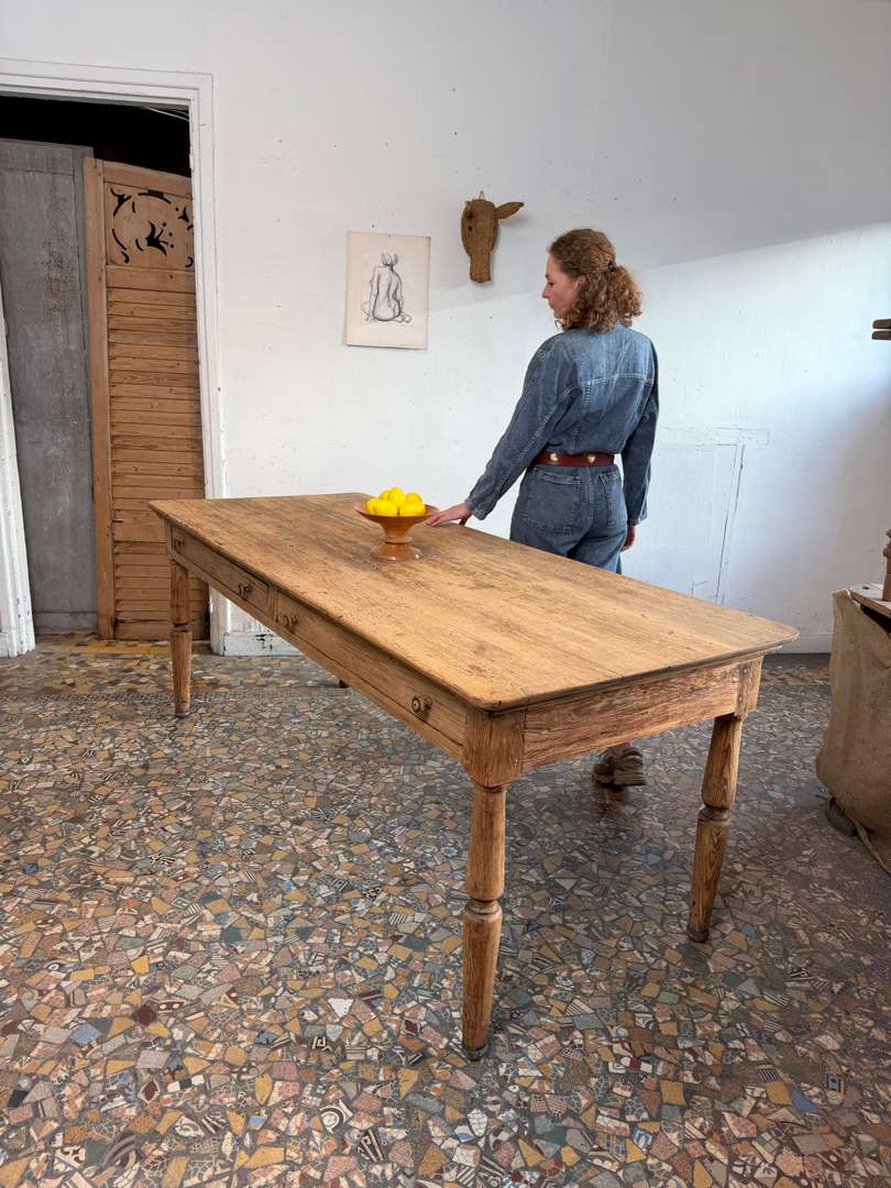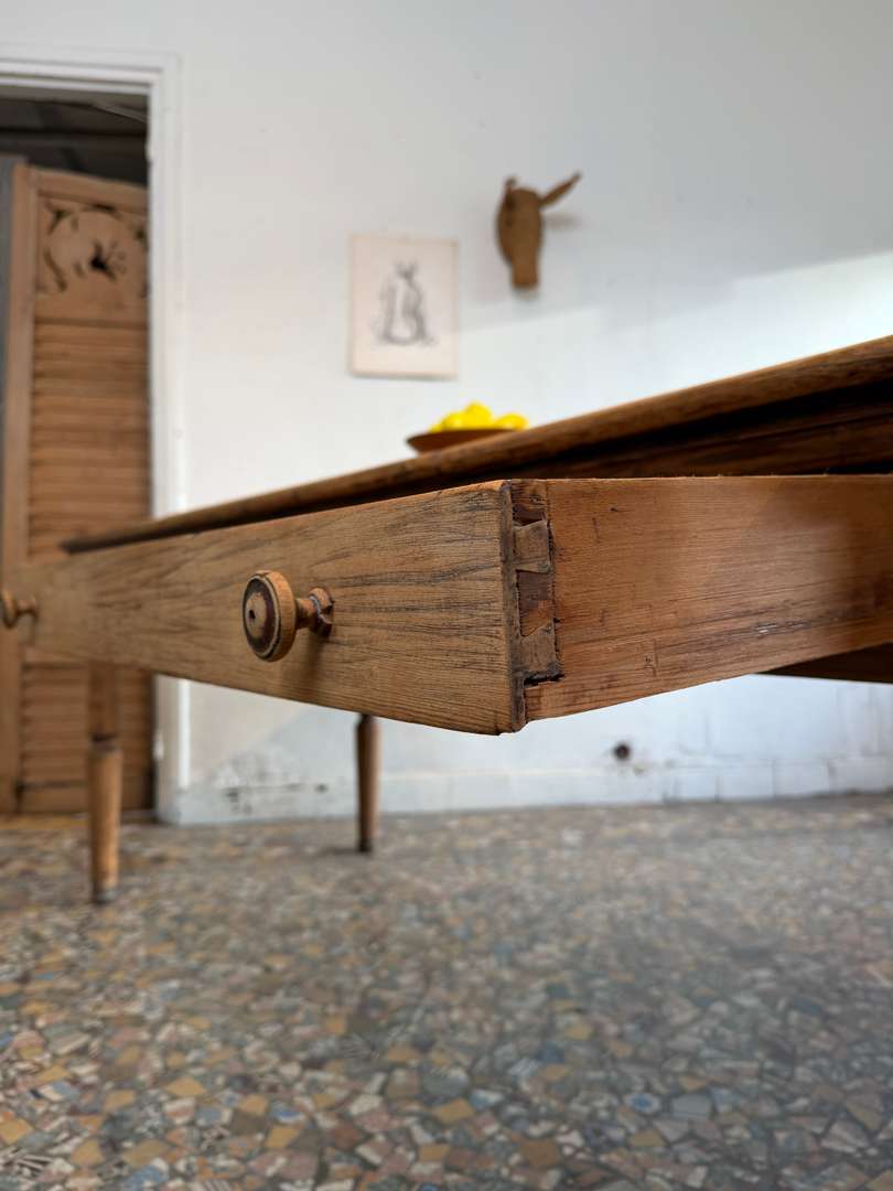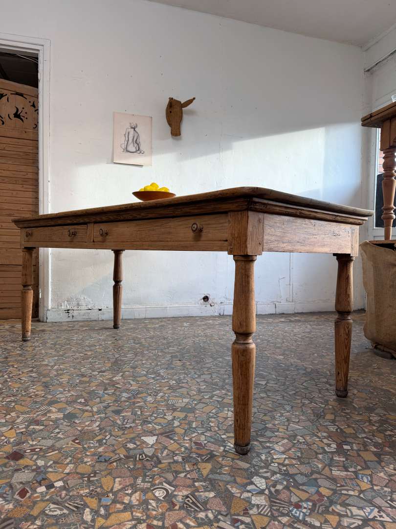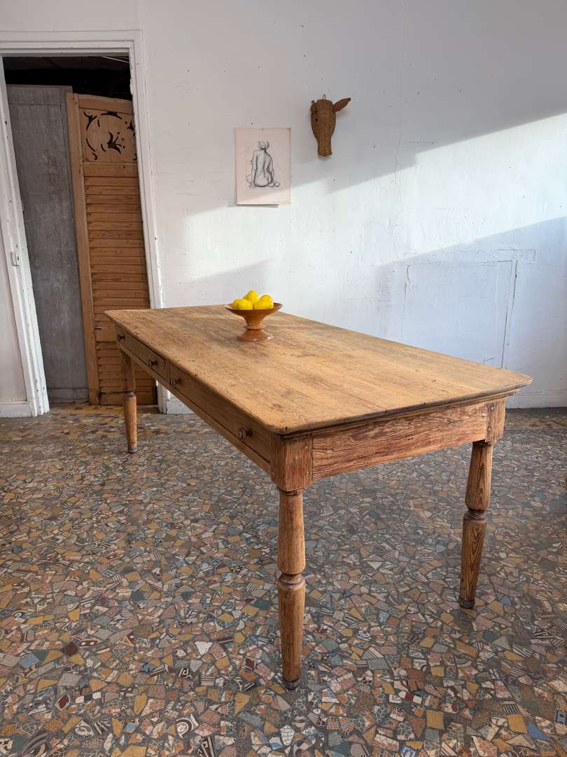 Beau plateau patiné par le temps avec bec de corbin sous le plateau. Deux grands tiroirs avec assemblages en queue d’aronde.