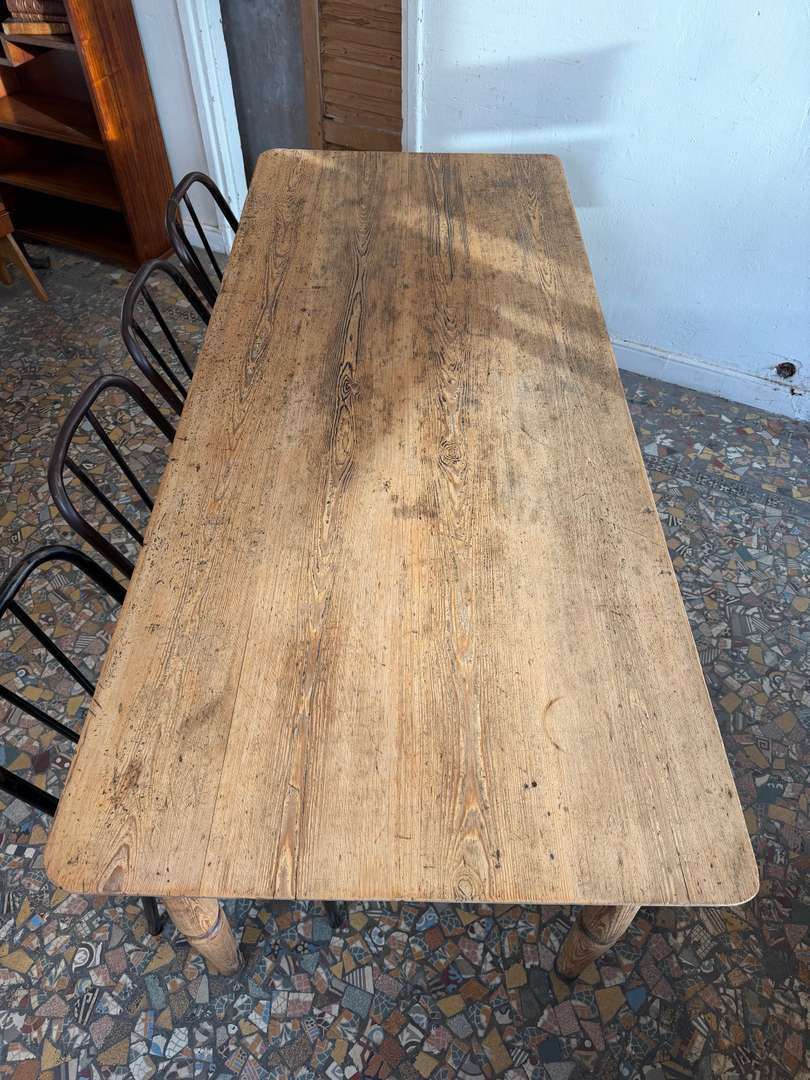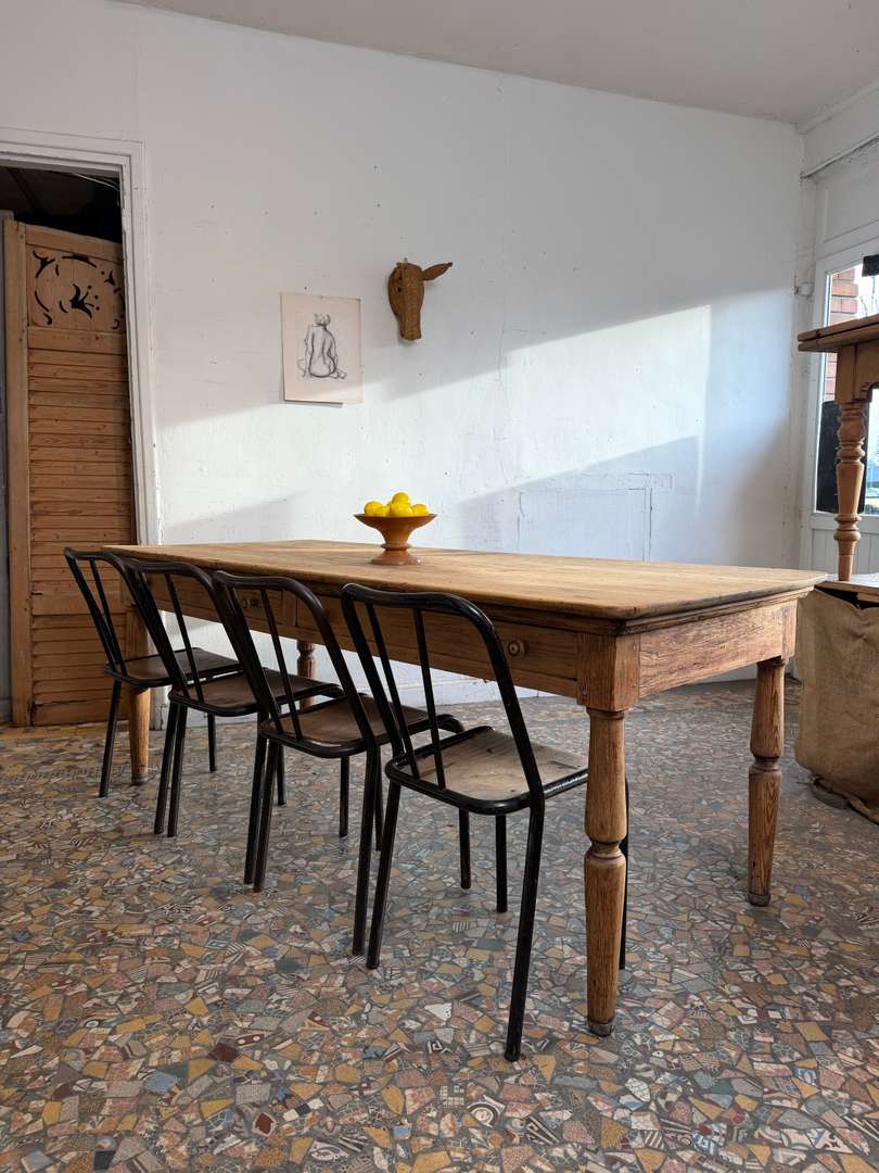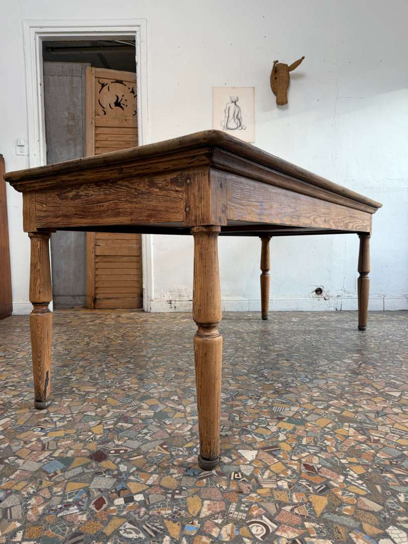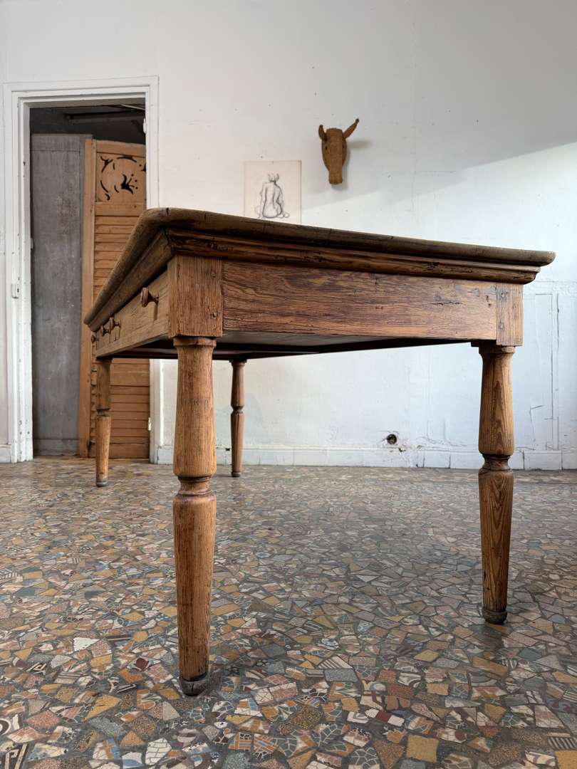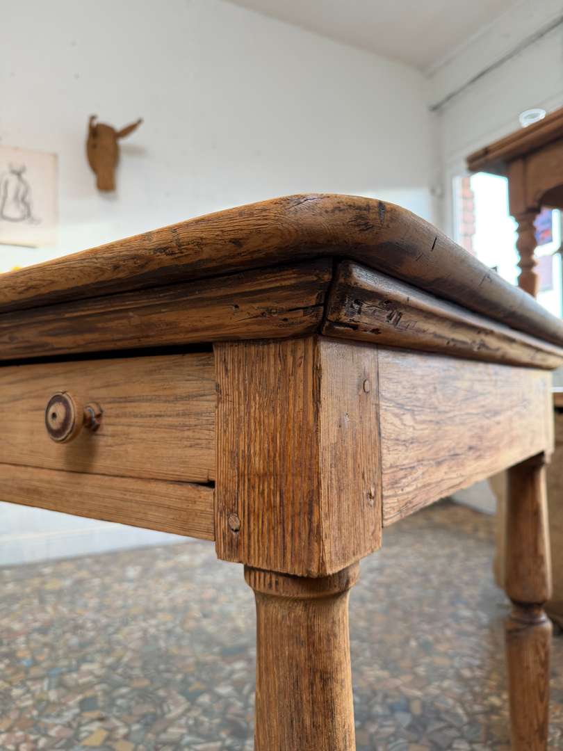 Beau plateau patiné par le temps avec bec de corbin sous le plateau. Deux grands tiroirs avec assemblages en queue d’aronde.