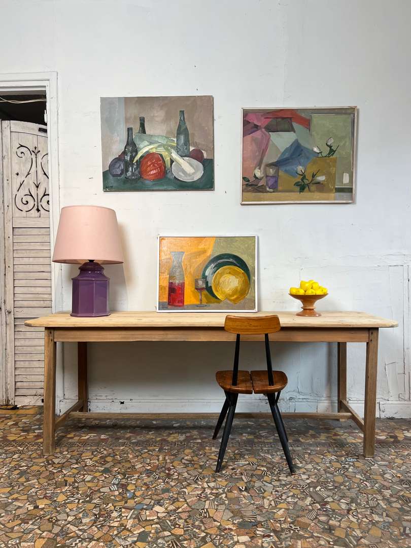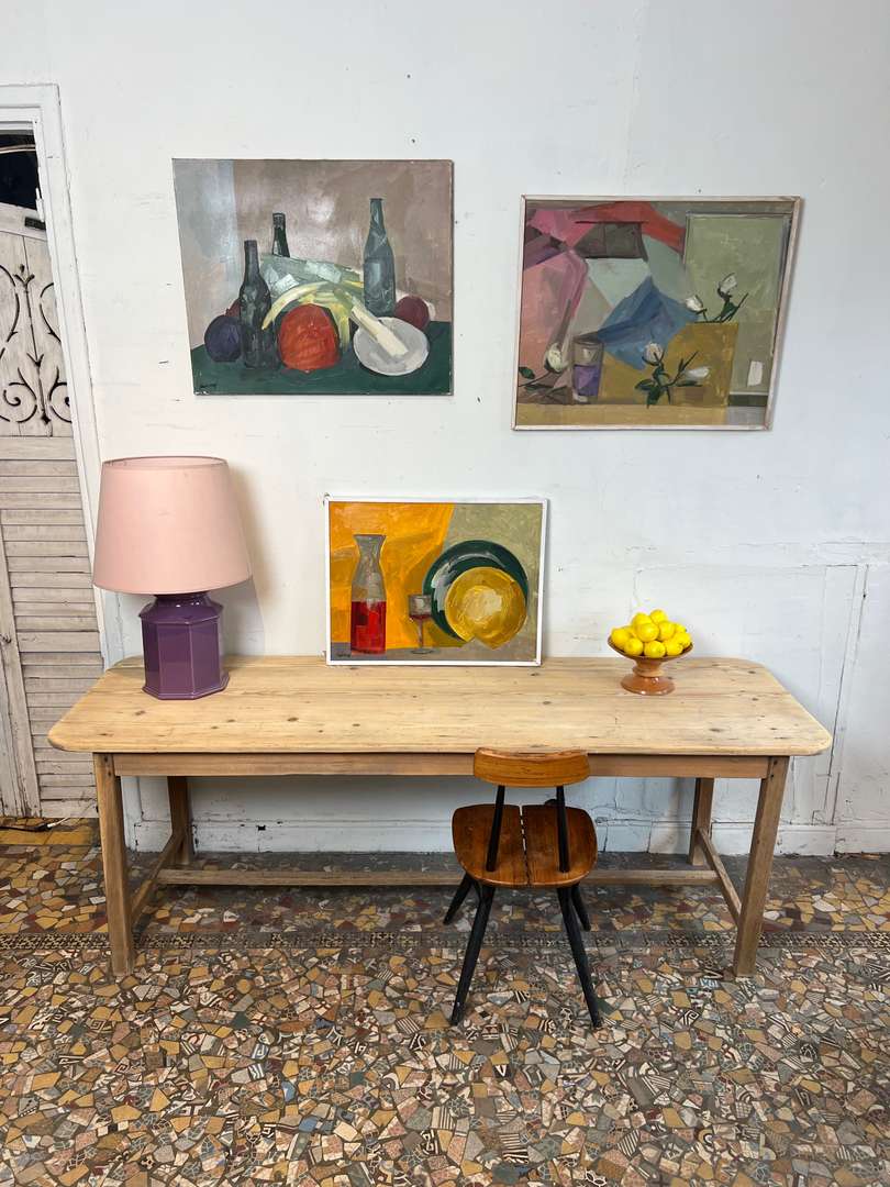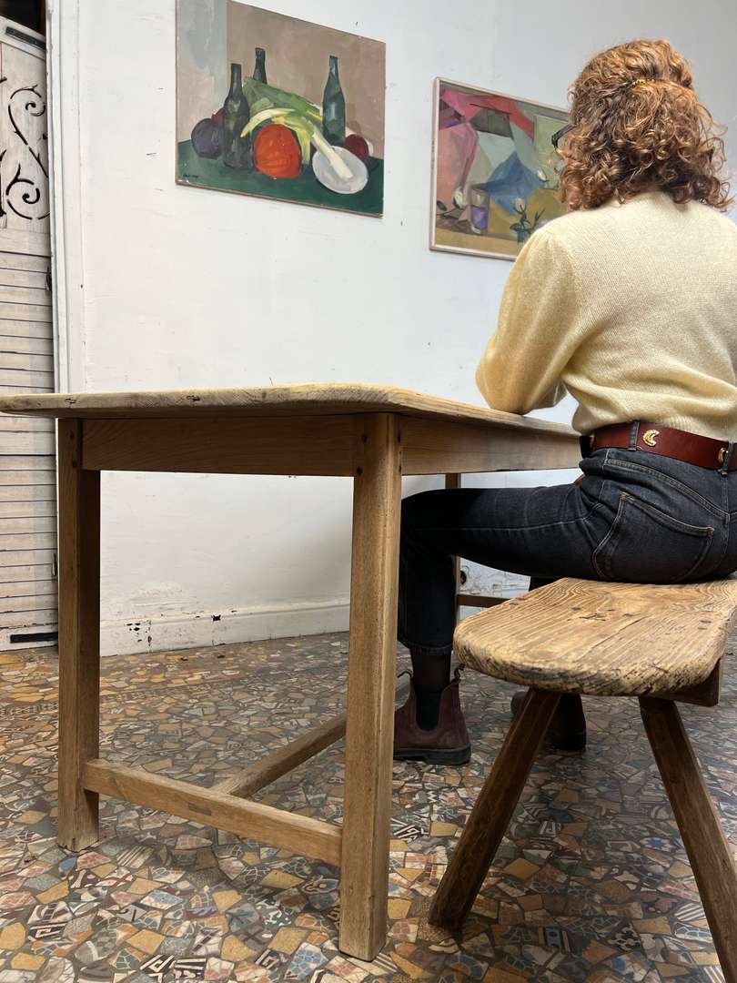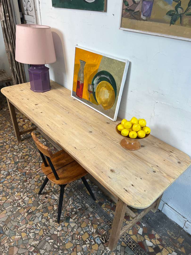 Table d’estaminet au format étroit, pratique en console, bureau ou table d’appoint. Le plateau est en sapin, avec une patine naturelle et de jolis bords arrondis, tandis que le piètement est en chêne, solide et stable. Un meuble simple et authentique, facile à intégrer dans de nombreux intérieurs.