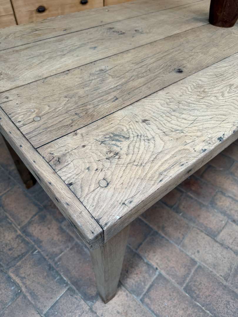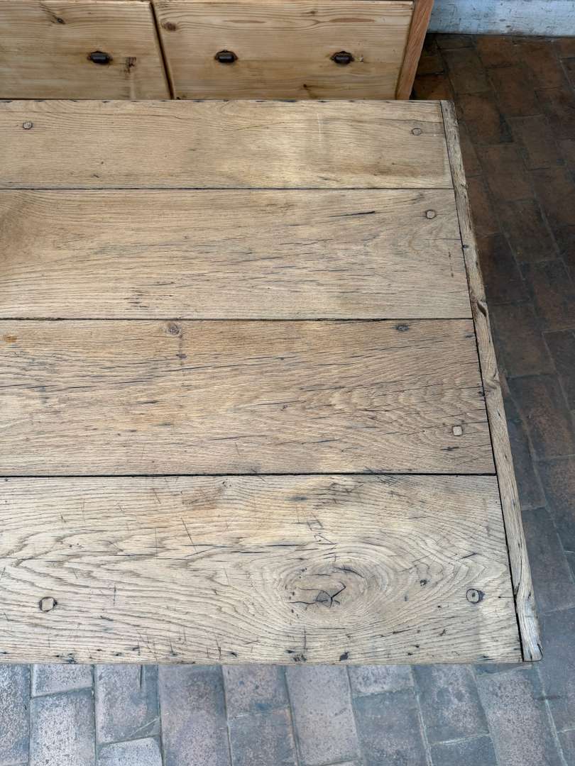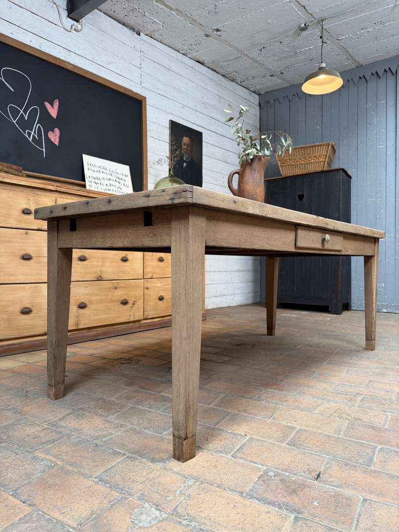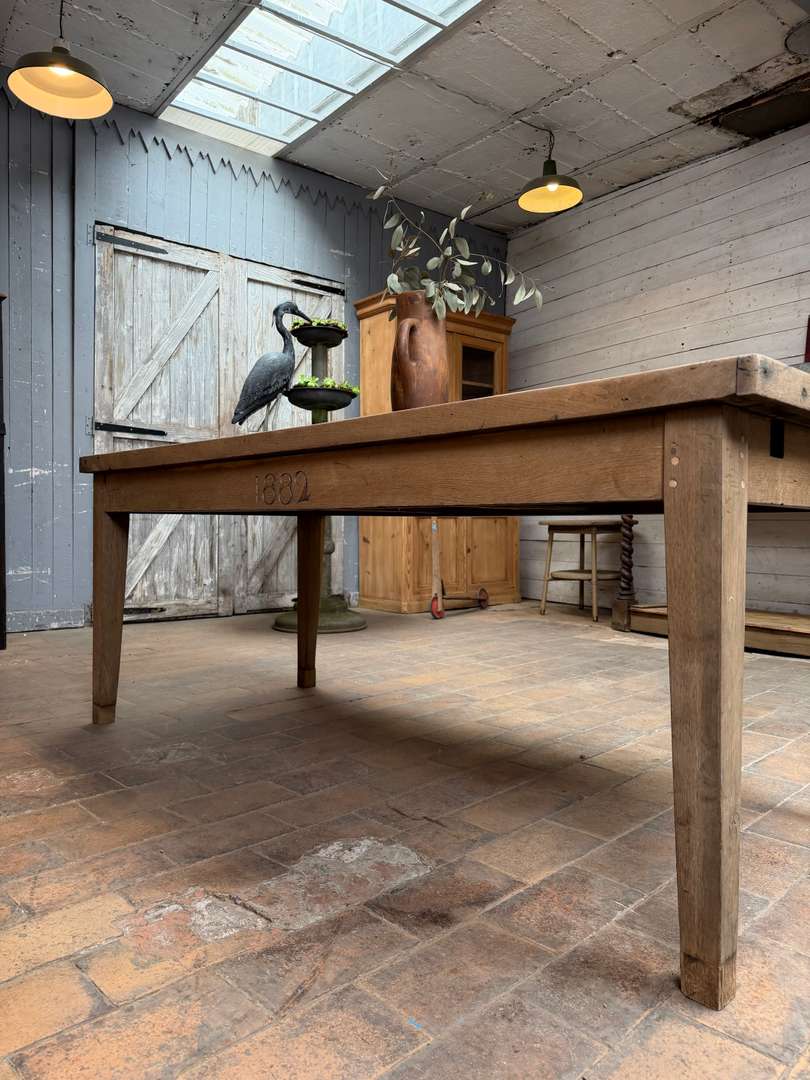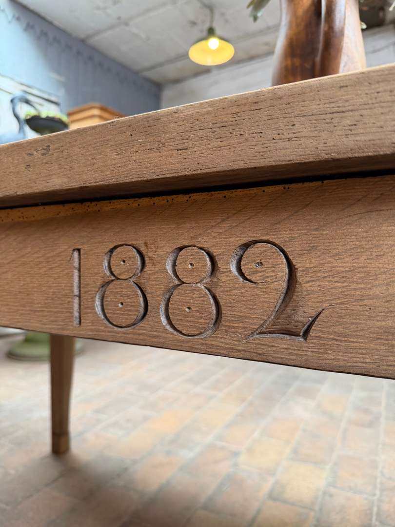 Ancienne table d’office en chêne avec plateau épais en bois massif. Date 1882 gravée en façade.