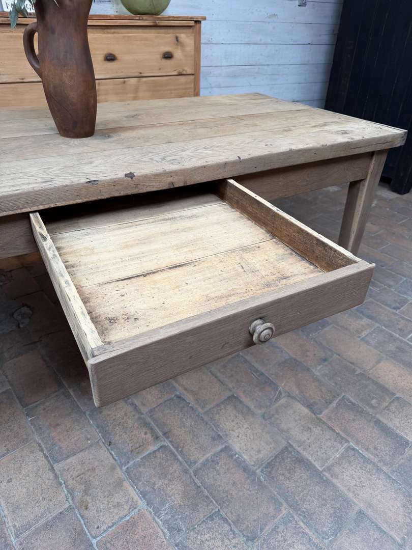 Table rehaussée permettant une meilleure aisance au niveau des jambes. Un tiroir central fonctionnel.