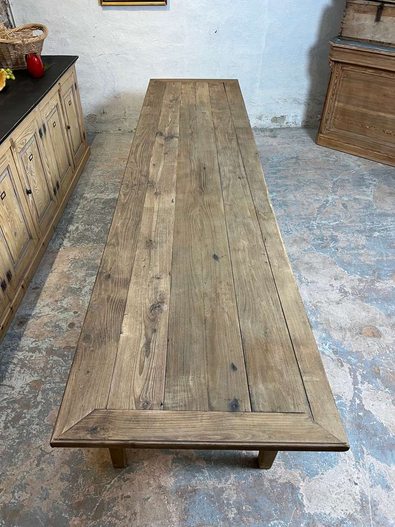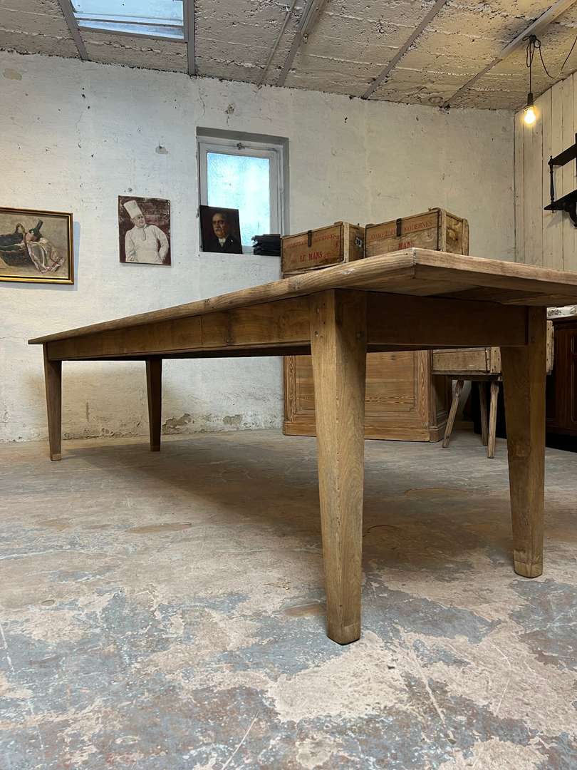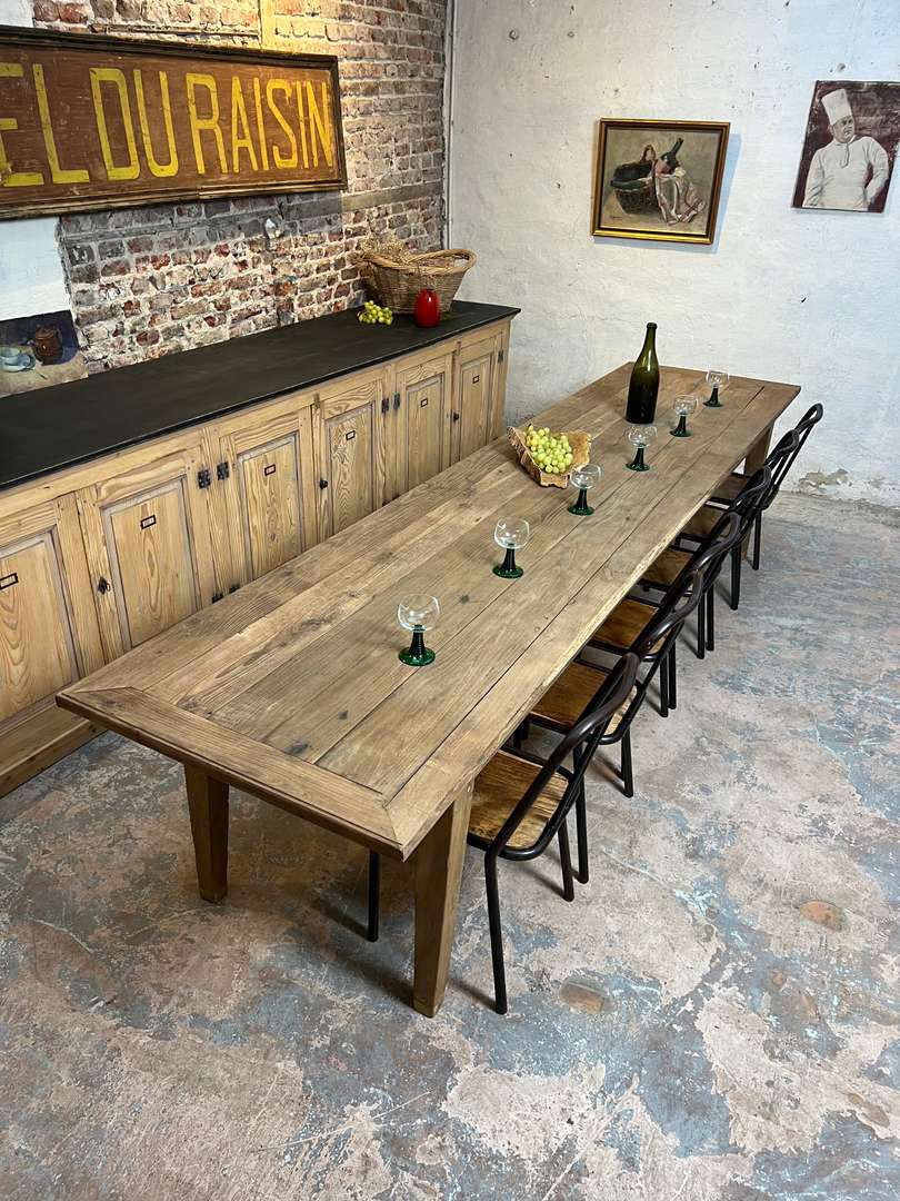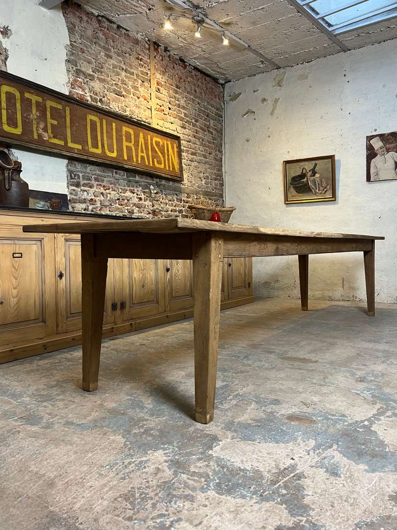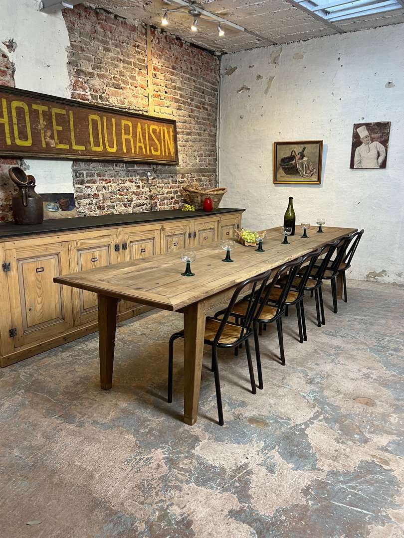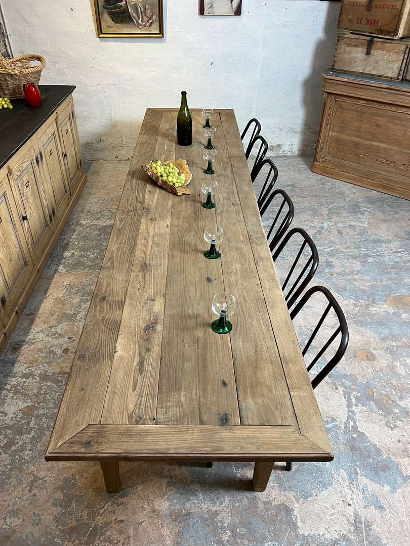 Très grande table de ferme en châtaignier datant du XIXᵉ siècle. Son long plateau en bois massif lui permet d’accueillir confortablement jusqu’à 14 personnes. Une table authentique, chaleureuse et idéale pour les grandes tablées familiales.