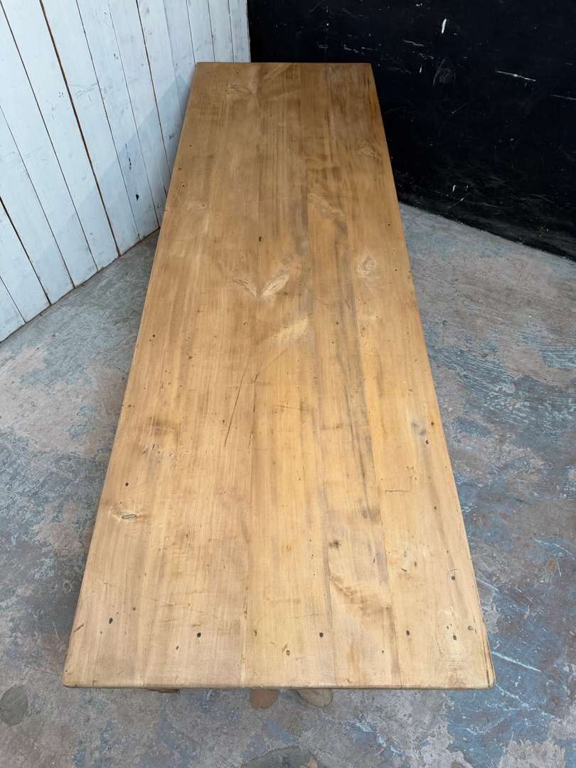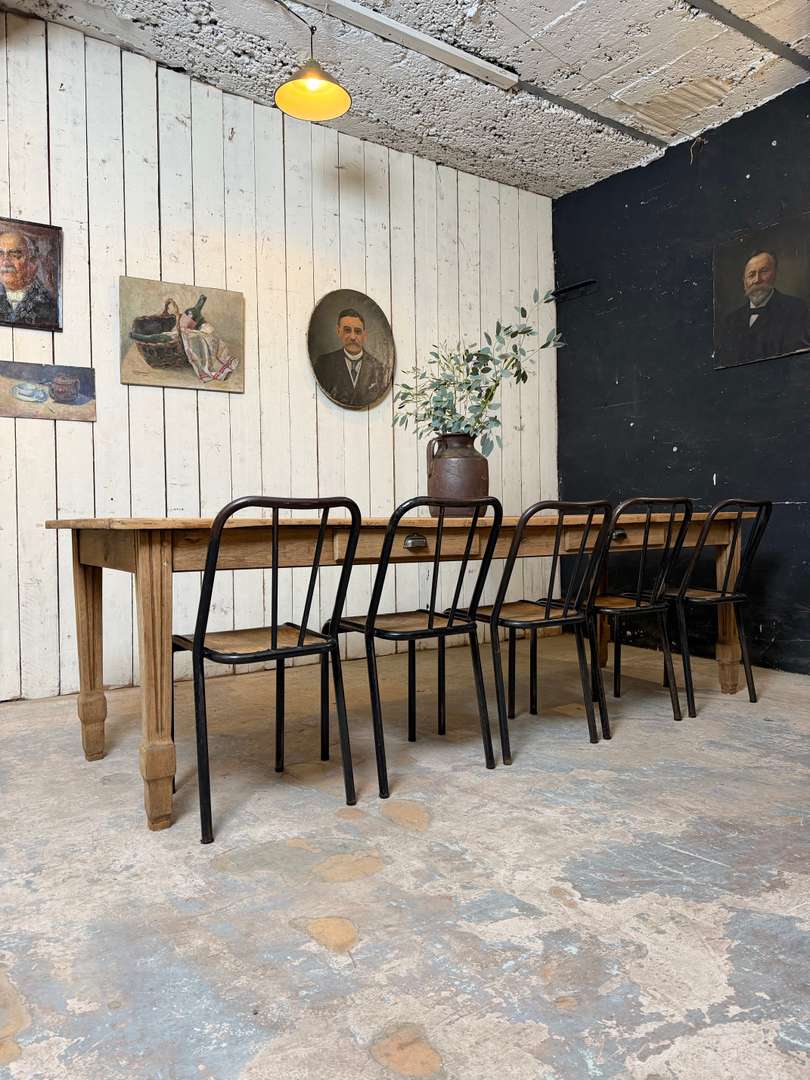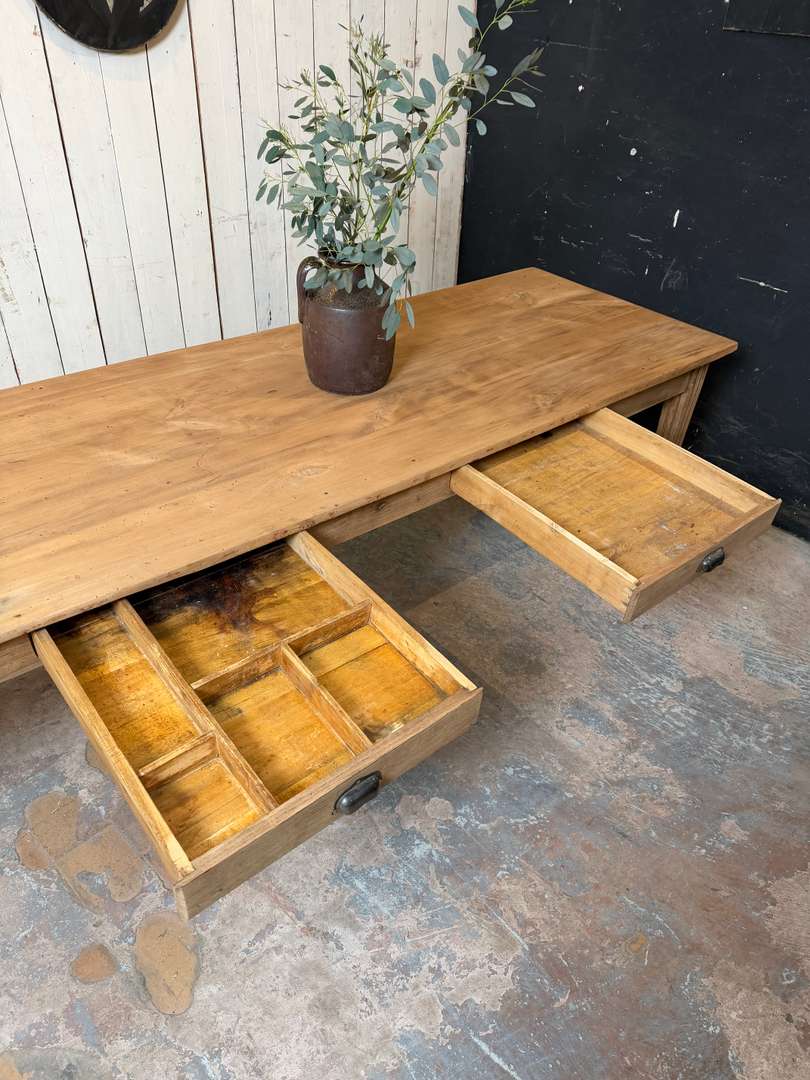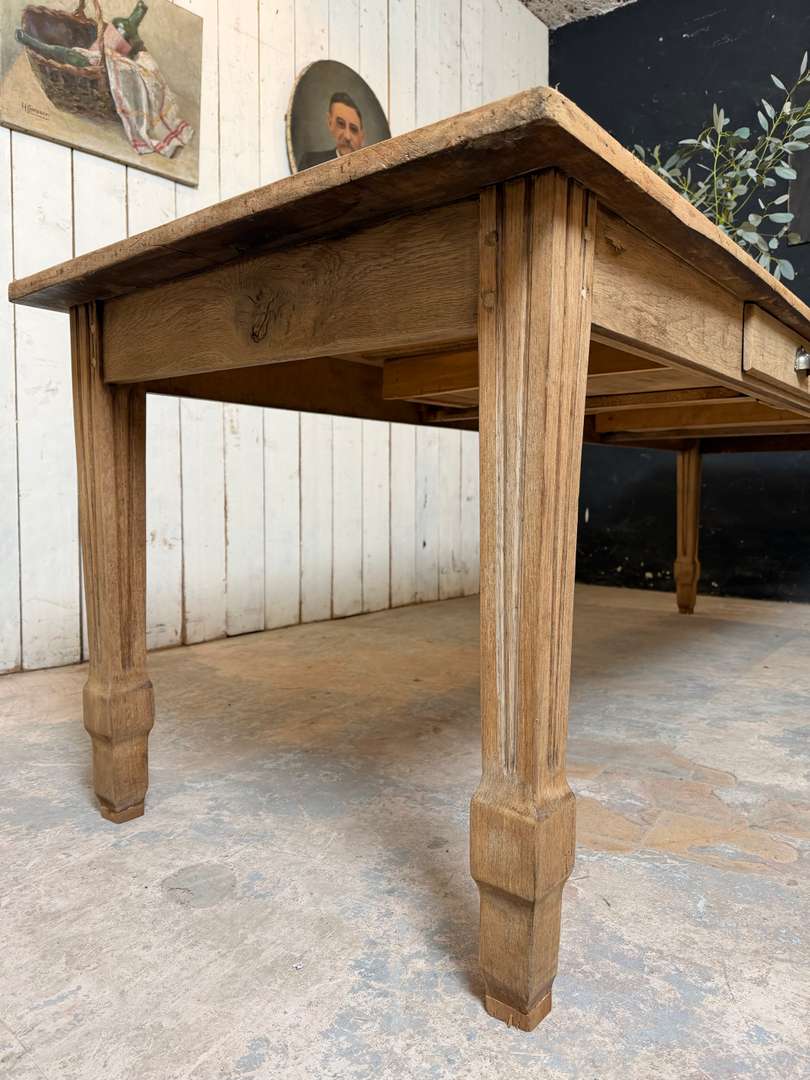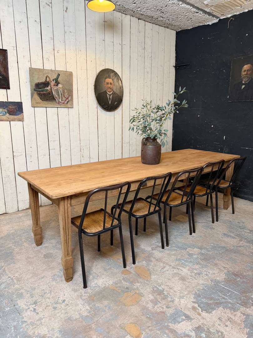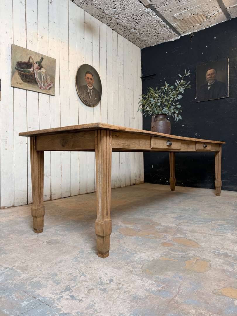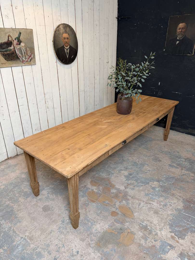 Ancienne table XIXème 1400 € Ajouter au panierAncienne table XIXème. Plateau en peuplier brut et piètement en chêne, pouvant être laissée telle quelle ou recevoir la finition de votre choix. Deux tiroirs, peut accueillir 10 à 12 personnes. #tableancienne #styledirectoire #table19eme #mobilierancien #brocante #grandetableDimensionsLargeur260 cmProfondeur82.5 cmHauteur76 cmHauteur dessous bandeau63 cmRenseignementsRéférence2602013