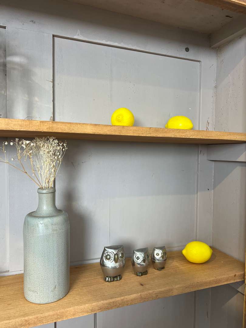 L’intérieur est peint en gris, ce qui met parfaitement en valeur les objets exposés. Elle dispose de trois étagères et se suspend facilement au mur.